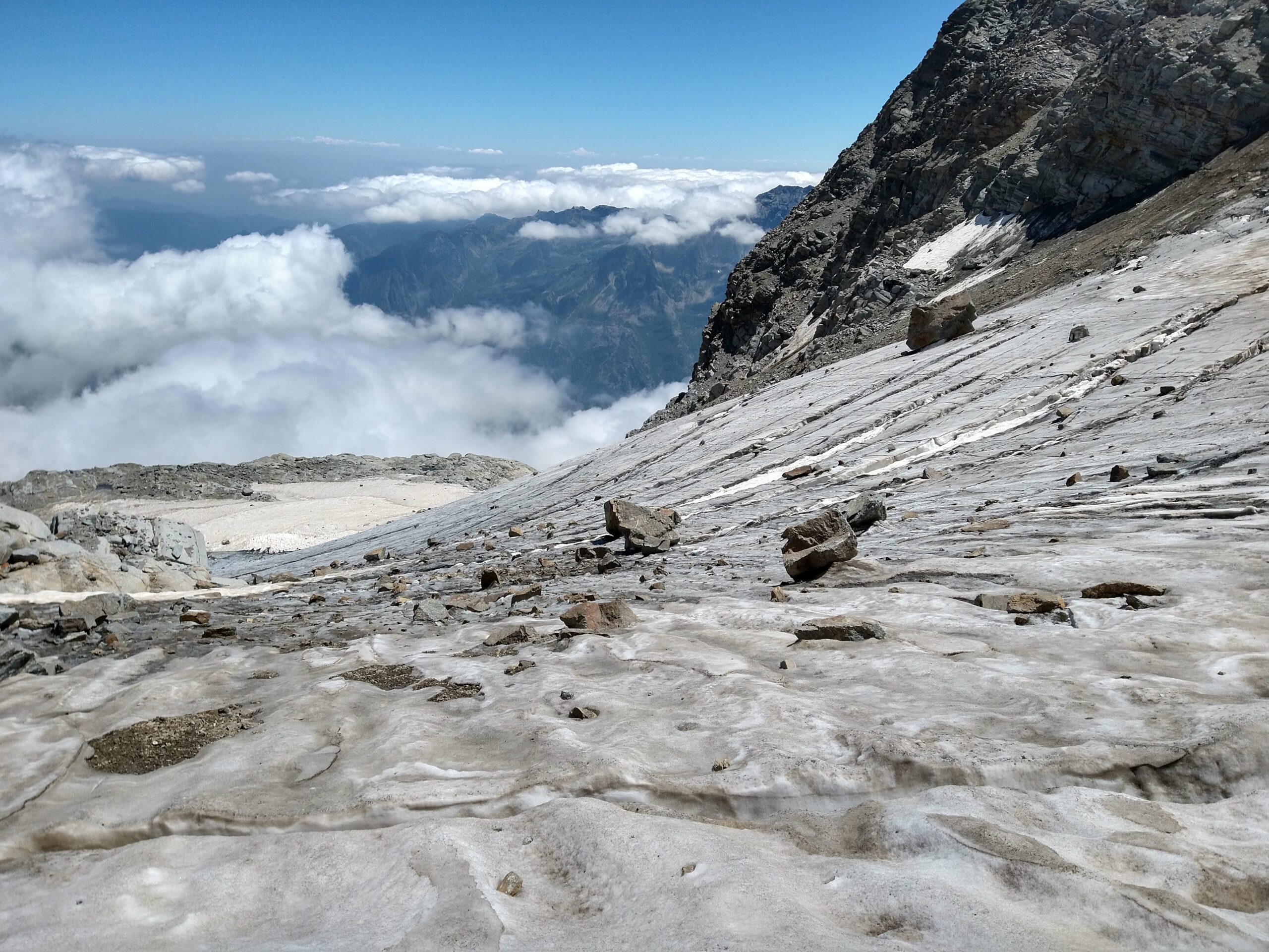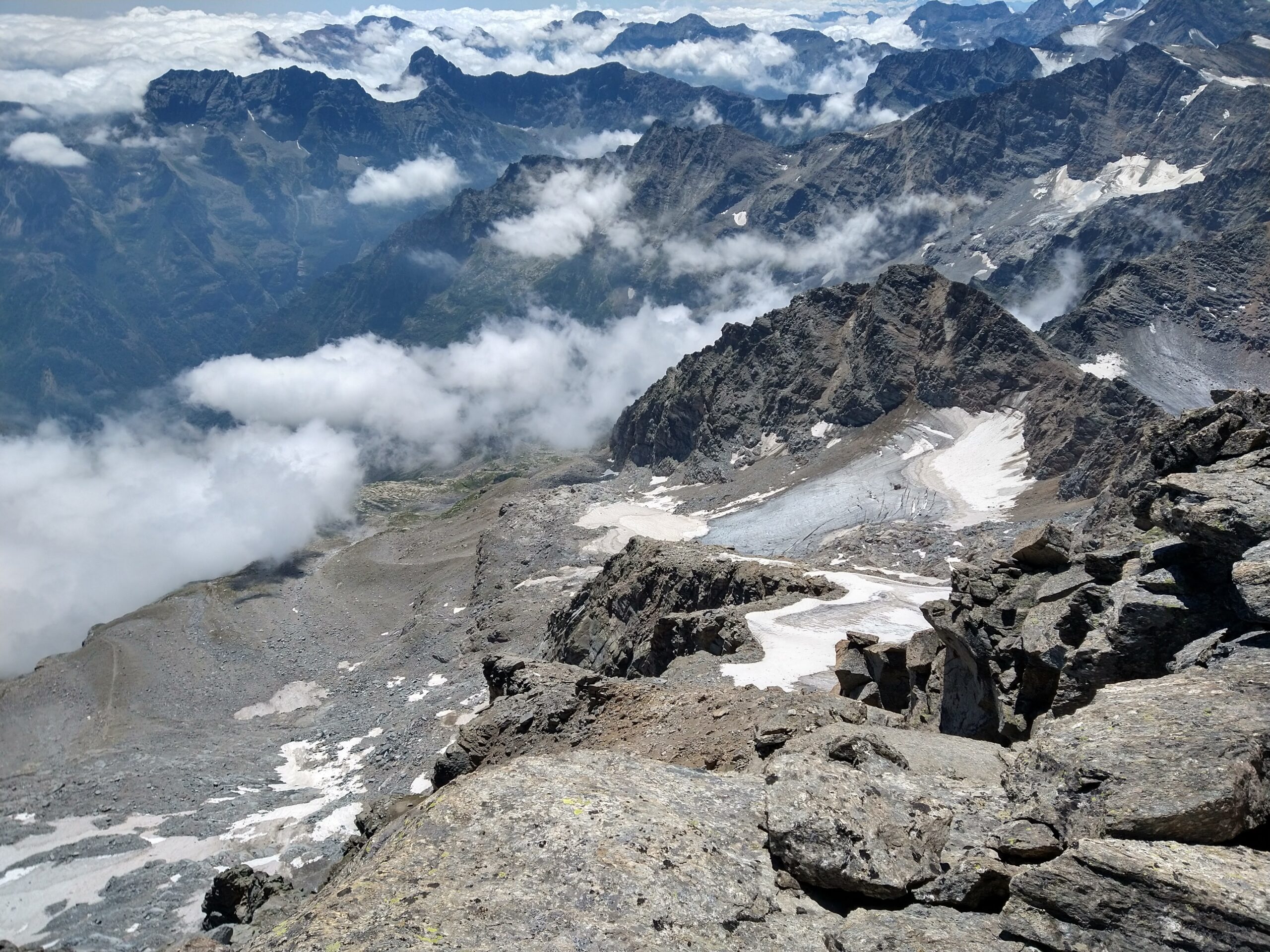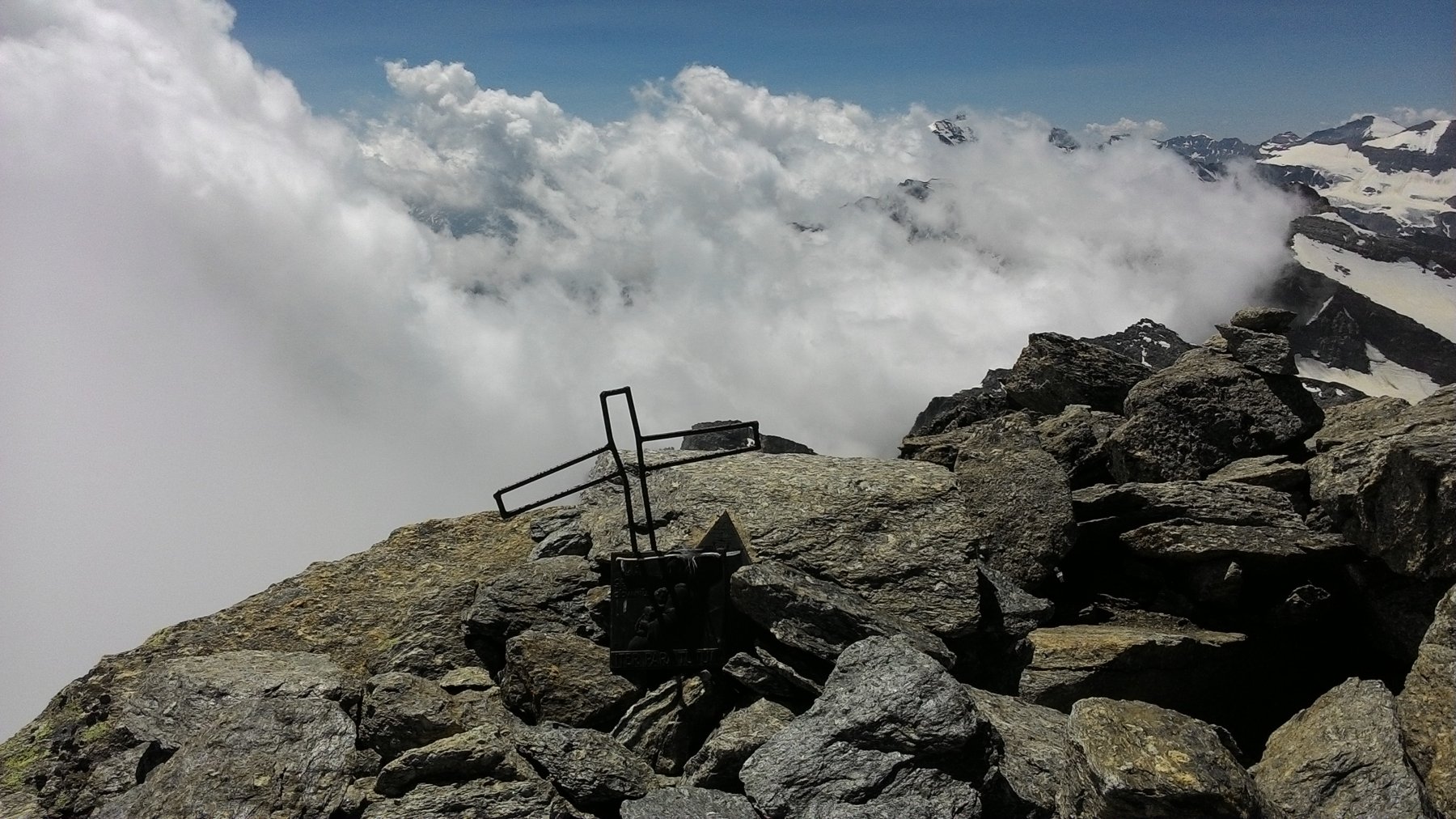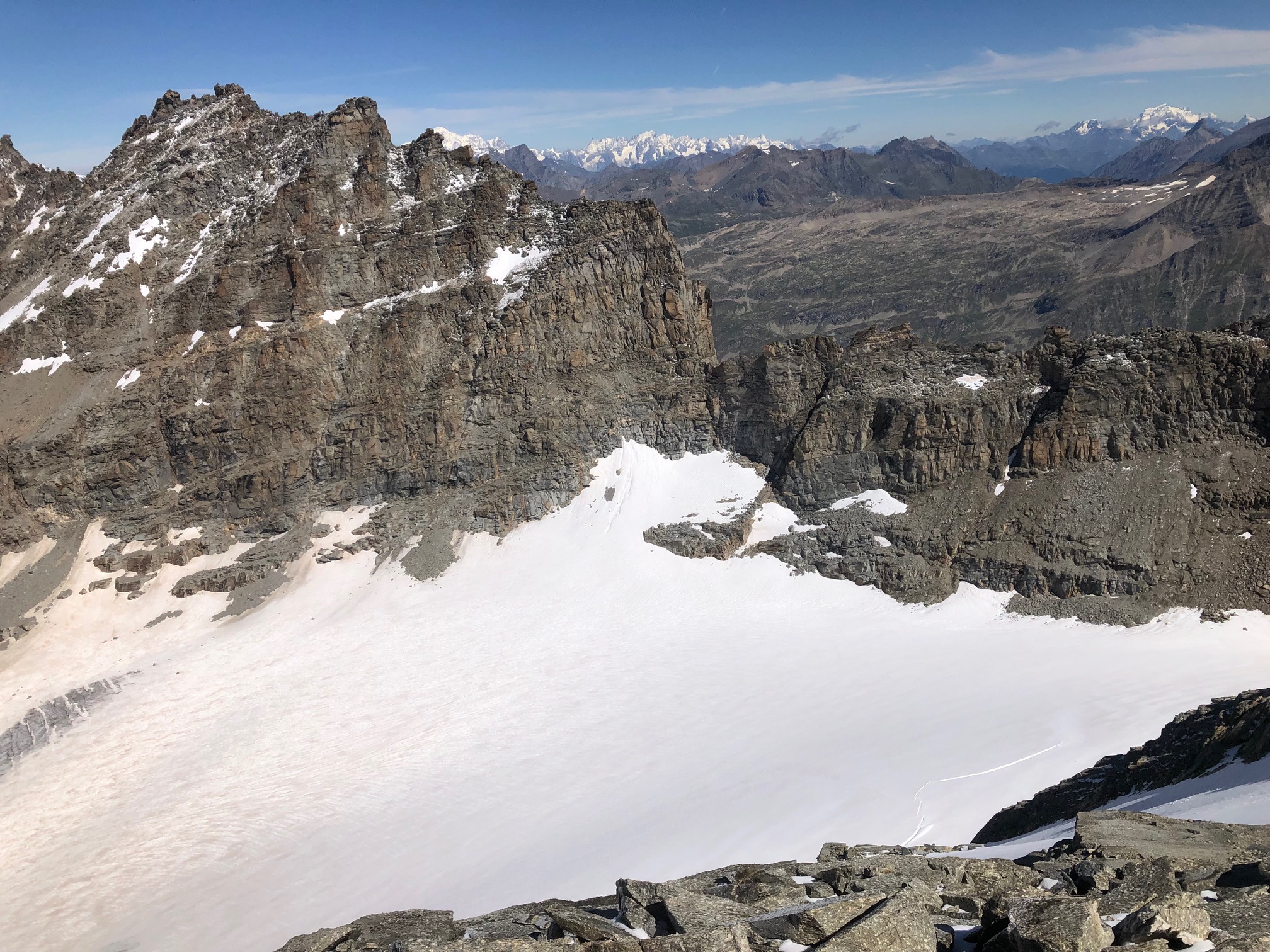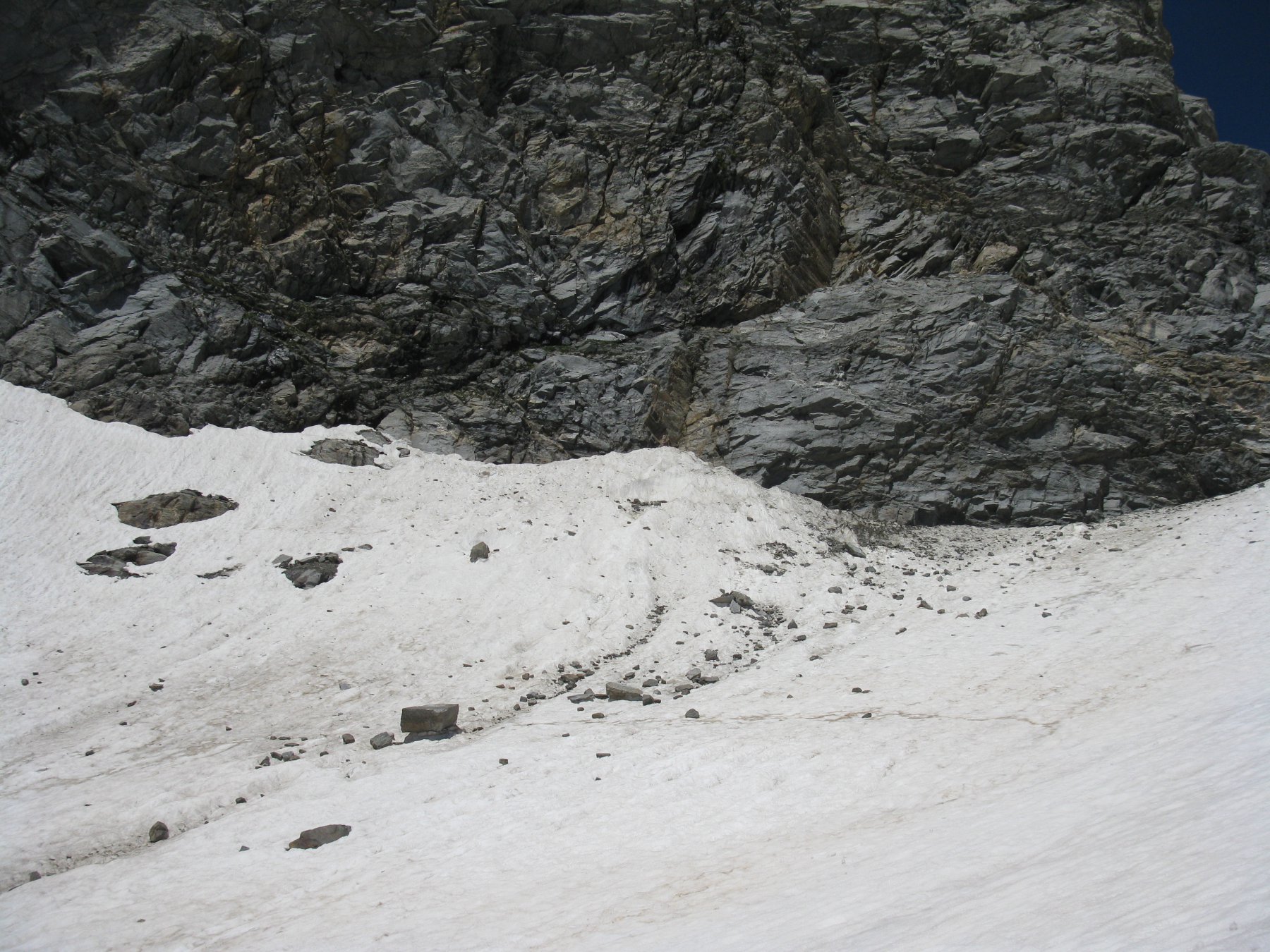 Giunti sulla cresta nevosa sovrastante seguirla e raggiungere il glacio-nevaio sotto la cresta, attraversarla diagonalmente verso dx portandosi su una costa che scende da un intaglio della cresta sommitale. Guadagnare questa forcella sotto la cima per ripidi sfasciumi, quindi traversare verso dx sotto cresta per comode cenge (ometti) fino a raggiungere un canale che permette di raggiungere comodamente la cresta. Da qui, a sx (ovest), per facili rocce giungere sulla cima (3-4 h).