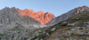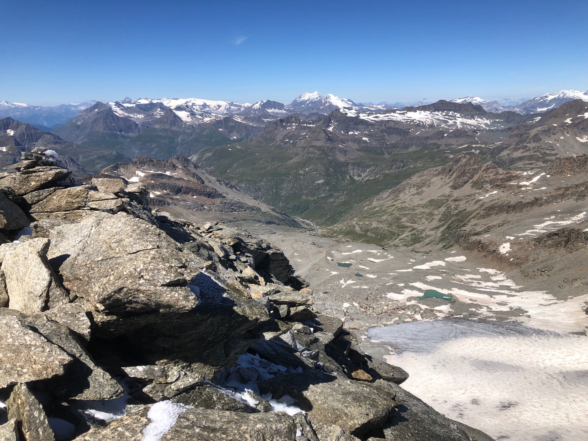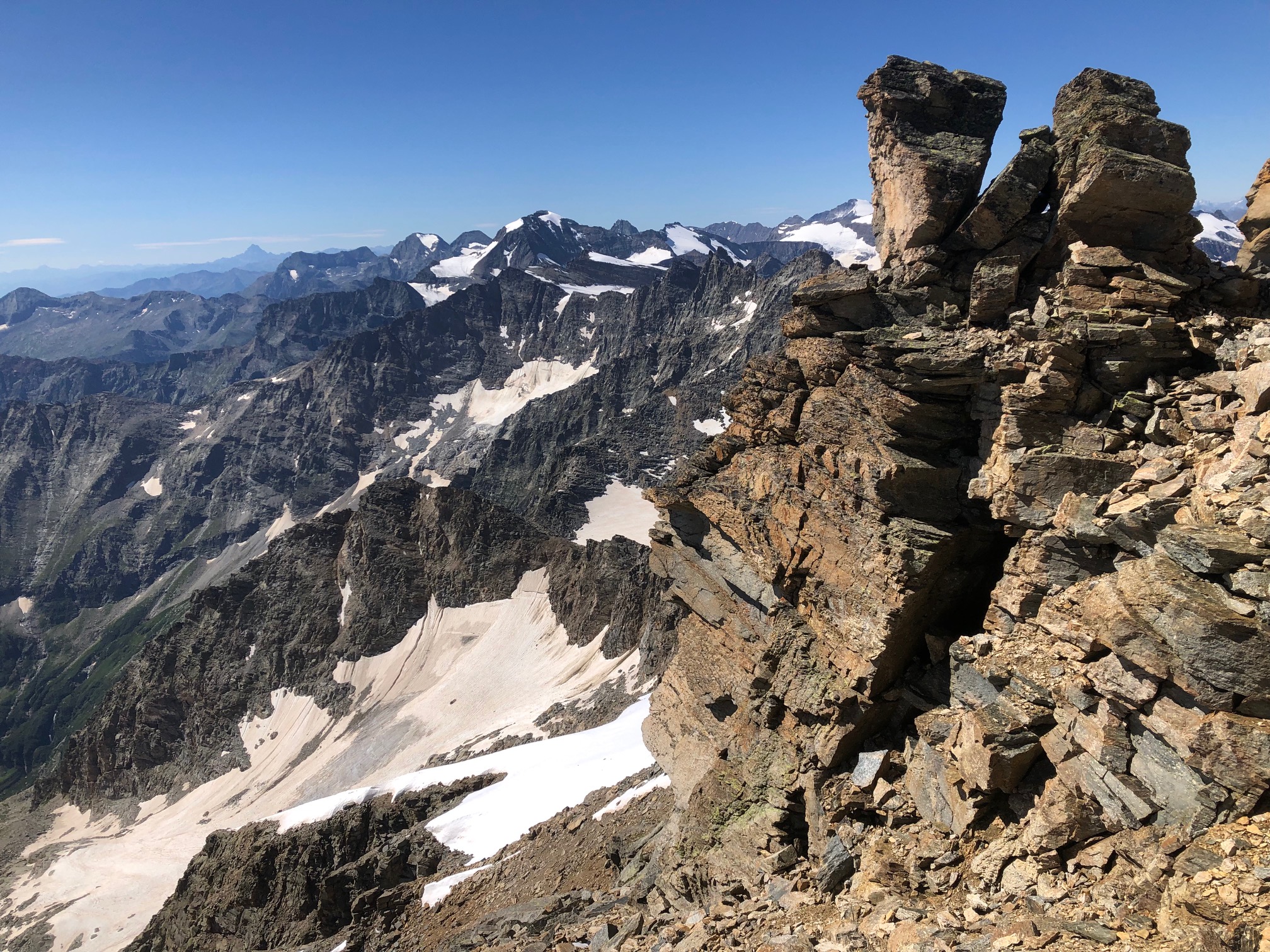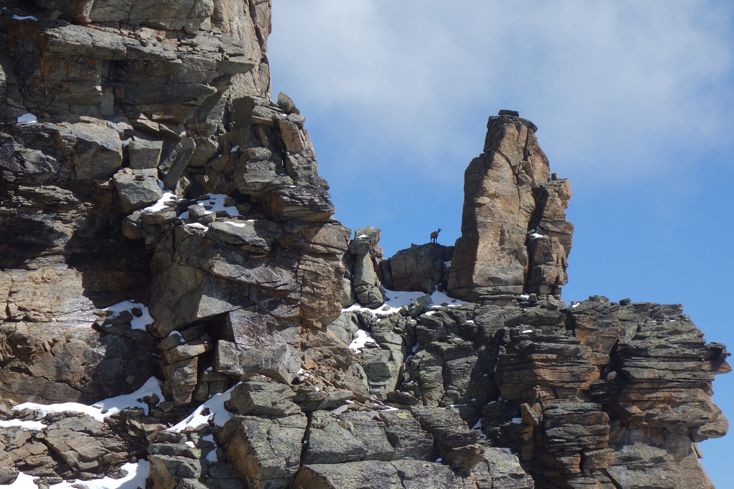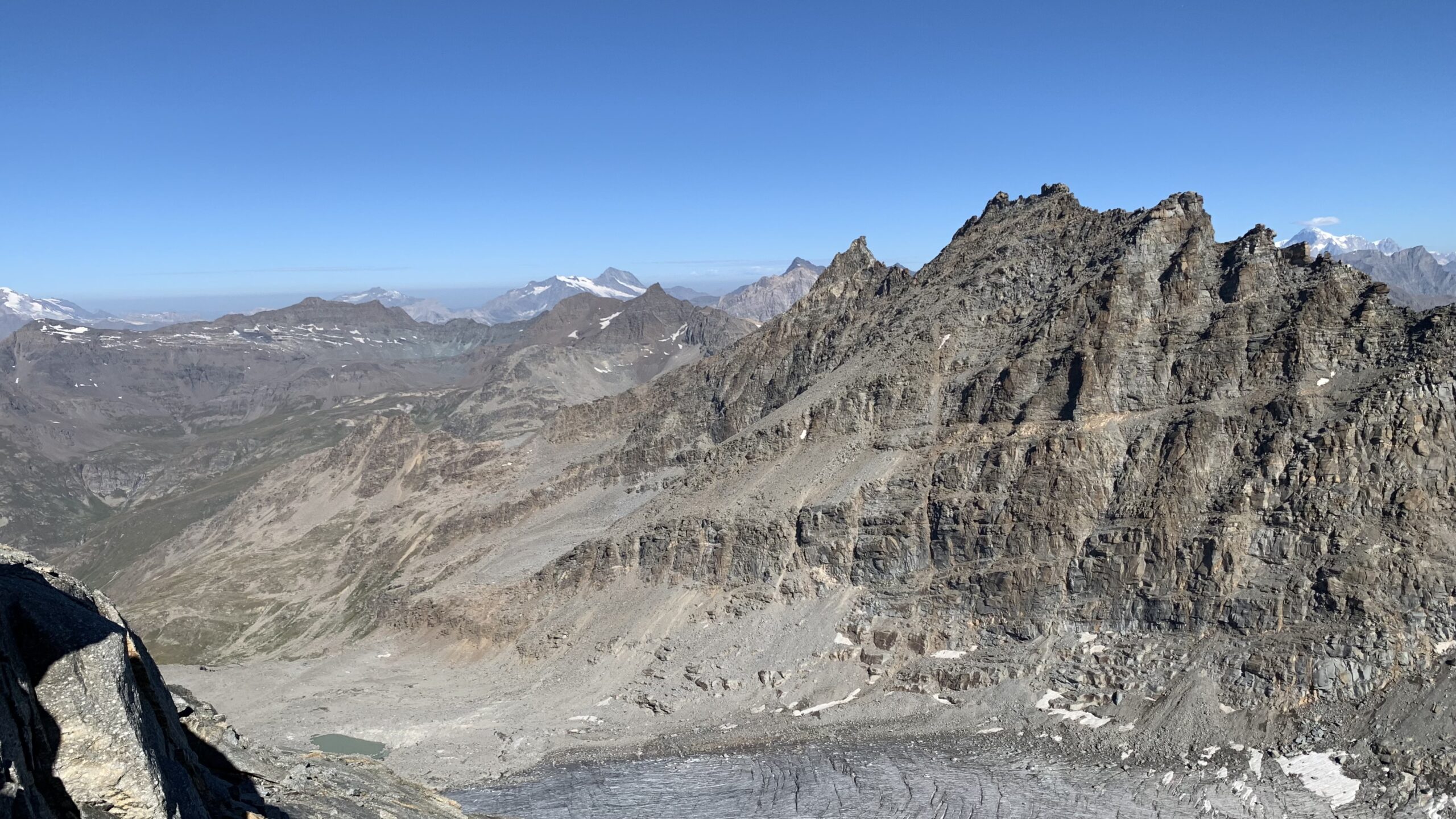 Giunti sulla cresta nevosa sovrastante seguirla e raggiungere il glacio-nevaio sotto la cresta, attraversarla diagonalmente verso dx portandosi su una costa che scende da un intaglio della cresta sommitale. Guadagnare questa forcella sotto la cima per ripidi sfasciumi, quindi traversare verso dx sotto cresta per comode cenge (ometti) fino a raggiungere un canale che permette di raggiungere comodamente la cresta. Da qui, a sx (ovest), per facili rocce giungere sulla cima (3-4 h).