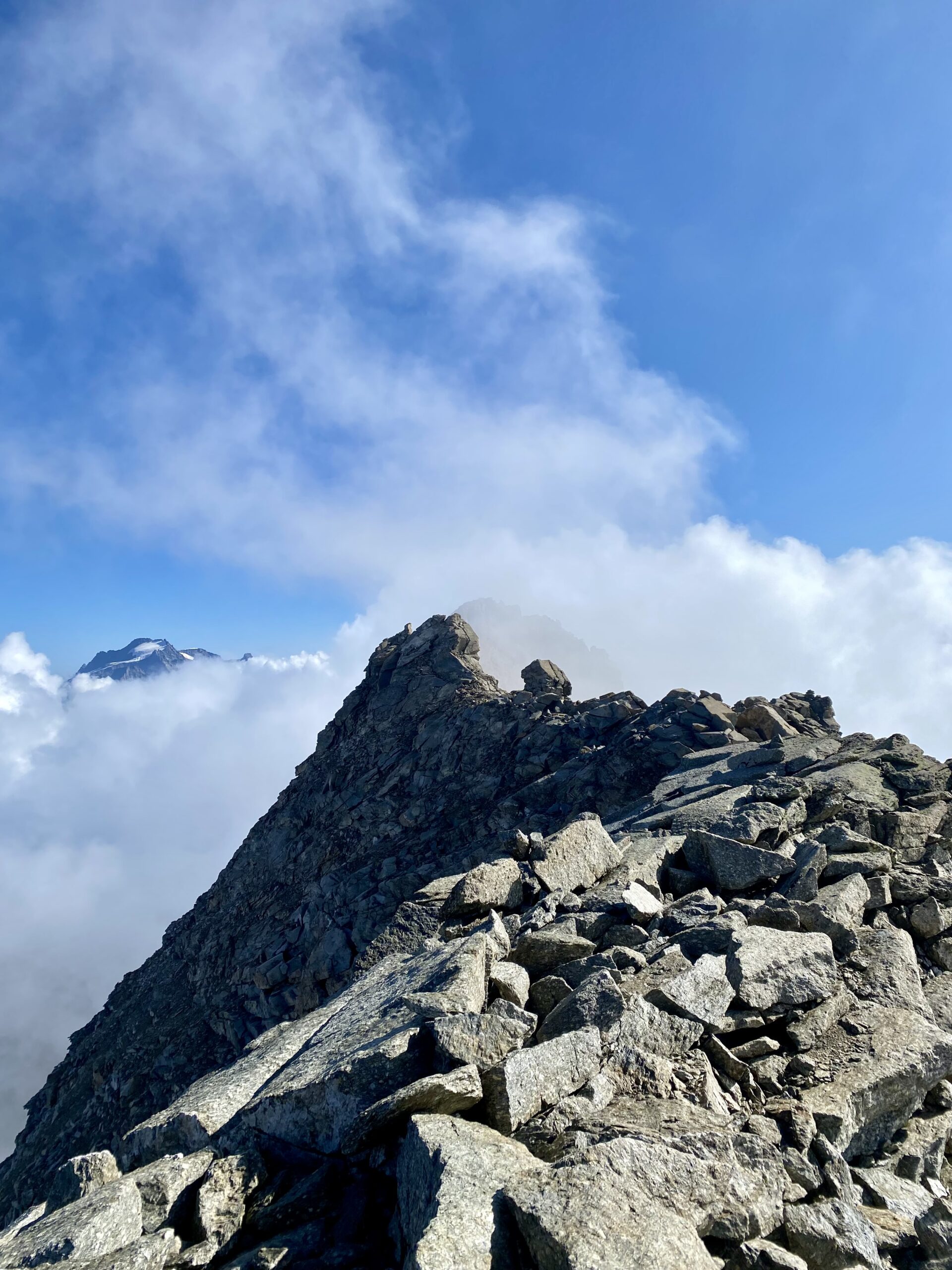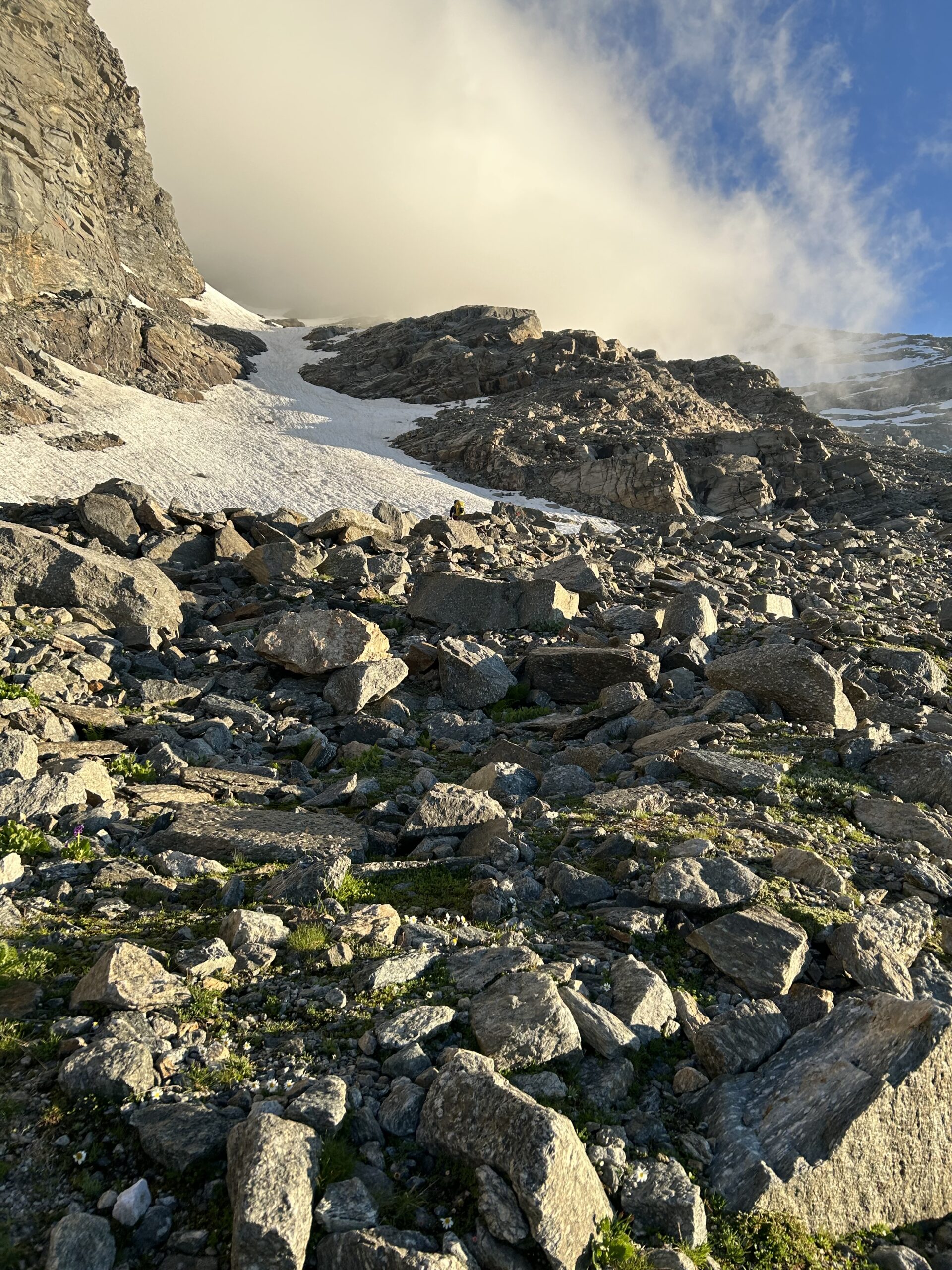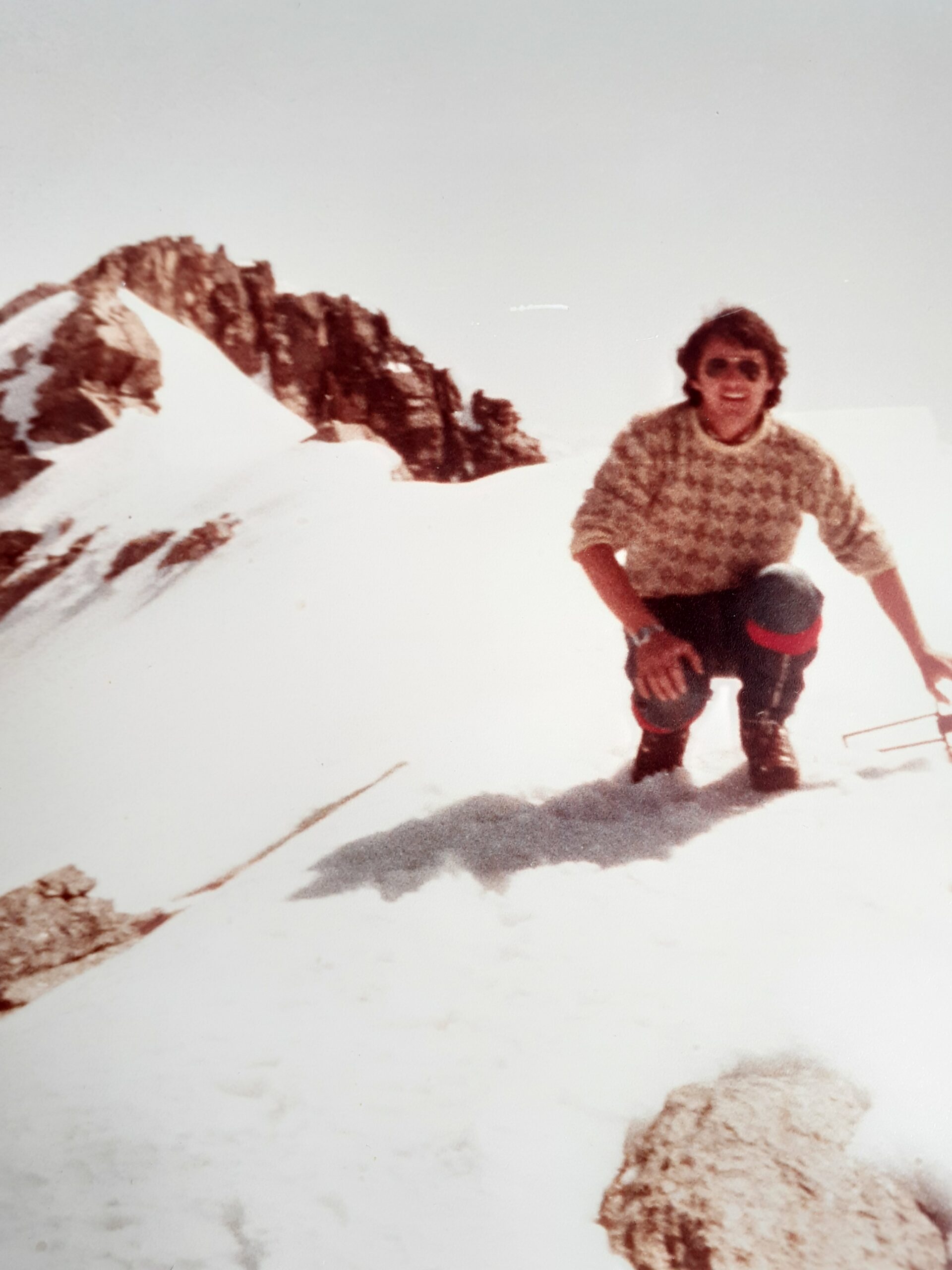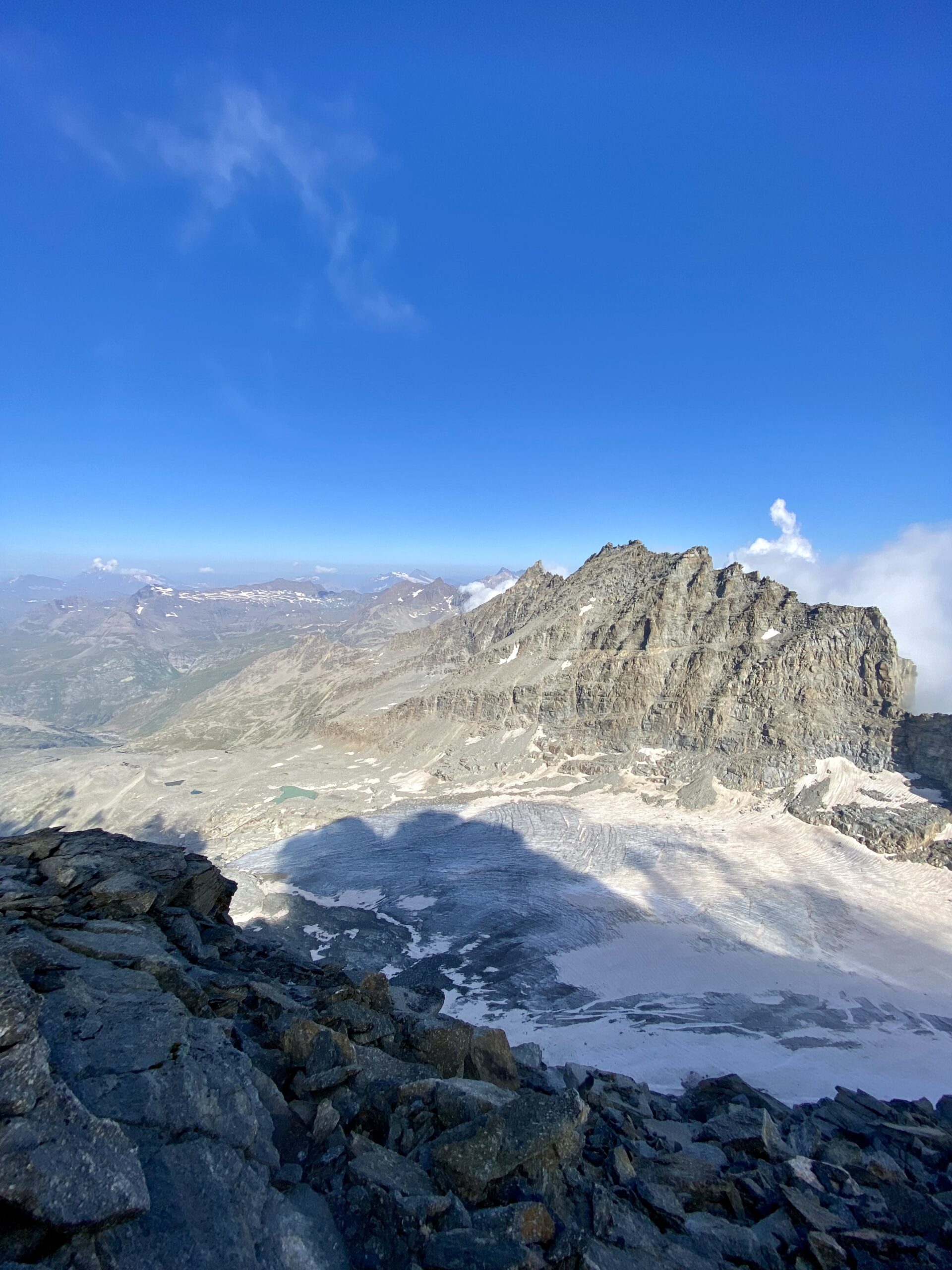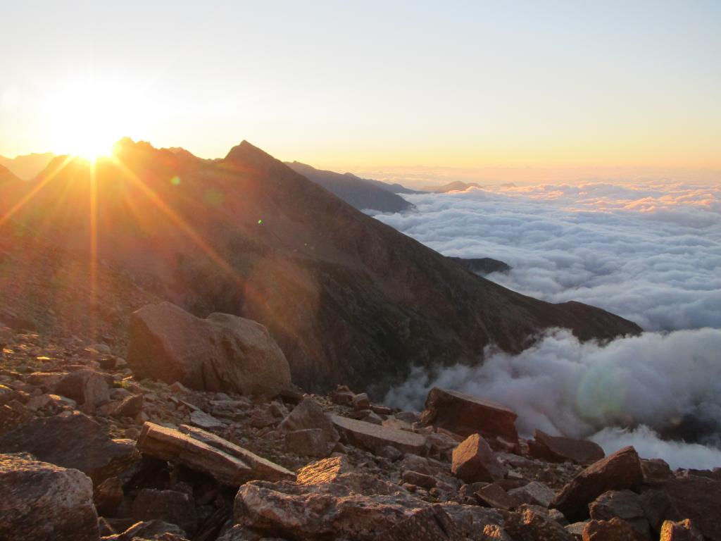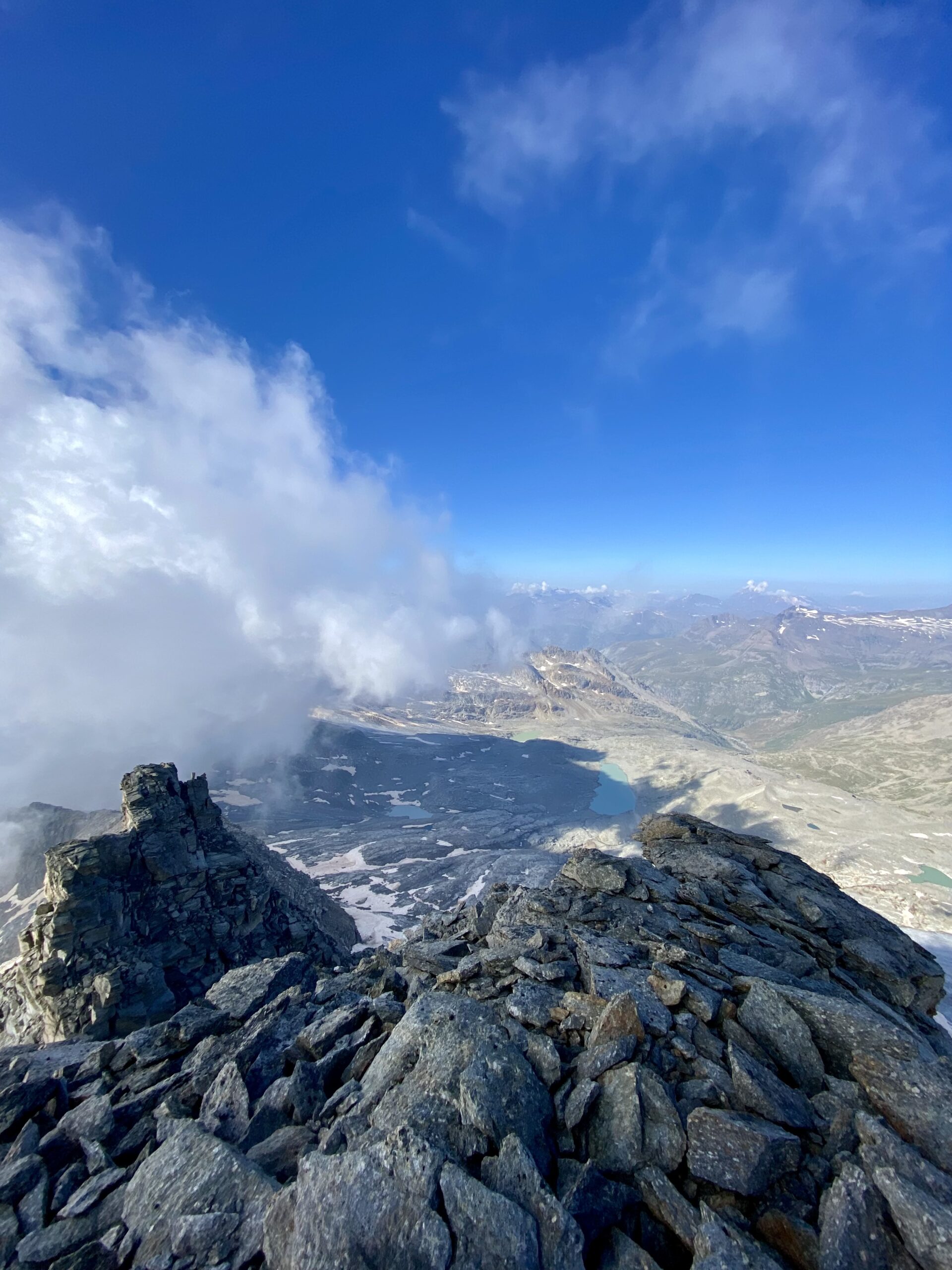 Giunti sulla cresta nevosa sovrastante seguirla e raggiungere il glacio-nevaio sotto la cresta, attraversarla diagonalmente verso dx portandosi su una costa che scende da un intaglio della cresta sommitale. Guadagnare questa forcella sotto la cima per ripidi sfasciumi, quindi traversare verso dx sotto cresta per comode cenge (ometti) fino a raggiungere un canale che permette di raggiungere comodamente la cresta. Da qui, a sx (ovest), per facili rocce giungere sulla cima (3-4 h).