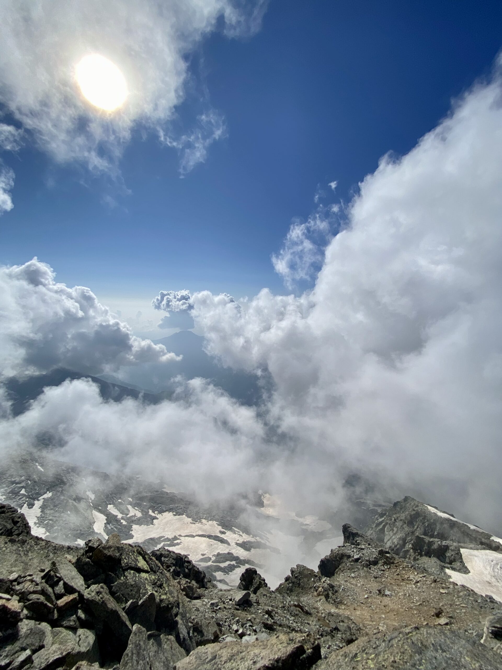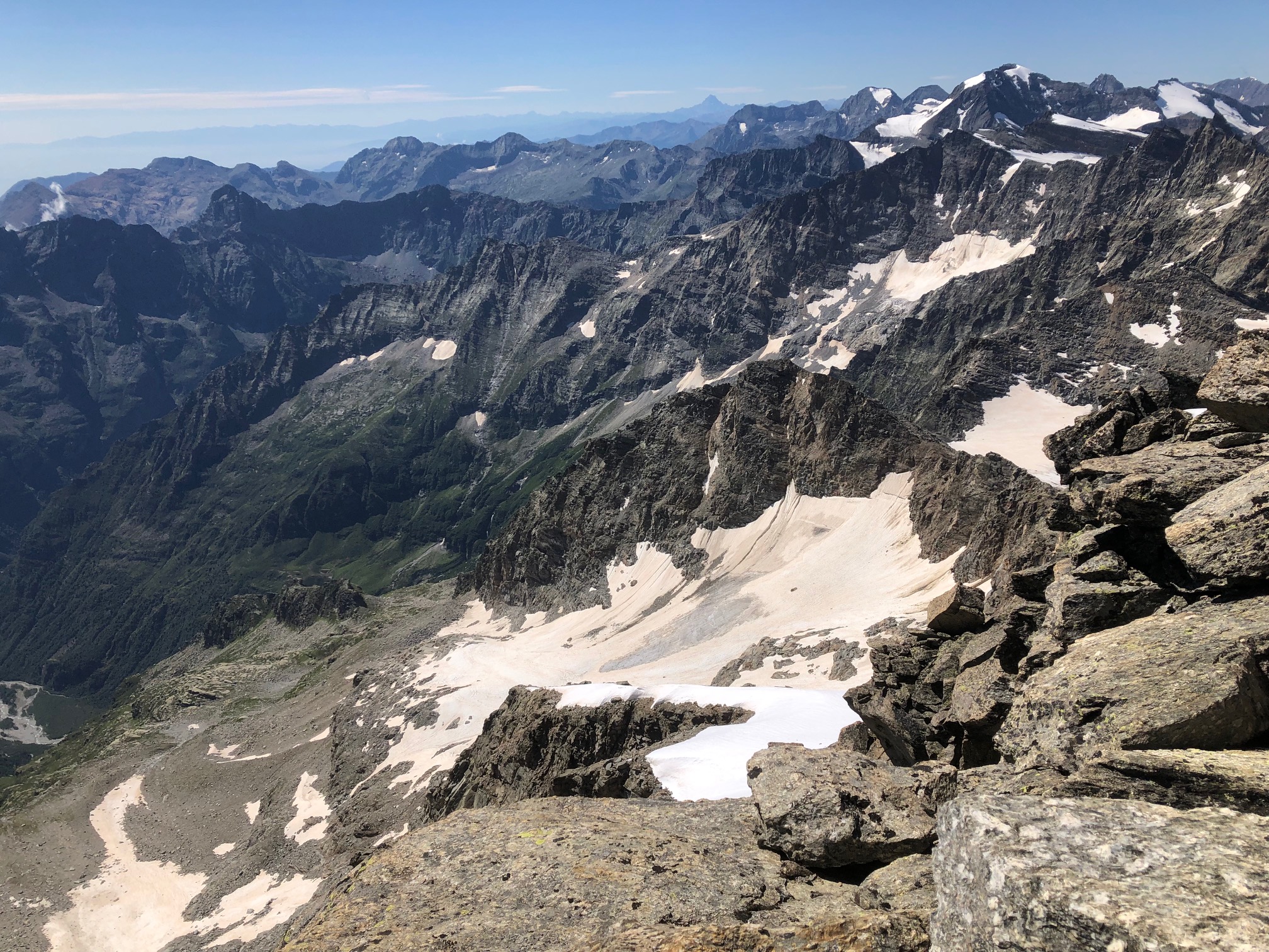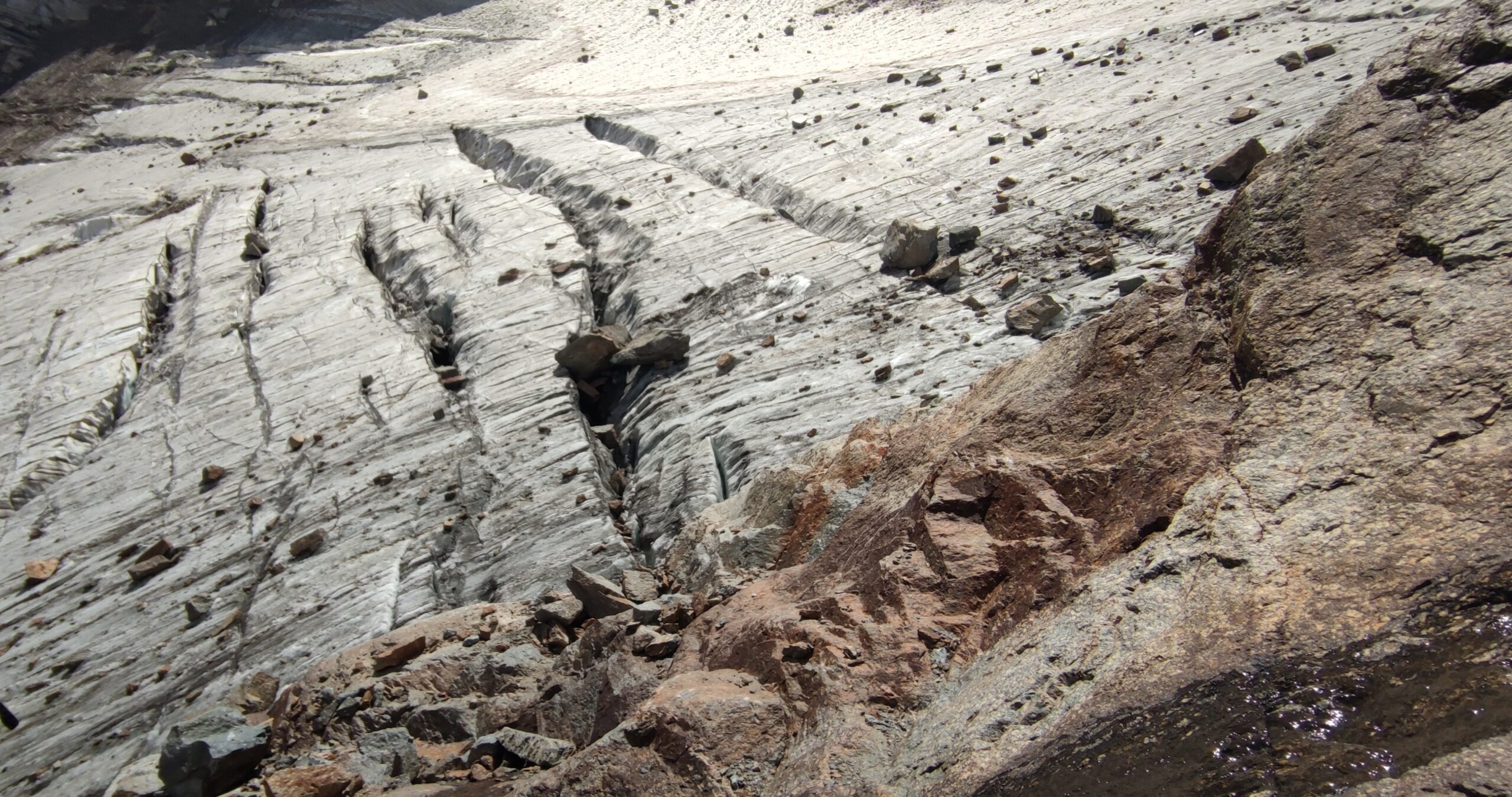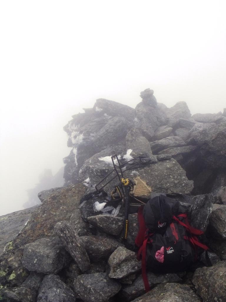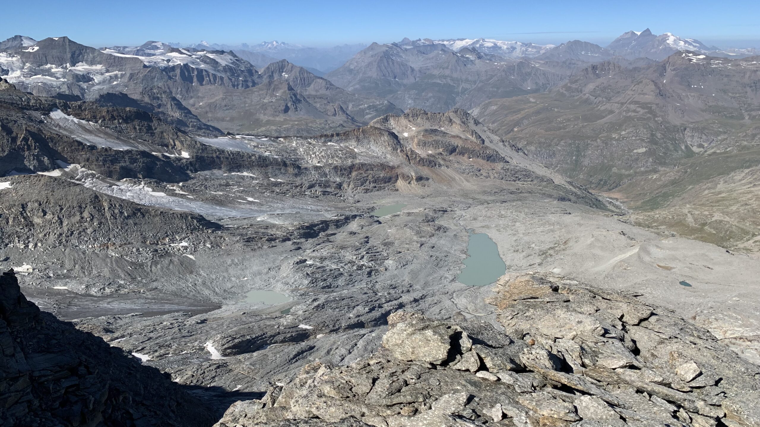 Giunti sulla cresta nevosa sovrastante seguirla e raggiungere il glacio-nevaio sotto la cresta, attraversarla diagonalmente verso dx portandosi su una costa che scende da un intaglio della cresta sommitale. Guadagnare questa forcella sotto la cima per ripidi sfasciumi, quindi traversare verso dx sotto cresta per comode cenge (ometti) fino a raggiungere un canale che permette di raggiungere comodamente la cresta. Da qui, a sx (ovest), per facili rocce giungere sulla cima (3-4 h).