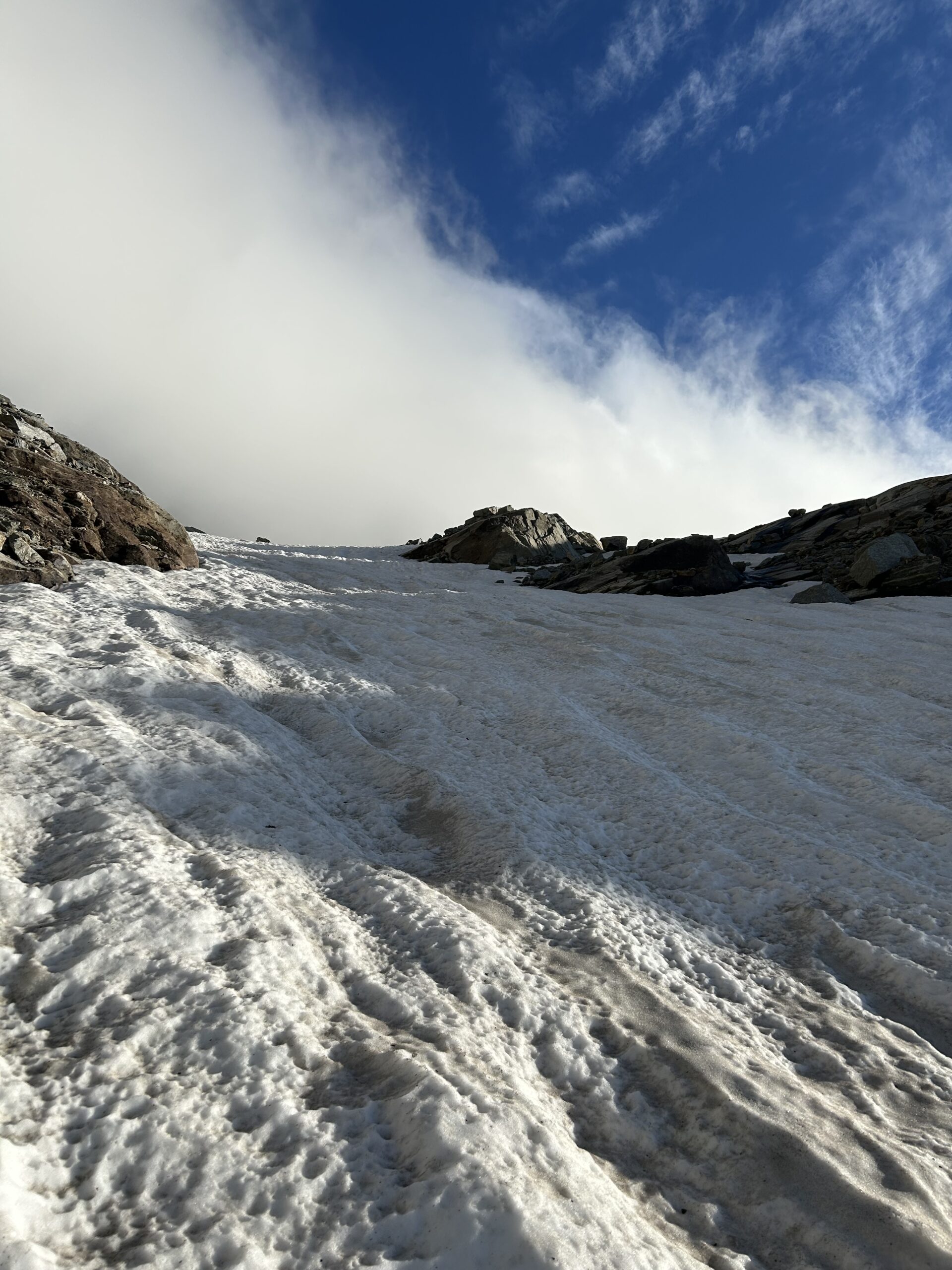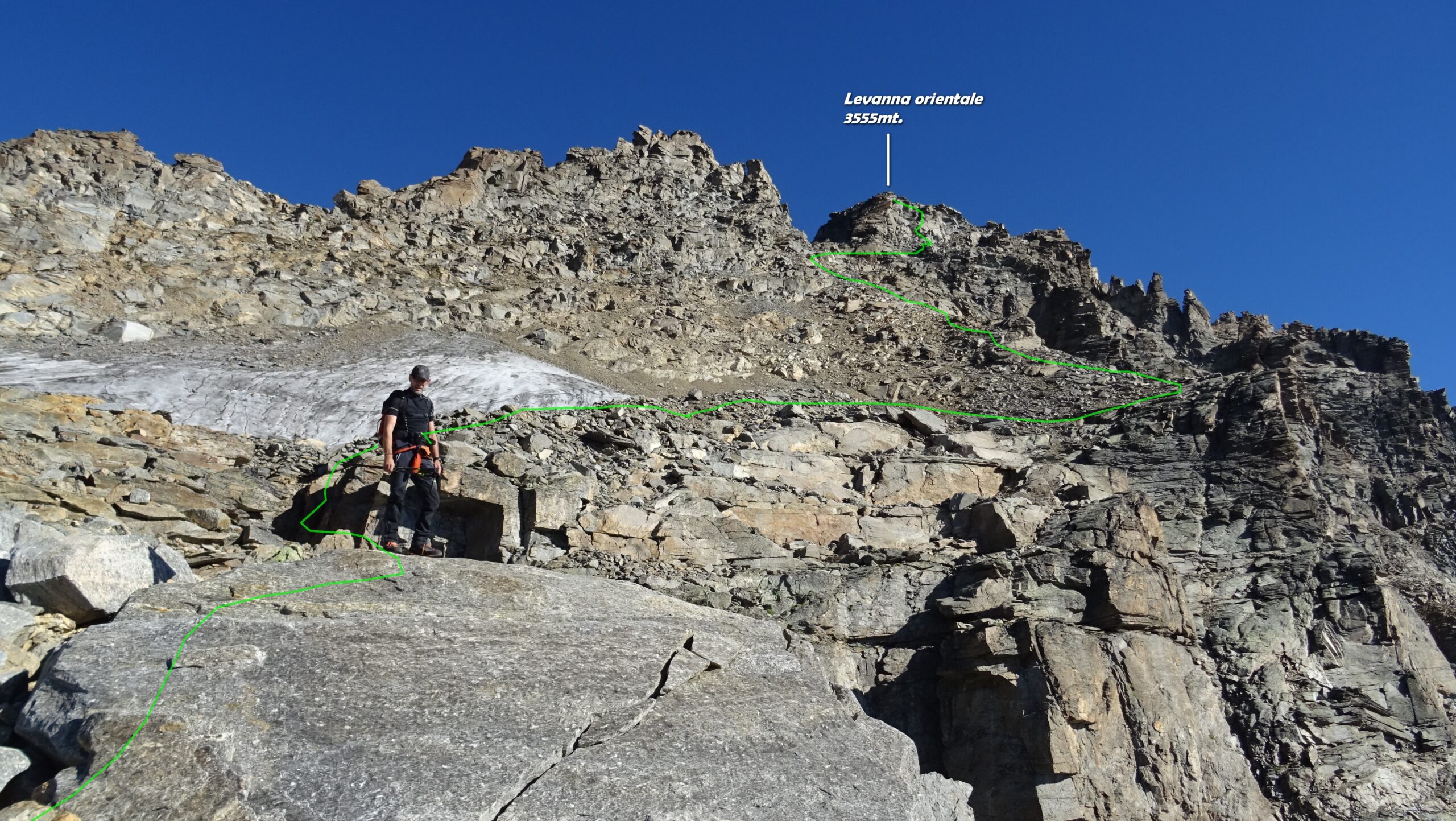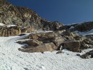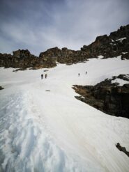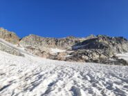 Da qui risalire la morena frontale in direzione NO; proseguire su neve sotto i contrafforti settentrionali della Punta Girard fino alla fronte del ghiacciaio della Levanna; con ampio semicerchio verso NE portarsi sulla costola rocciosa e risalirla per facili rocce.