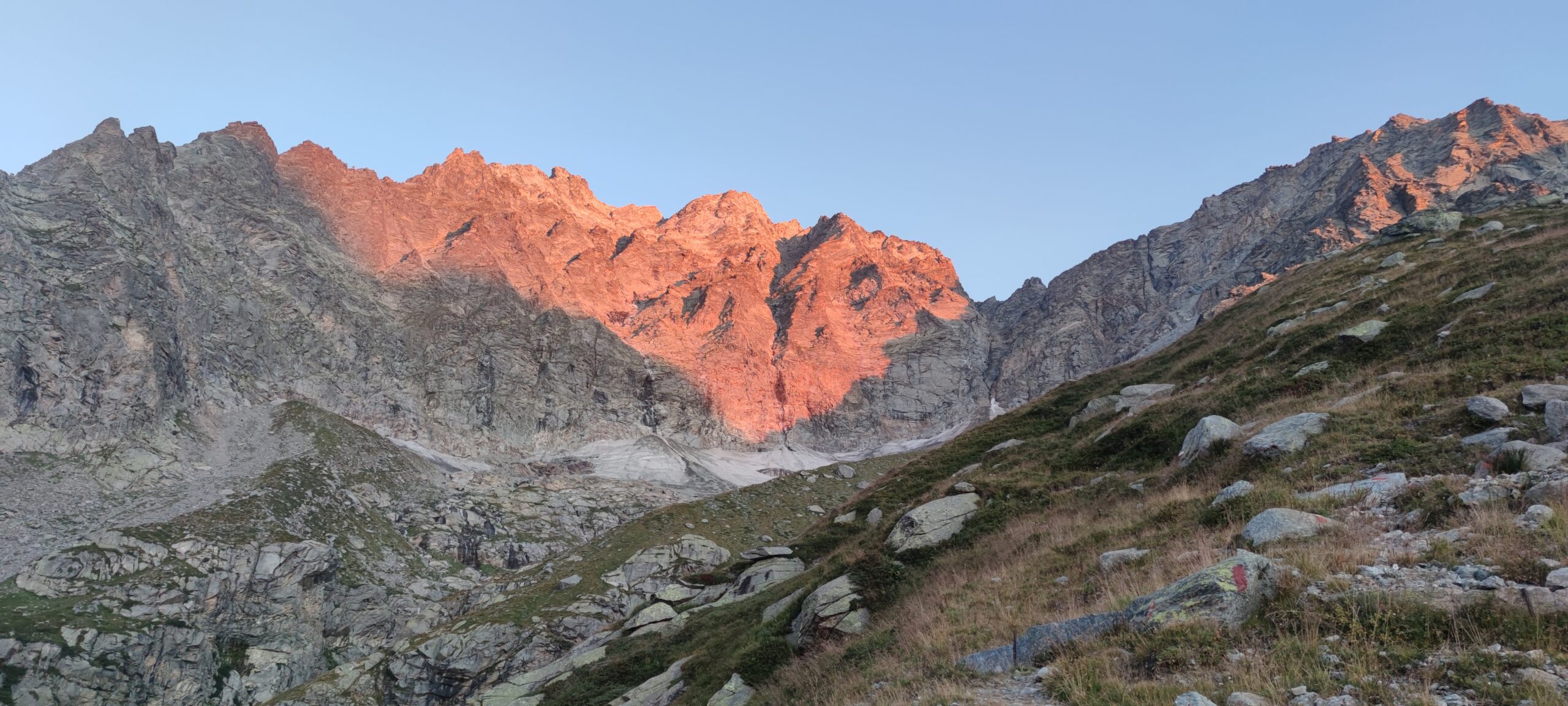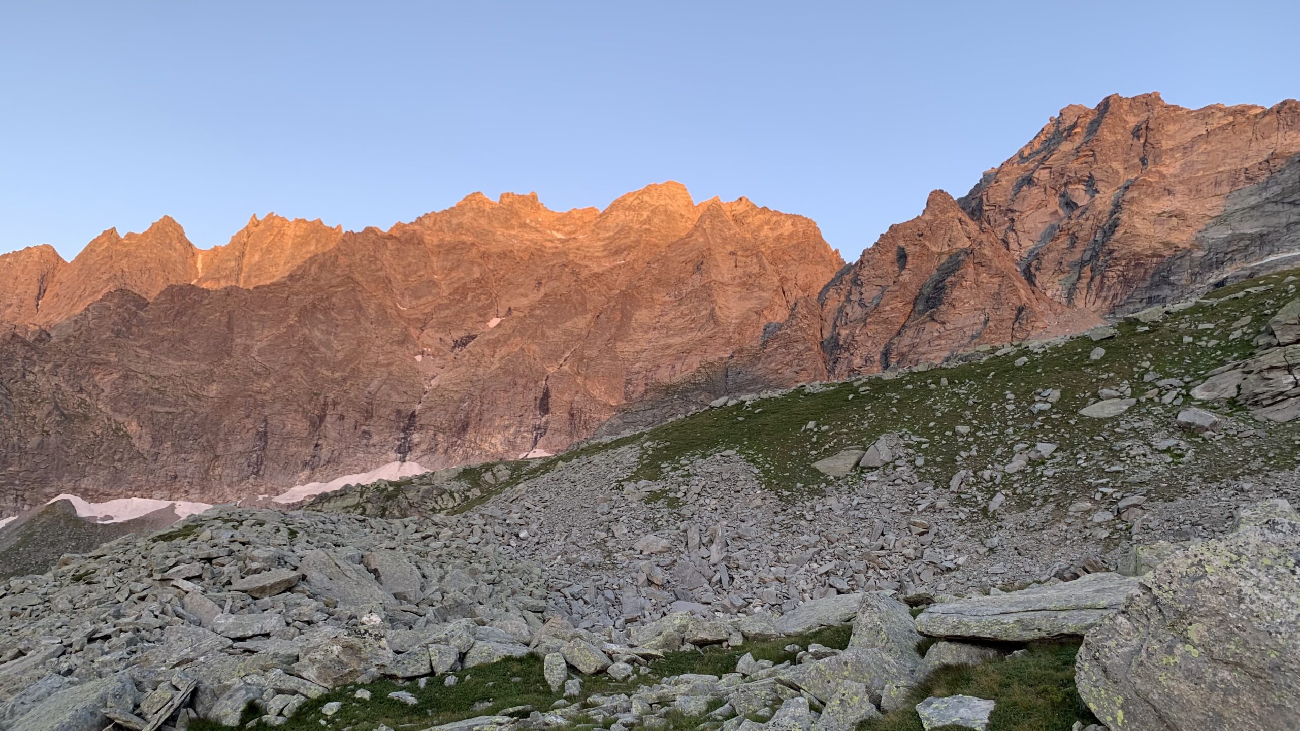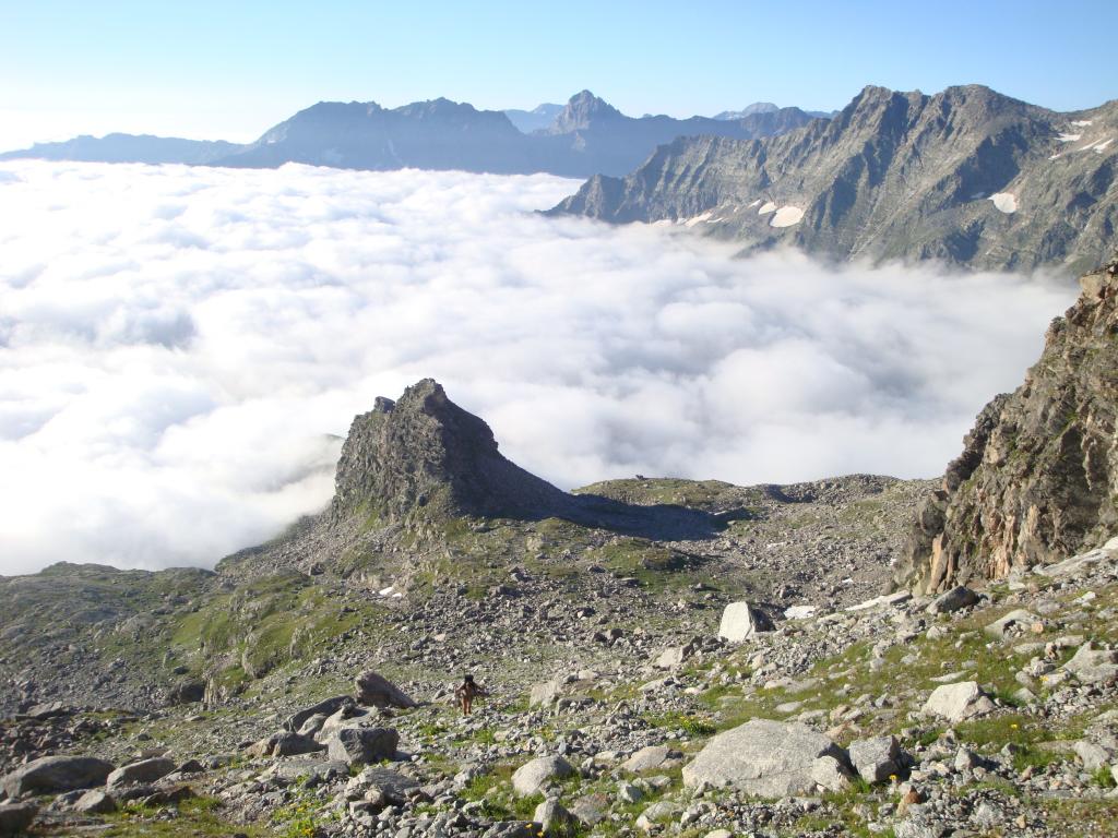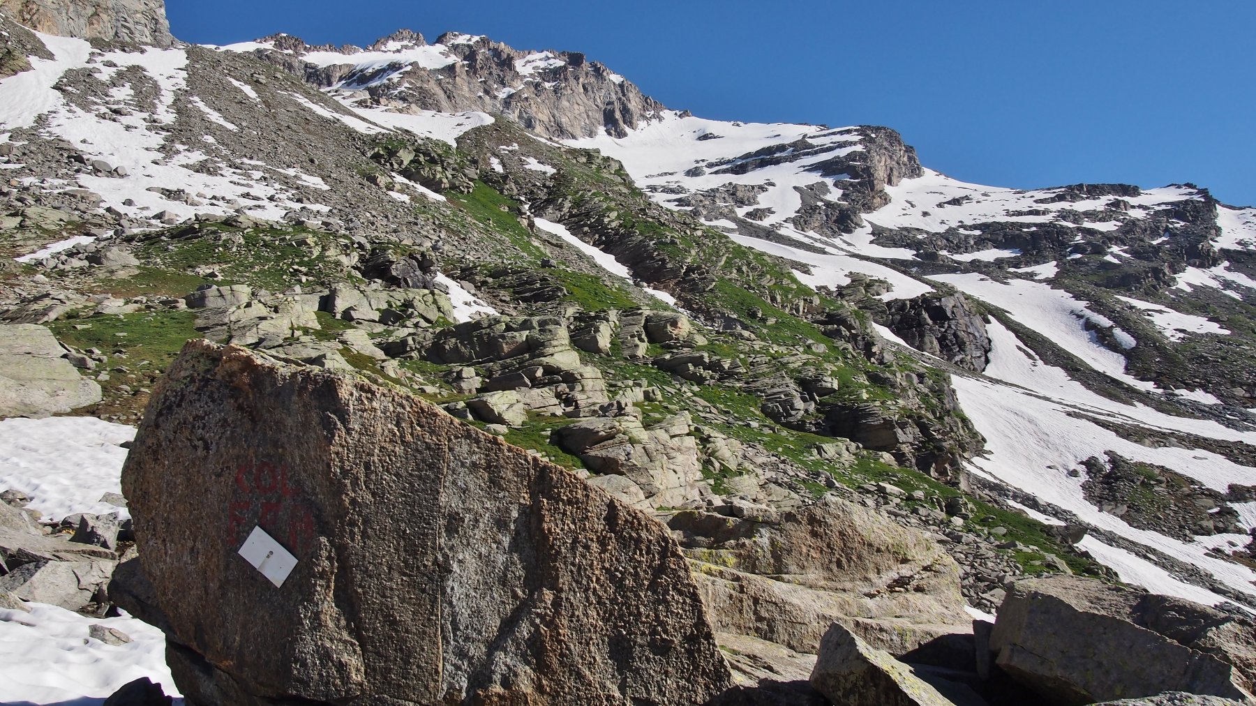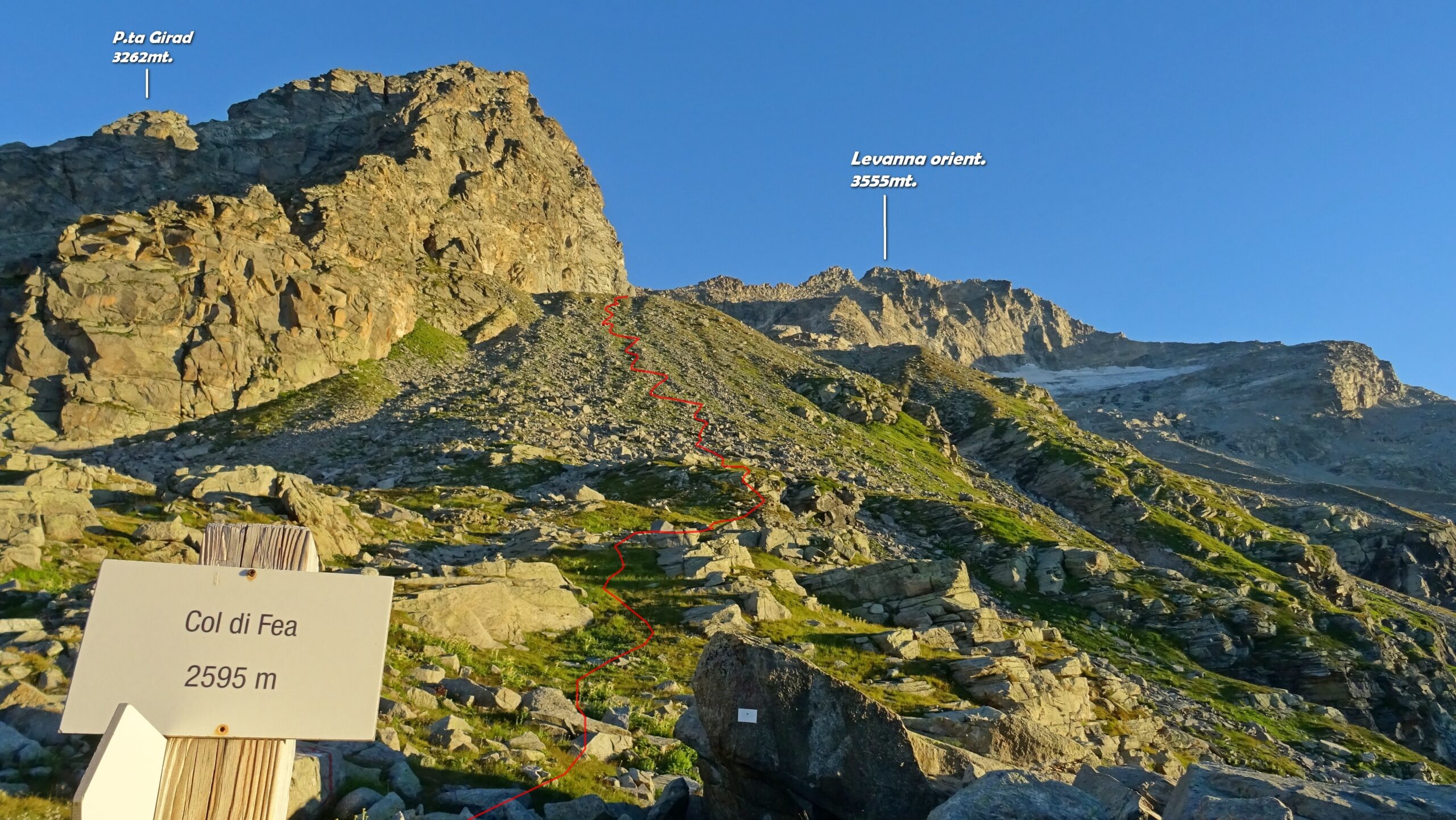 Dal Rifugio Daviso seguire la ripida traccia di sentiero sulla dorsale sopra la costruzione; lasciare a sinistra la traccia che porta al col Girard e proseguire su ampie terrazze fino a raggiunger il Col Fea a 2595 m (1 h).