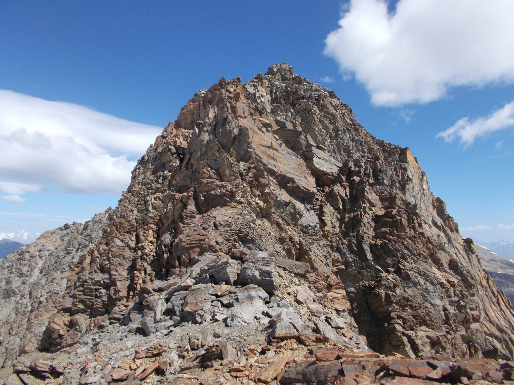 La parte finale che segue consente sia di stare sul filo (II II+), oppure per detriti piu’ facilmente alla sx del filo. E si arriva cosi in breve all’ometto di vetta (3420m). (dalle 6 alle 7 ore da Tignet).