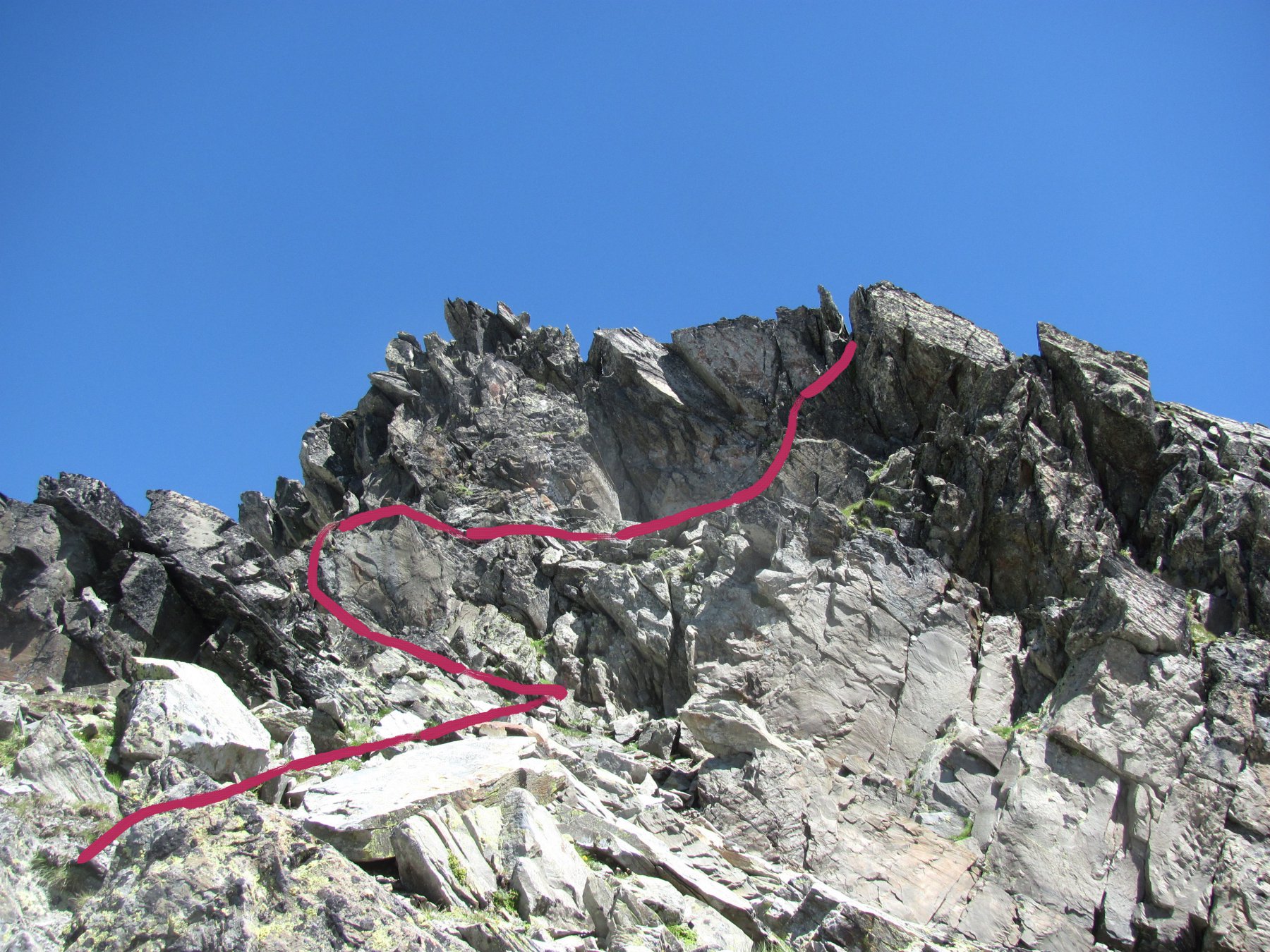 Seguendo le indicazioni e passando per il Col de la Traversette, (salita, discesa dal versante francese e ripida risalita) si arriva per sentiero al Passage de la Louie Blanche (m. 2524). Di qui il crestone SO è evidente, sulla sinistra.