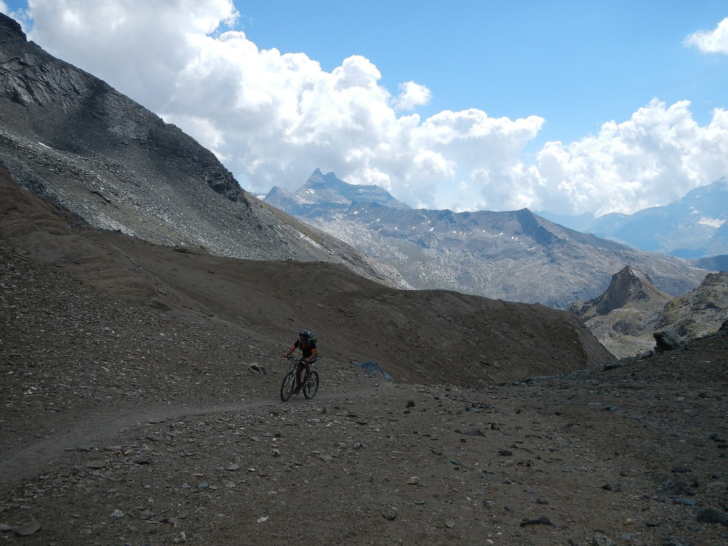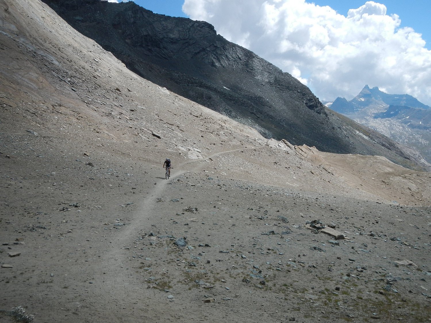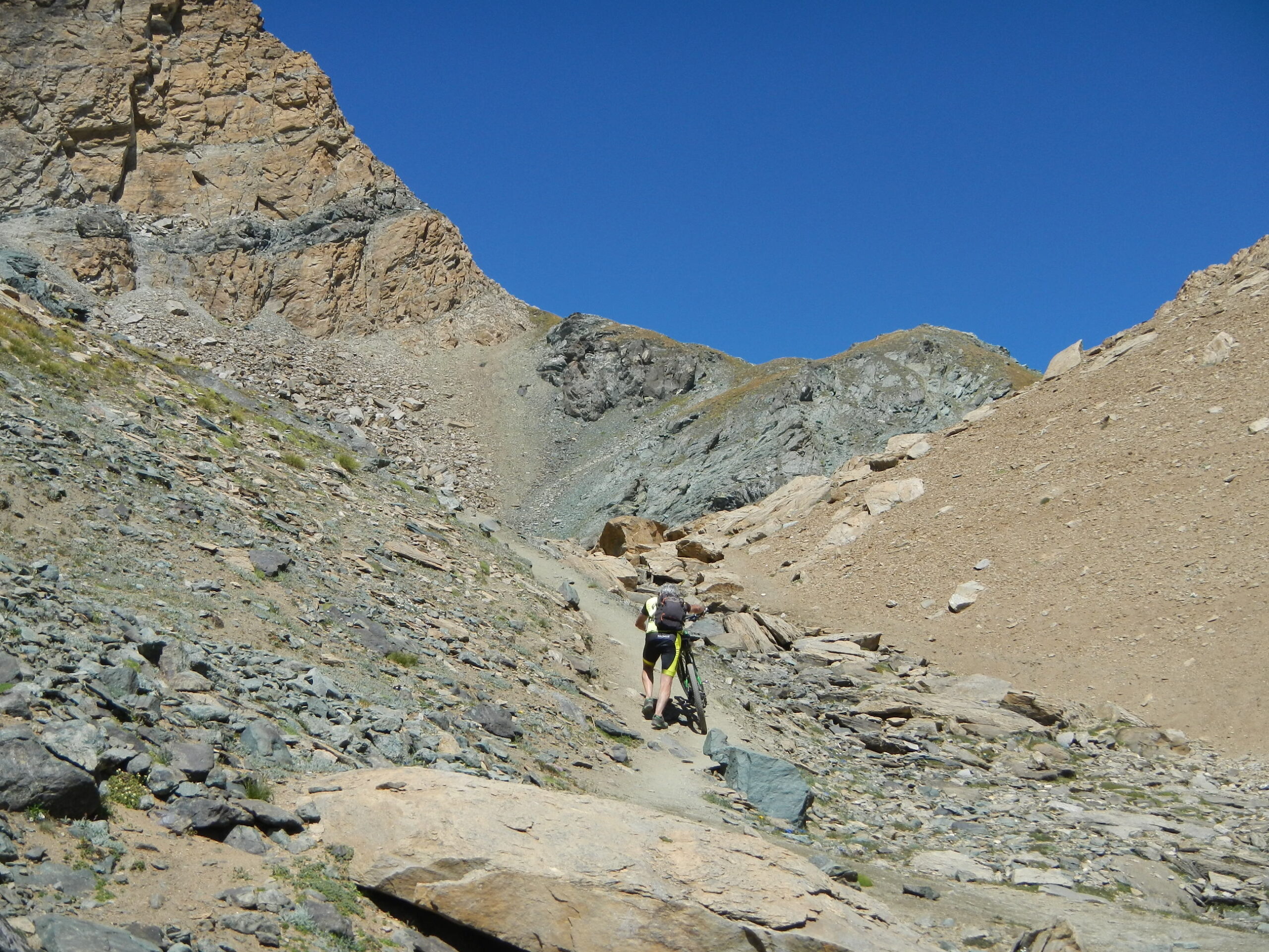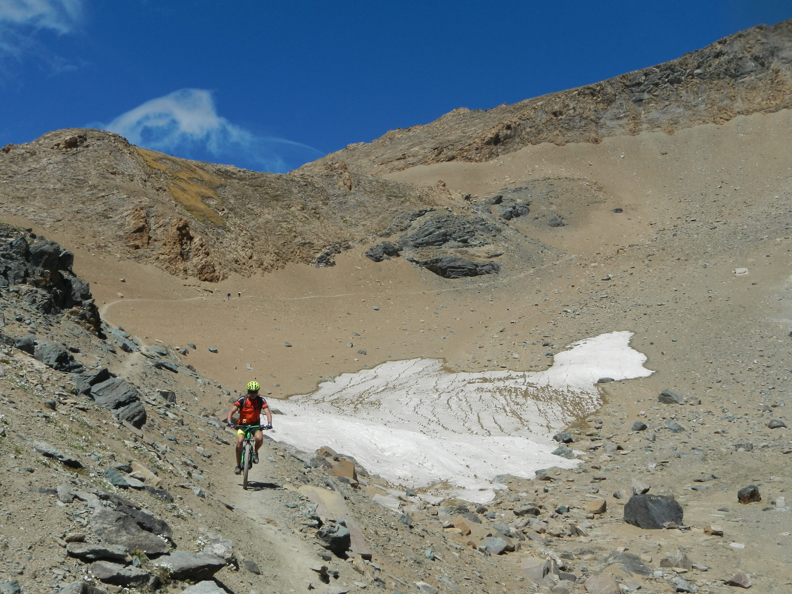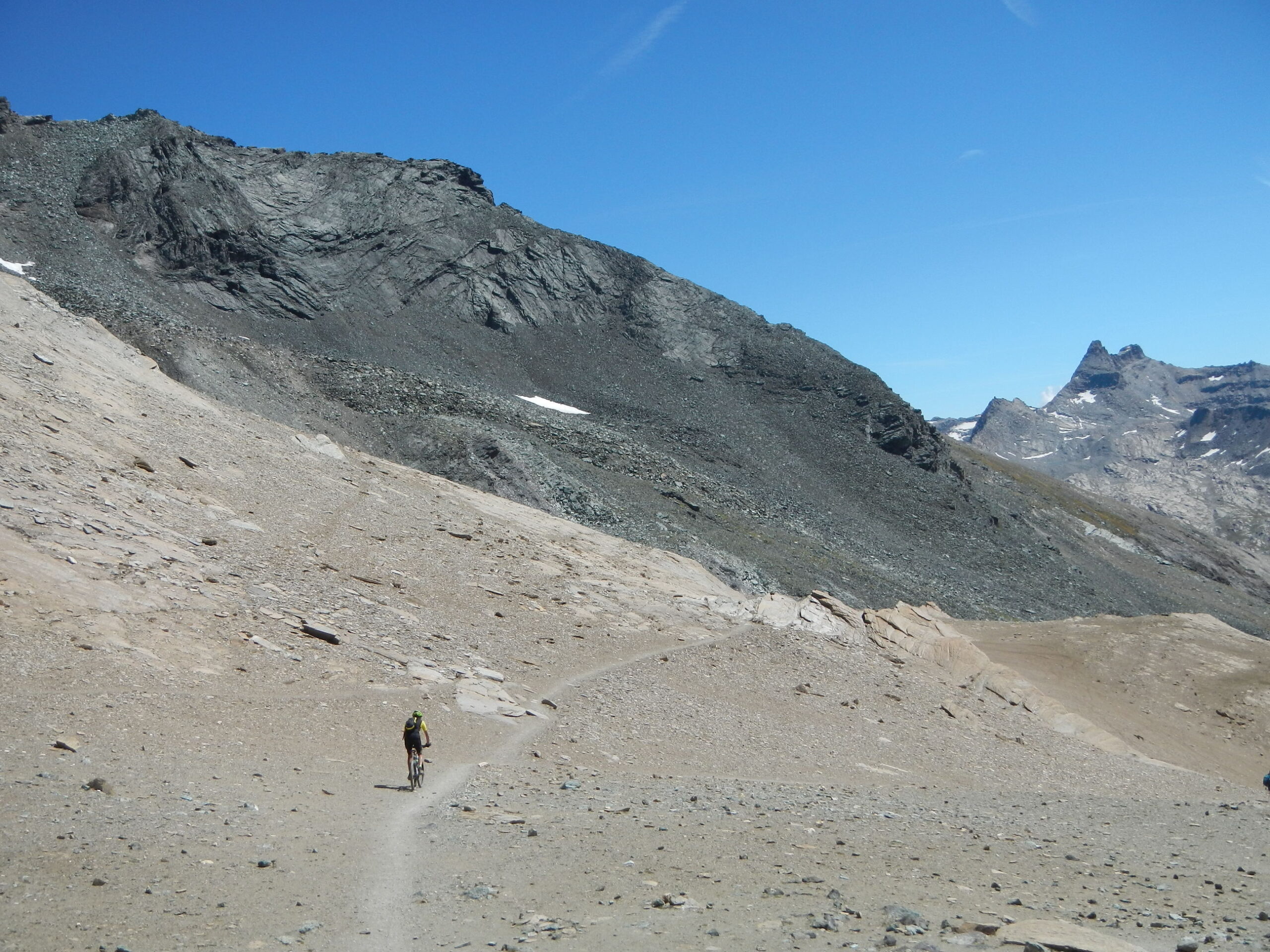 Terminate le rampe i detriti prendono il posto all’erba, e si entra in una conca racchiusa sotto la Punta del Bes. Una breve discesa non ciclabile a causa di grossi massi, e si giunge all’inizio della valletta che proviene dal Col Leynir. L’ambiente cambia ancora, e si risale per i caratteristici ghiaioni di color rossastro. Si incontra una diramazione, conviene seguire il sentiero di sinistra che si infila in una specie di canalone, pedalando ancora un breve tratto mentre i 100 m di dislivello prima del colle occorrerà farli con bici al fianco a causa della pendenza. In prossimità del col Leynir il sentiero quasi pianeggiante consente di pedalare fino ai 3084 m. Dai Piani del Nivolet al colle ciclabilità in salita 85%.