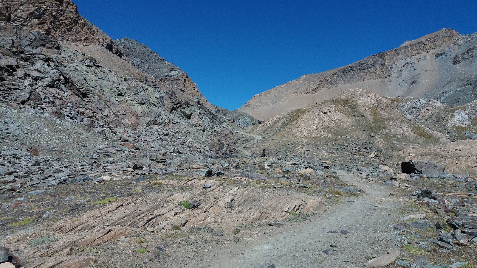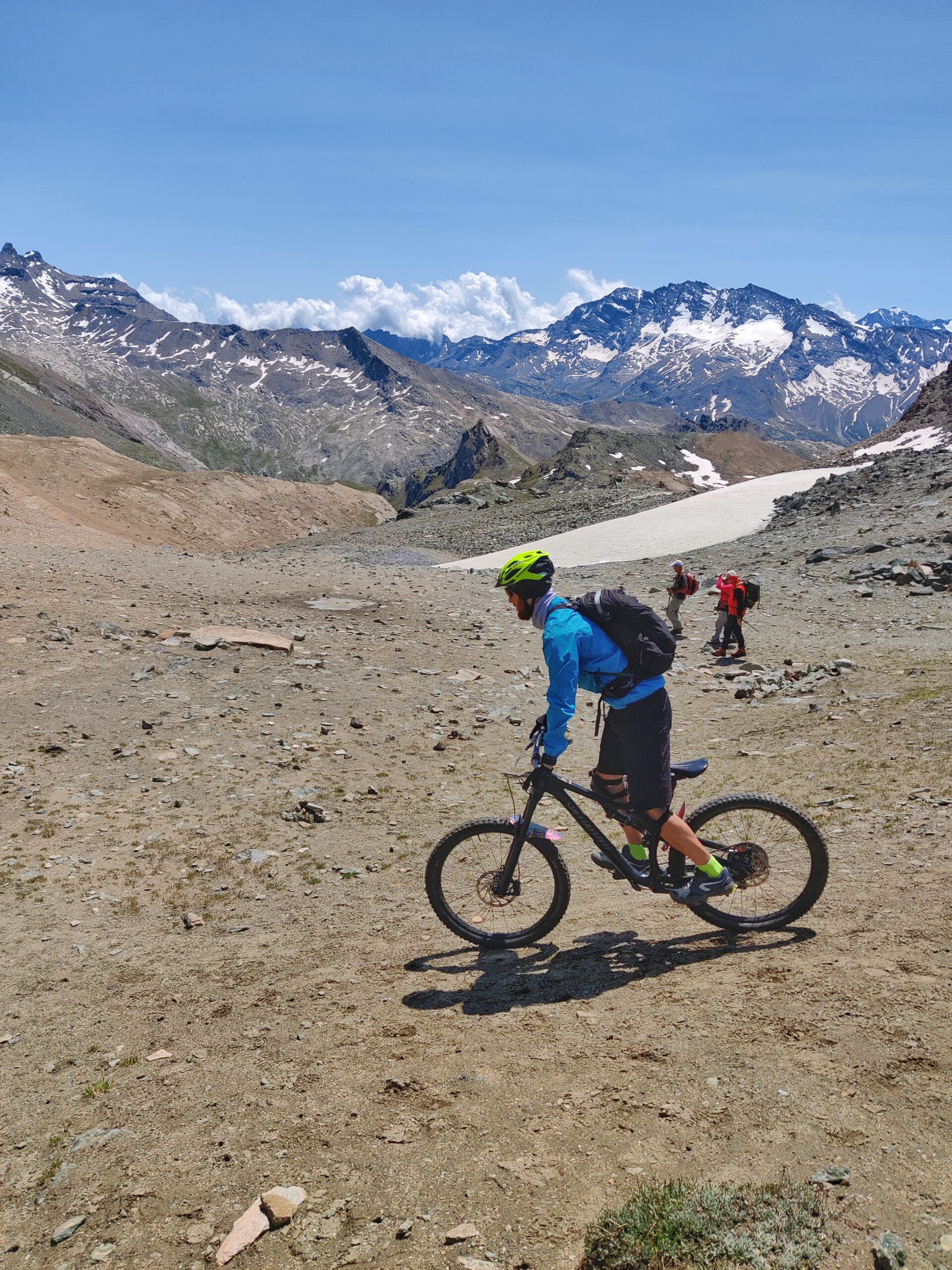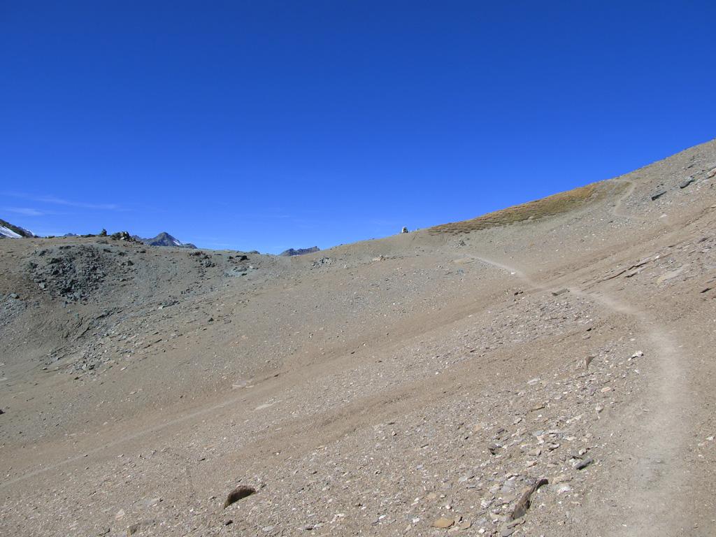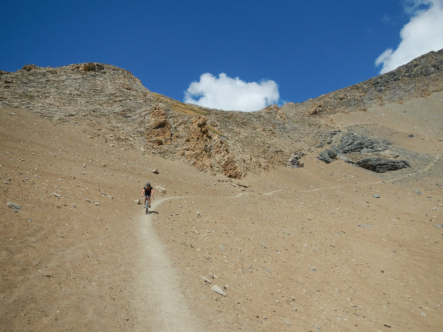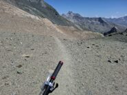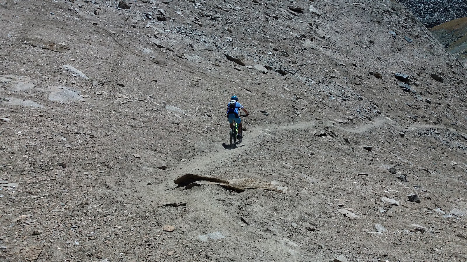 Terminate le rampe i detriti prendono il posto all’erba, e si entra in una conca racchiusa sotto la Punta del Bes. Una breve discesa non ciclabile a causa di grossi massi, e si giunge all’inizio della valletta che proviene dal Col Leynir. L’ambiente cambia ancora, e si risale per i caratteristici ghiaioni di color rossastro. Si incontra una diramazione, conviene seguire il sentiero di sinistra che si infila in una specie di canalone, pedalando ancora un breve tratto mentre i 100 m di dislivello prima del colle occorrerà farli con bici al fianco a causa della pendenza. In prossimità del col Leynir il sentiero quasi pianeggiante consente di pedalare fino ai 3084 m. Dai Piani del Nivolet al colle ciclabilità in salita 85%.