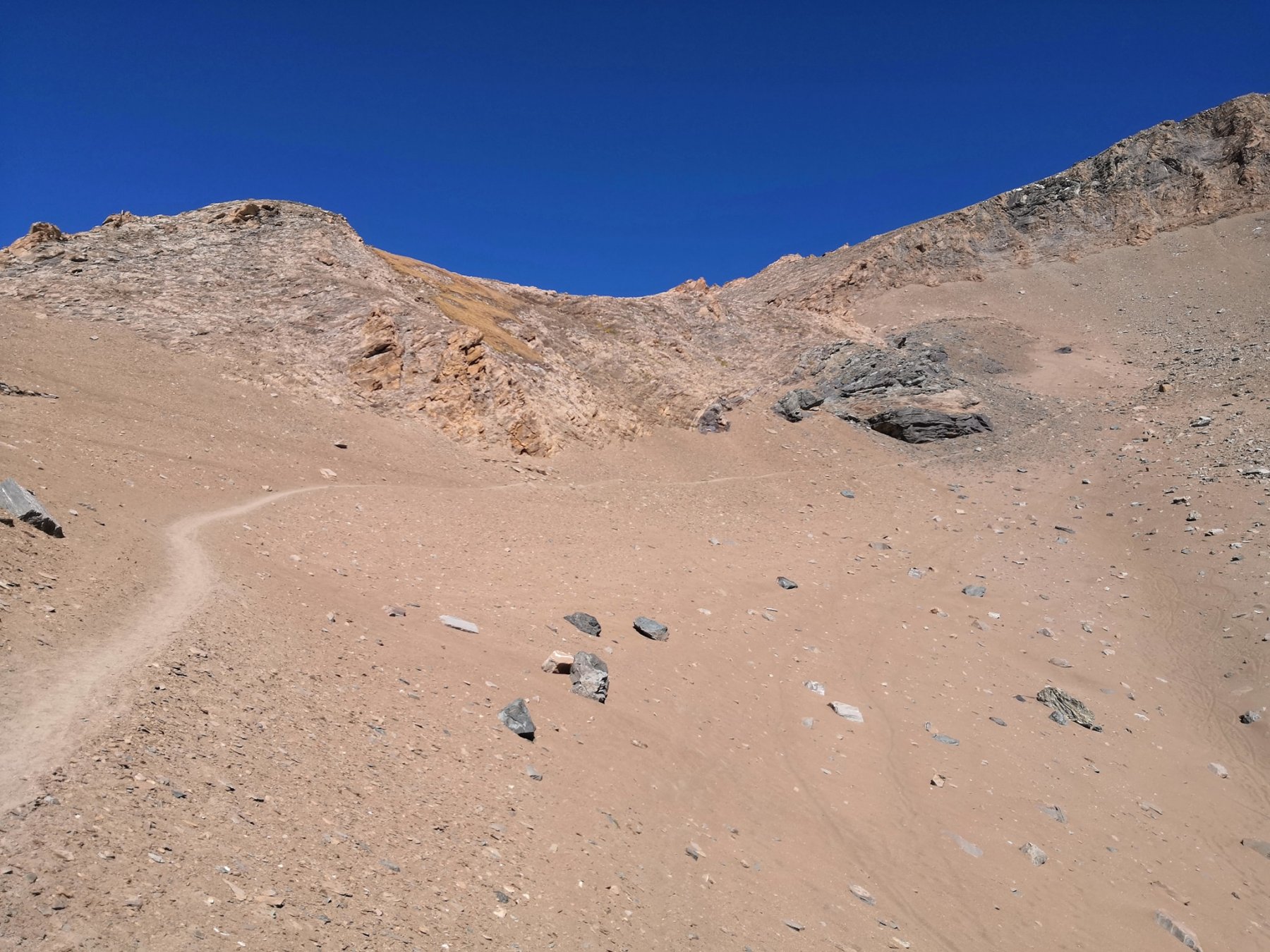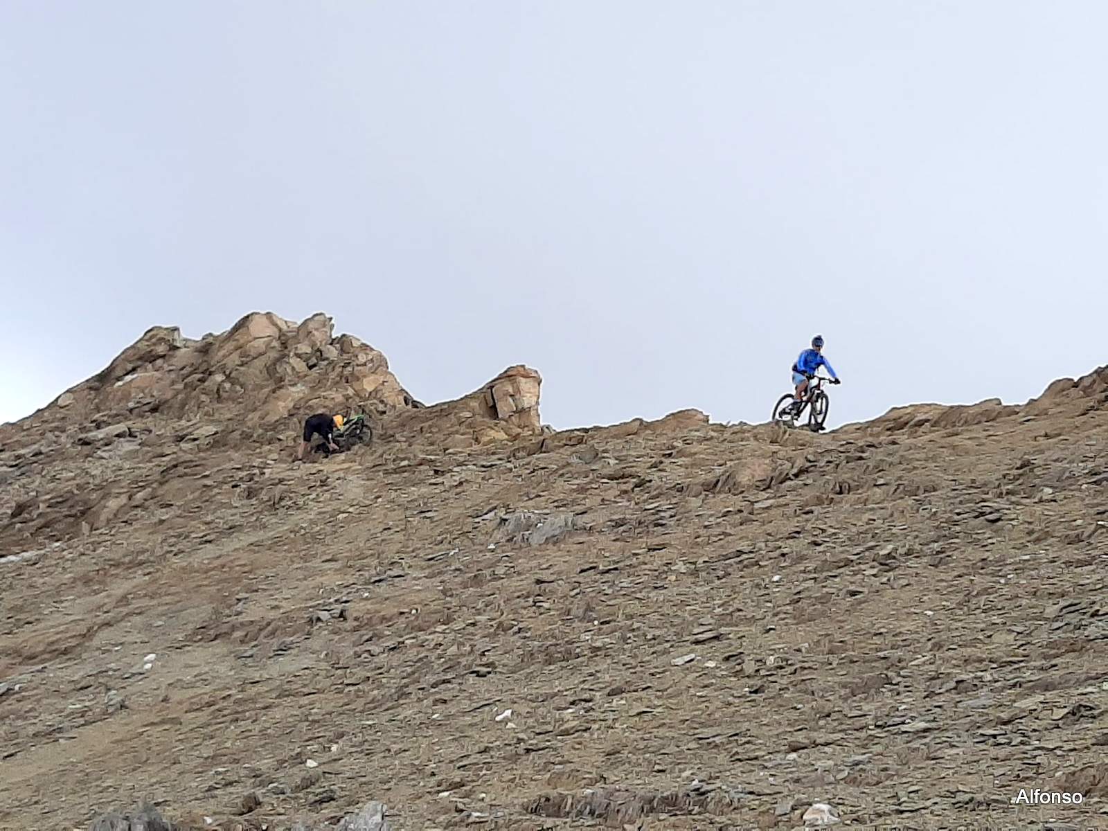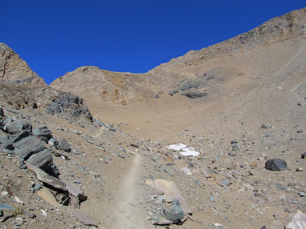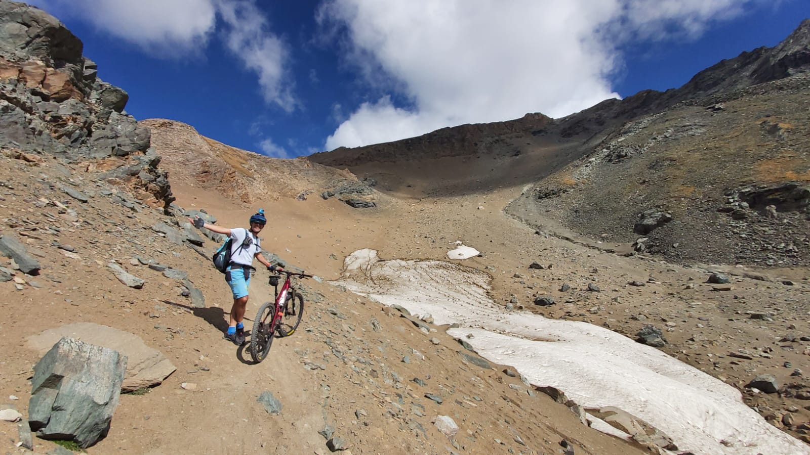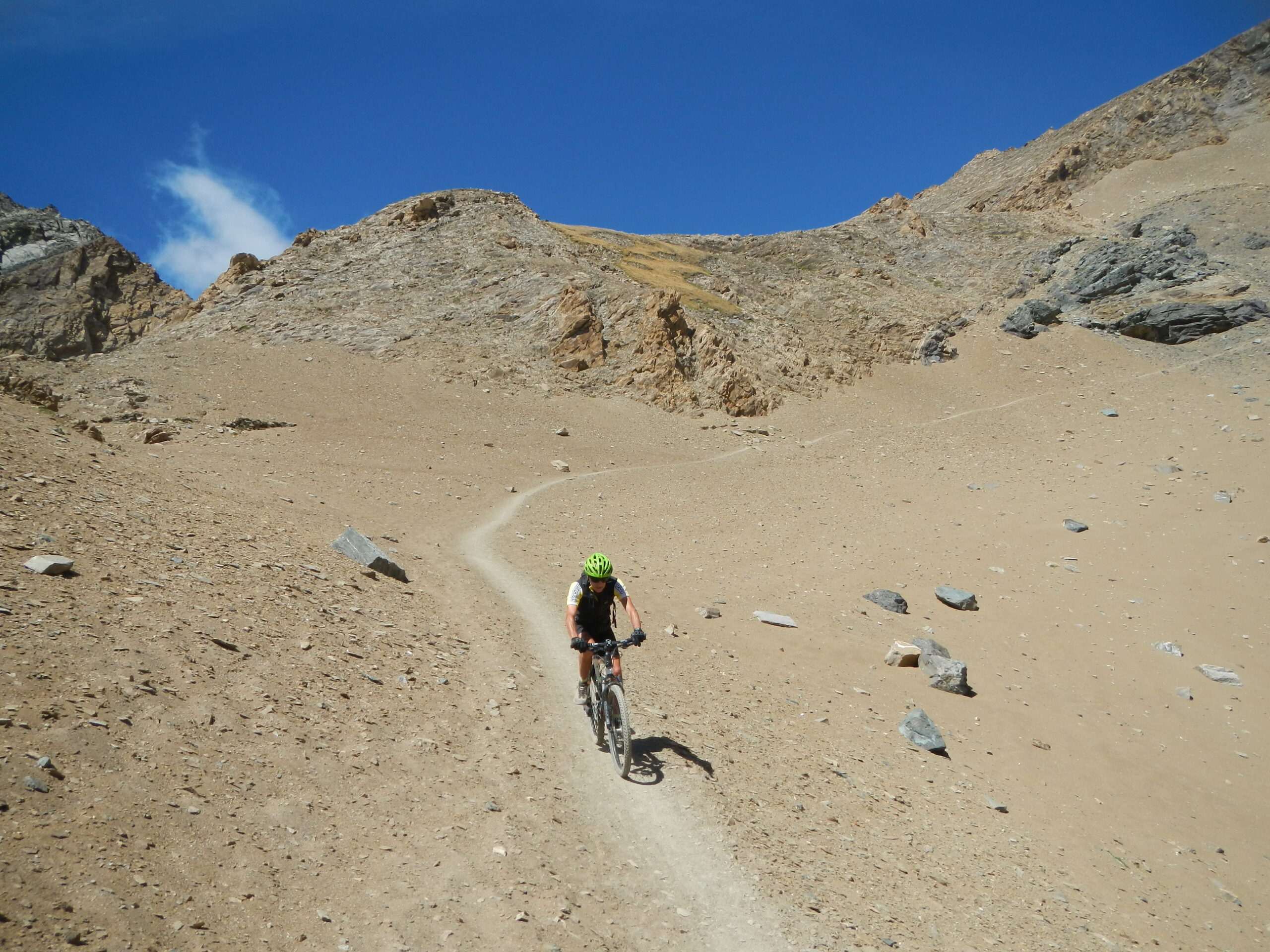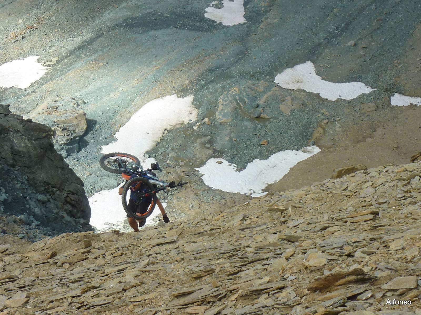 Terminate le rampe i detriti prendono il posto all’erba, e si entra in una conca racchiusa sotto la Punta del Bes. Una breve discesa non ciclabile a causa di grossi massi, e si giunge all’inizio della valletta che proviene dal Col Leynir. L’ambiente cambia ancora, e si risale per i caratteristici ghiaioni di color rossastro. Si incontra una diramazione, conviene seguire il sentiero di sinistra che si infila in una specie di canalone, pedalando ancora un breve tratto mentre i 100 m di dislivello prima del colle occorrerà farli con bici al fianco a causa della pendenza. In prossimità del col Leynir il sentiero quasi pianeggiante consente di pedalare fino ai 3084 m. Dai Piani del Nivolet al colle ciclabilità in salita 85%.