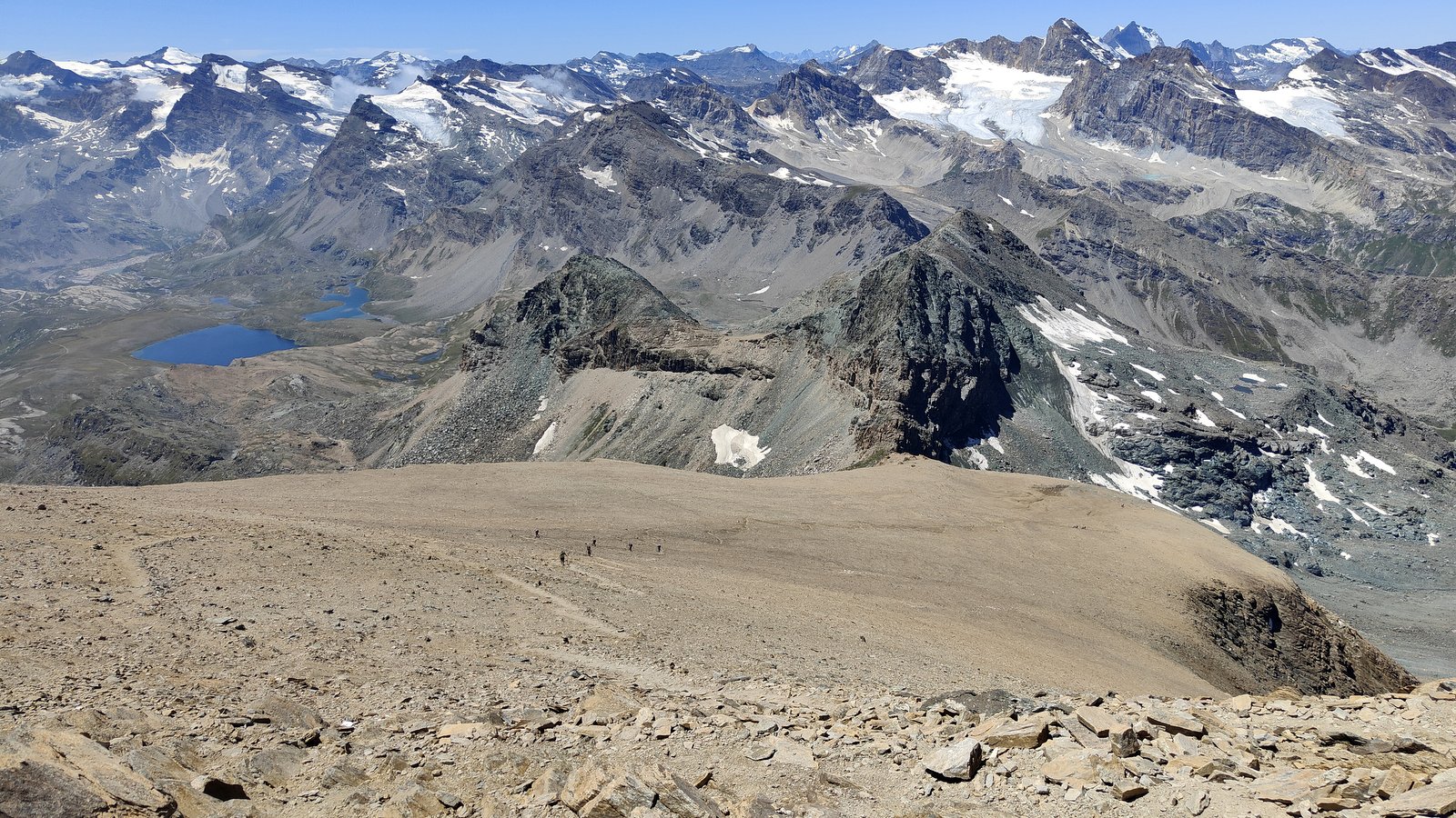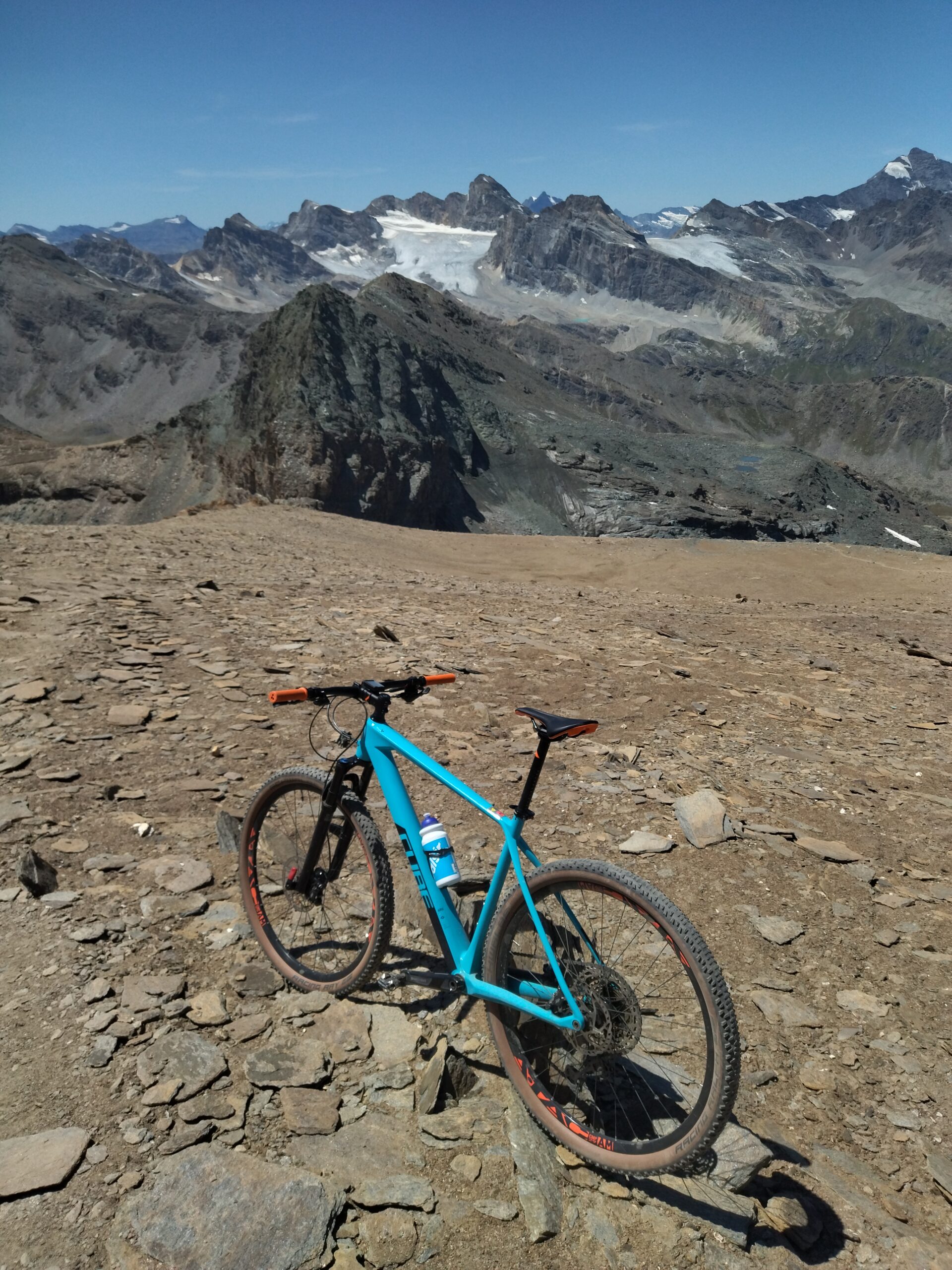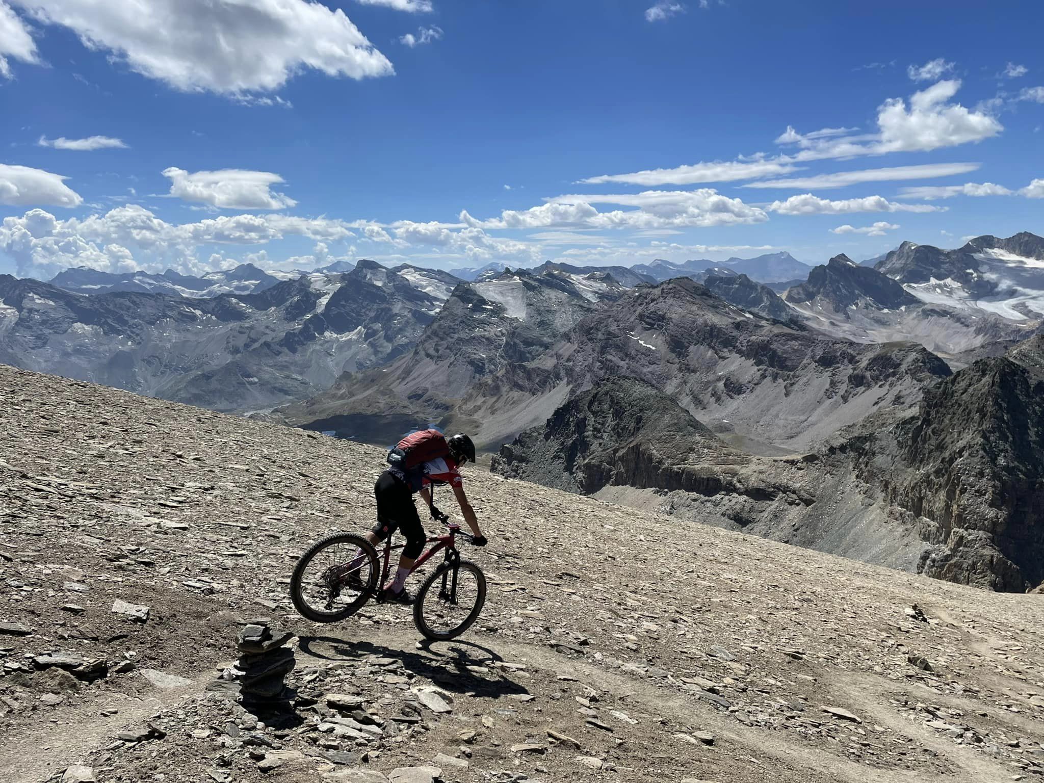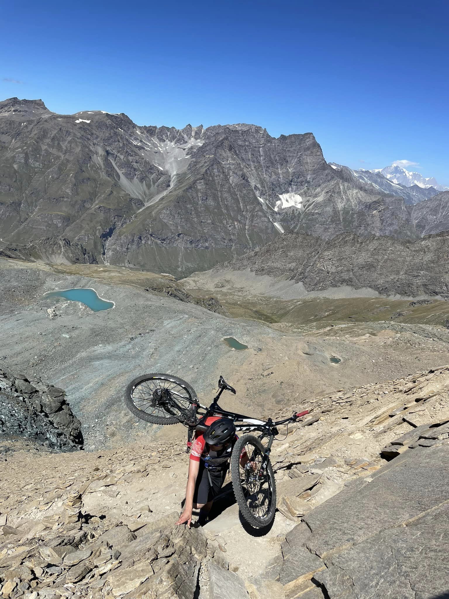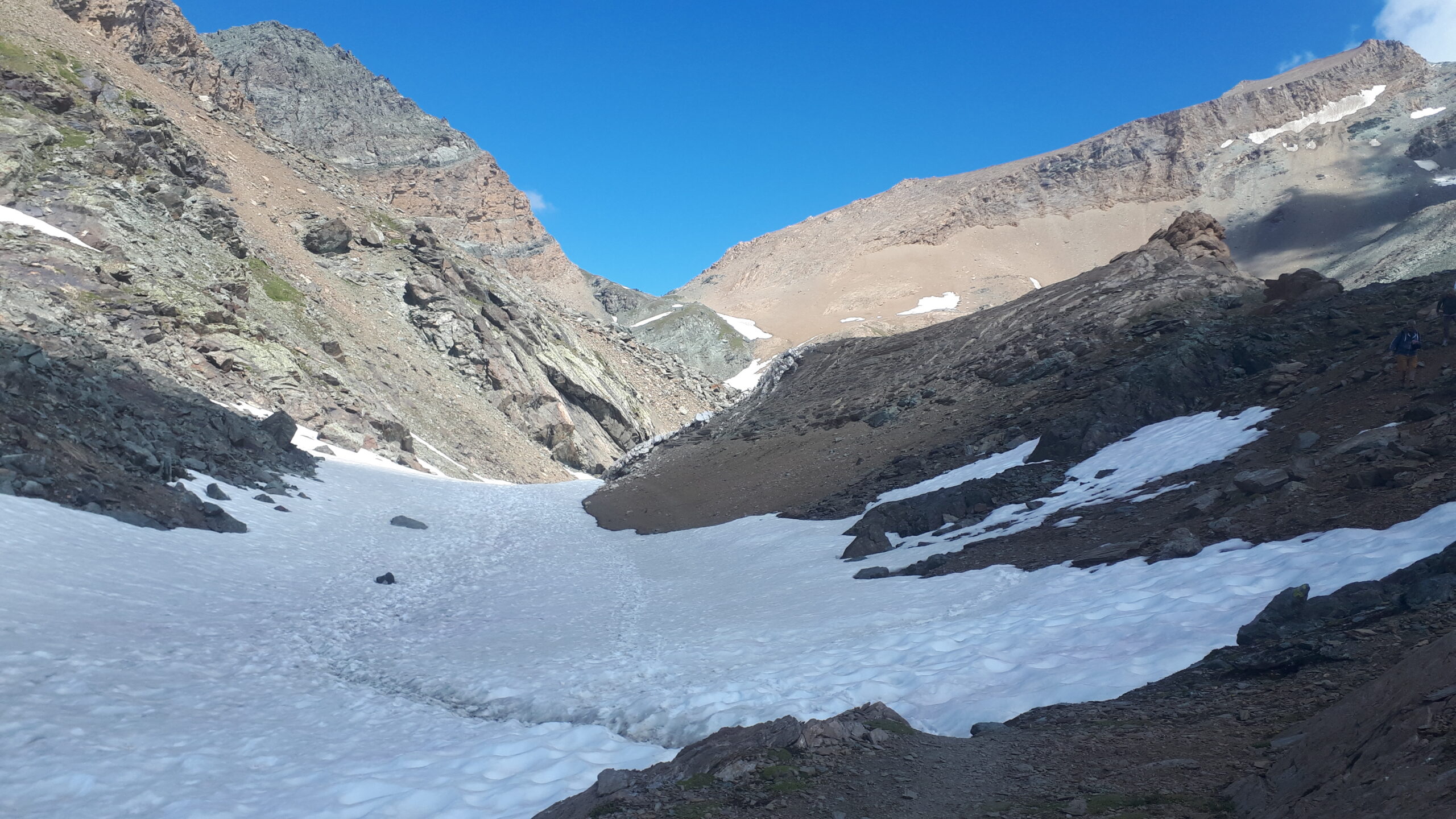 Terminate le rampe i detriti prendono il posto all’erba, e si entra in una conca racchiusa sotto la Punta del Bes. Una breve discesa non ciclabile a causa di grossi massi, e si giunge all’inizio della valletta che proviene dal Col Leynir. L’ambiente cambia ancora, e si risale per i caratteristici ghiaioni di color rossastro. Si incontra una diramazione, conviene seguire il sentiero di sinistra che si infila in una specie di canalone, pedalando ancora un breve tratto mentre i 100 m di dislivello prima del colle occorrerà farli con bici al fianco a causa della pendenza. In prossimità del col Leynir il sentiero quasi pianeggiante consente di pedalare fino ai 3084 m. Dai Piani del Nivolet al colle ciclabilità in salita 85%.