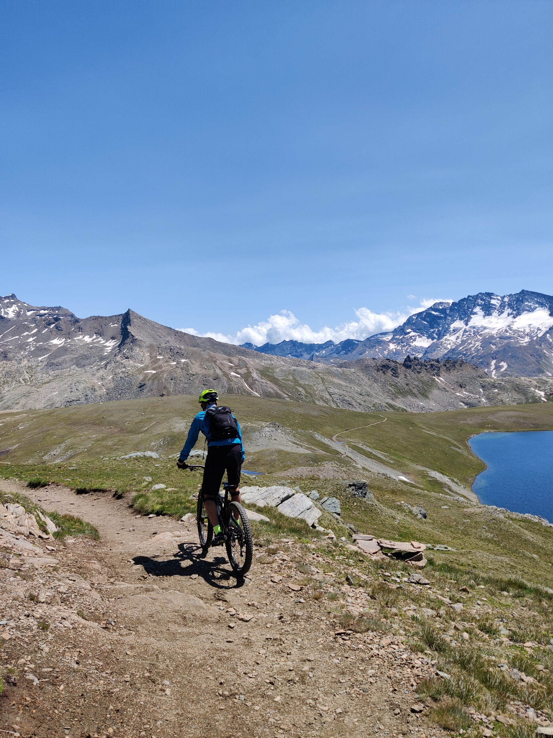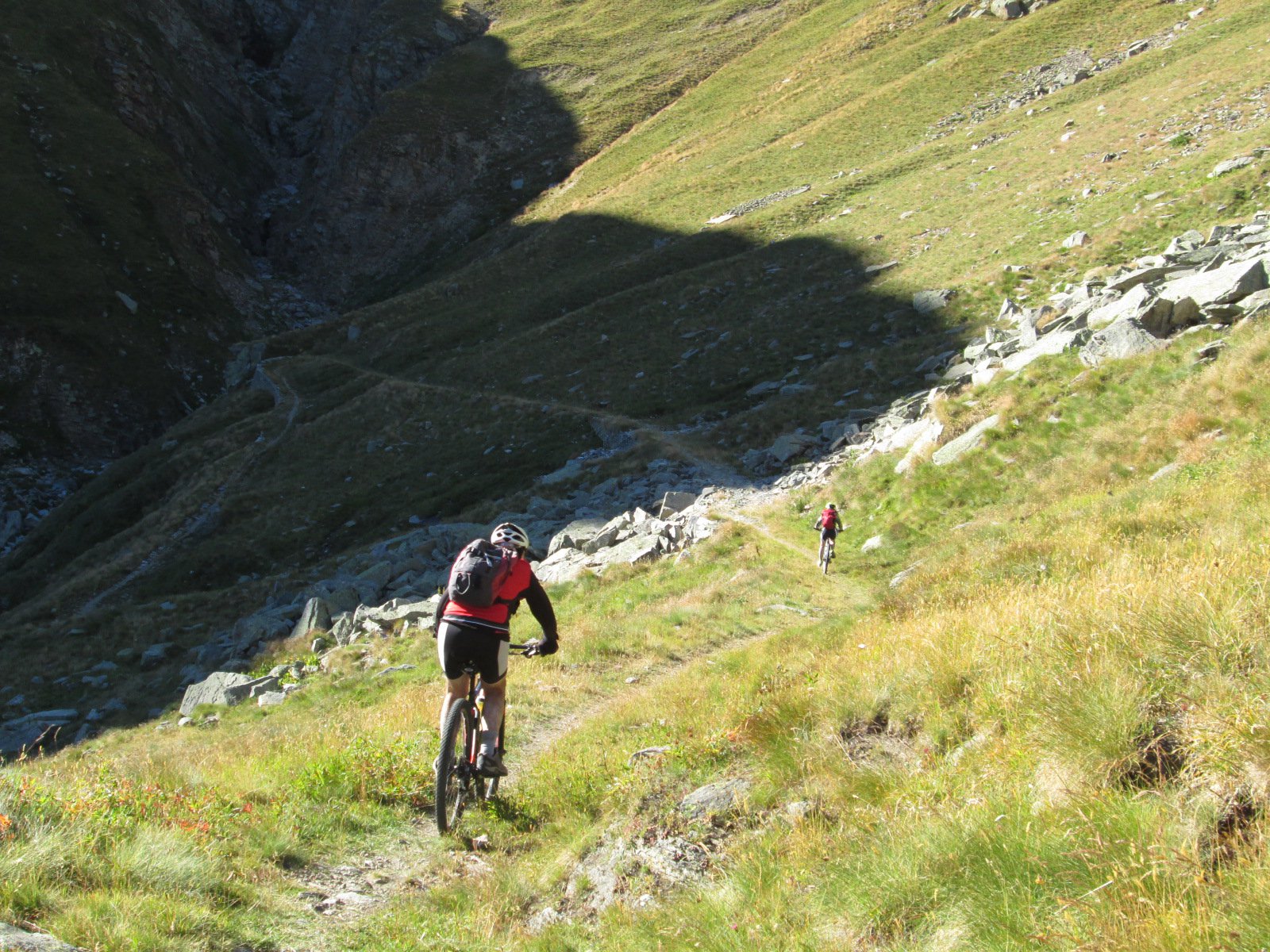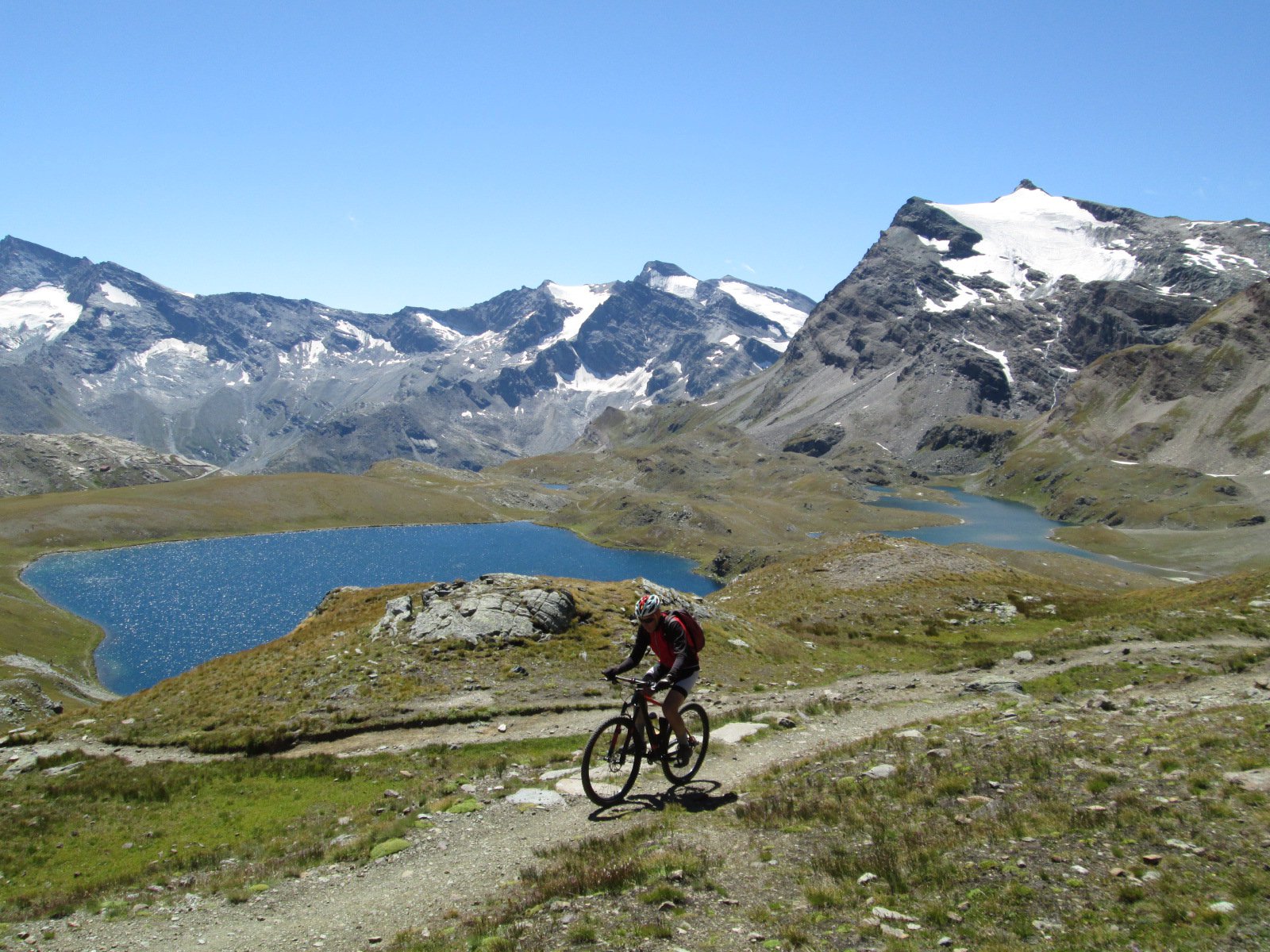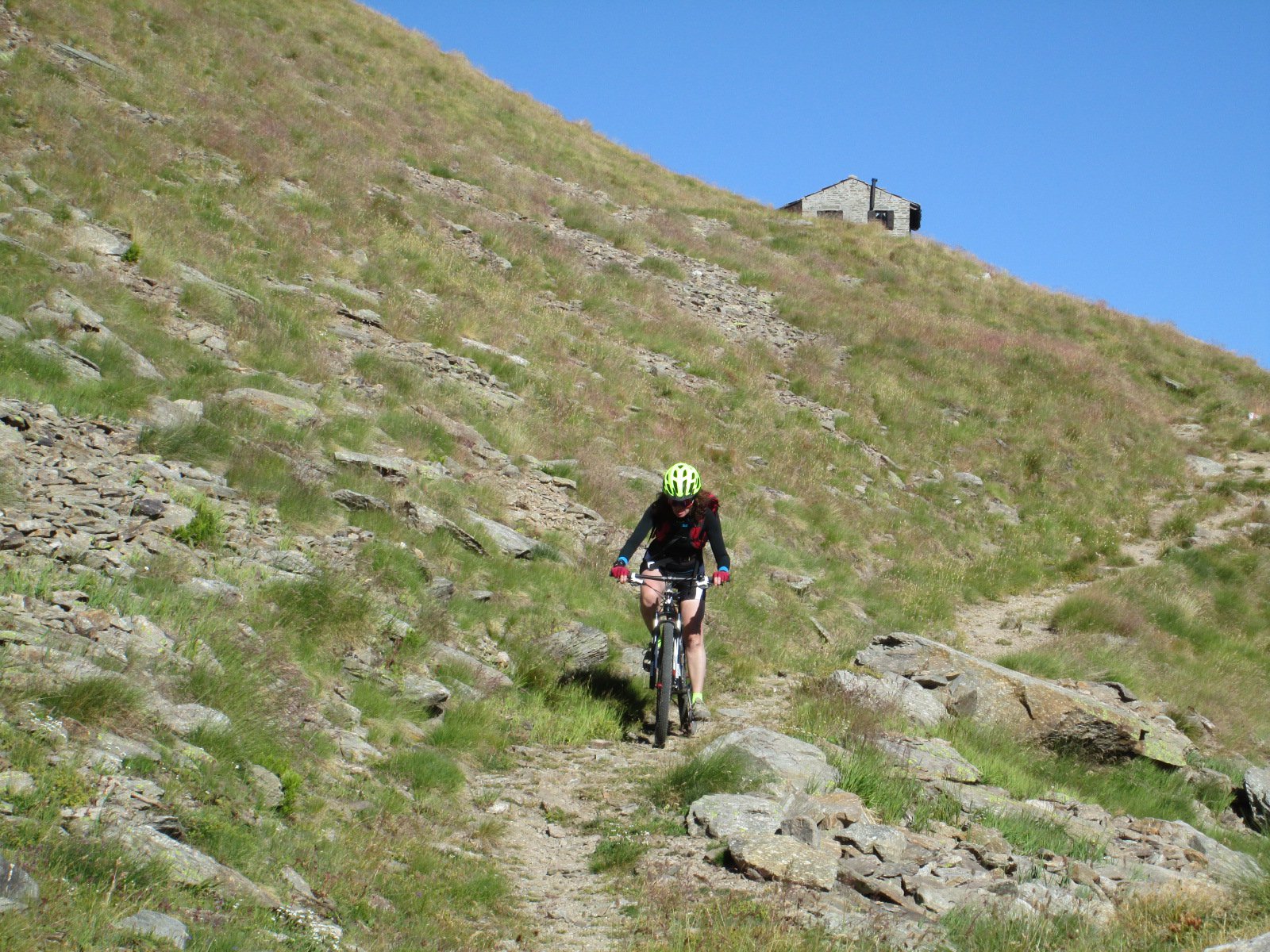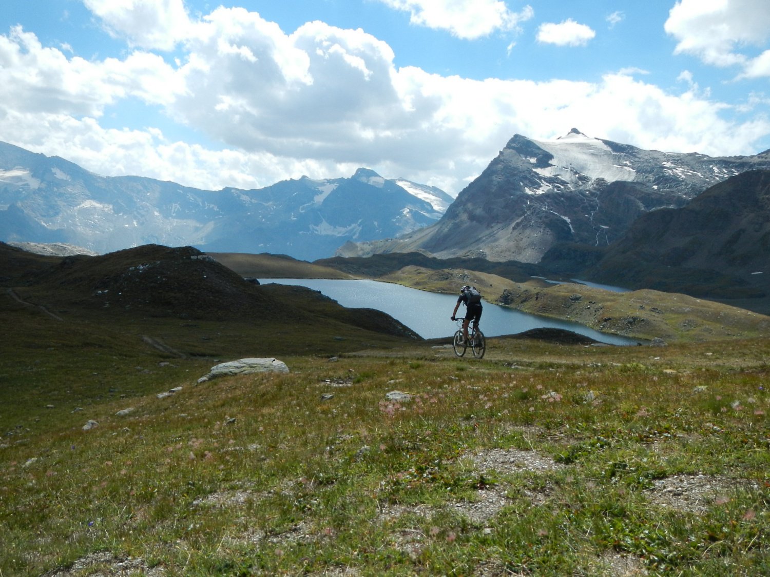 Si deve superare bici a fianco un primo breve tratto con pendenze eccessive e qualche sasso, poi raggiunto un pianoro erboso si può salire in sella ed in breve piegando a destra toccare un alpeggio. Il sentiero prosegue a monte del fabbricato, con una rampa più ripida ma pedalabile, poi inizia lo spettacolo; si pedala su vaste praterie solcate da questo stupendo sentiero terroso, costeggiando in alto a destra il Lago Rosset.