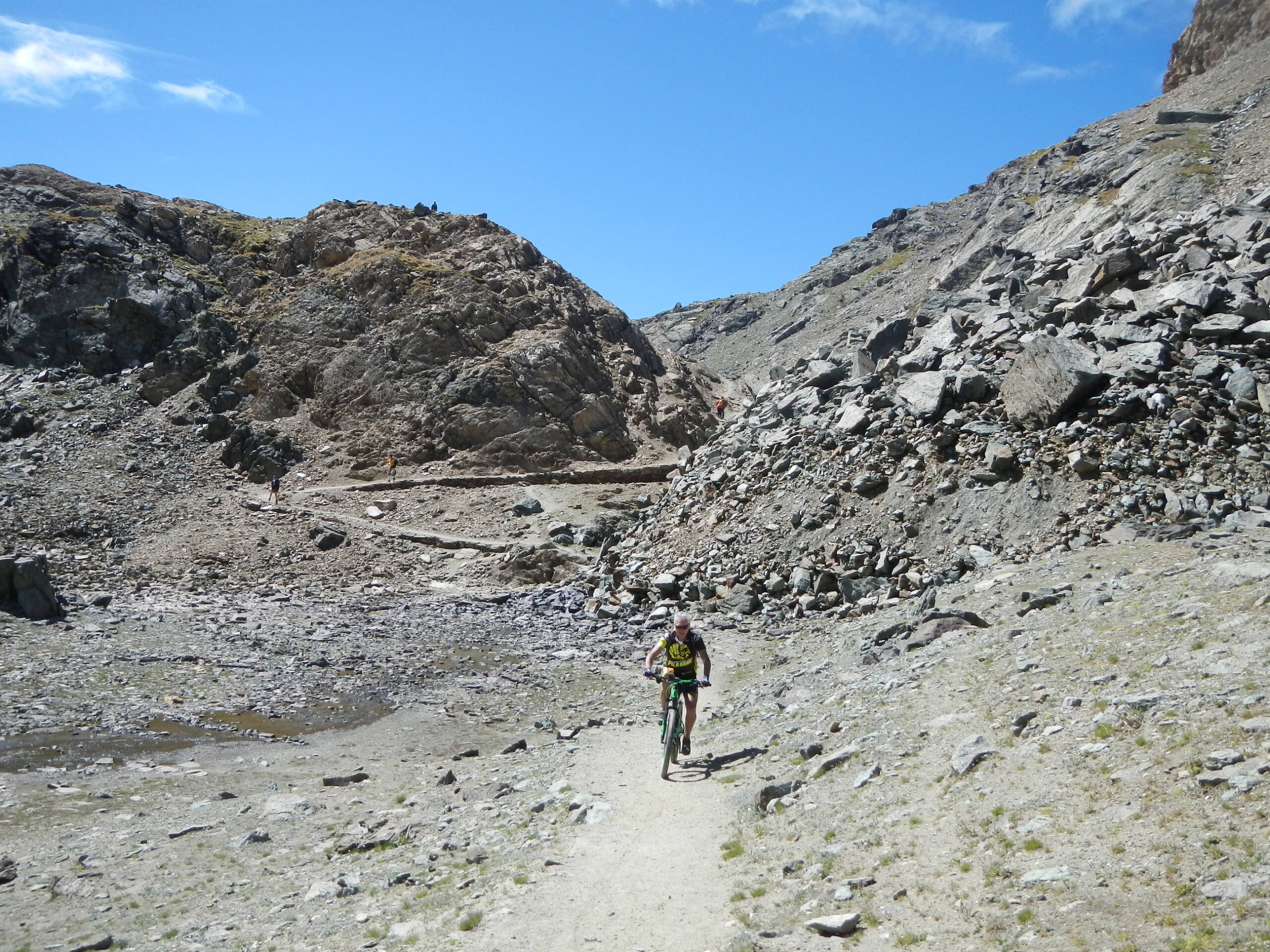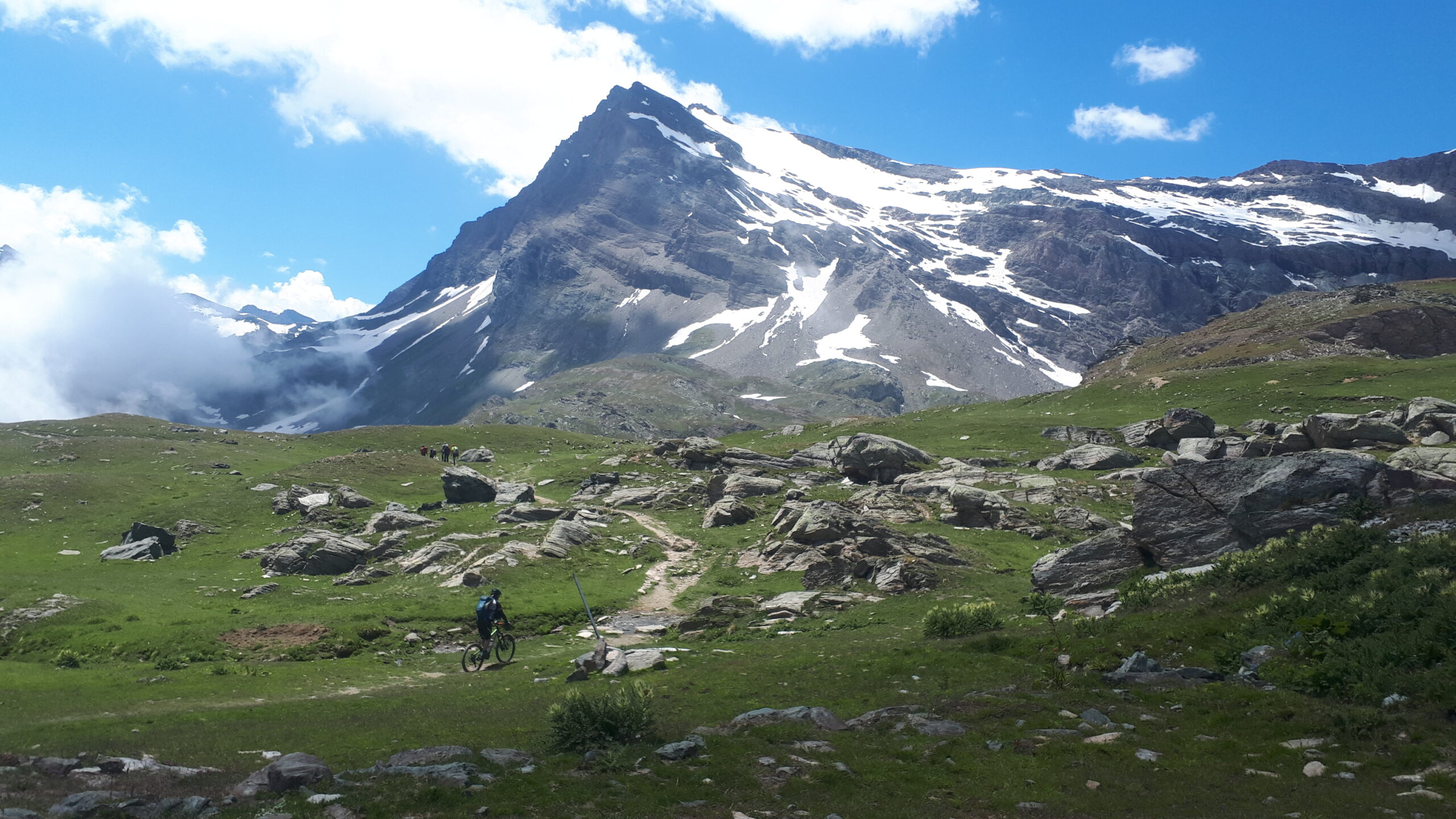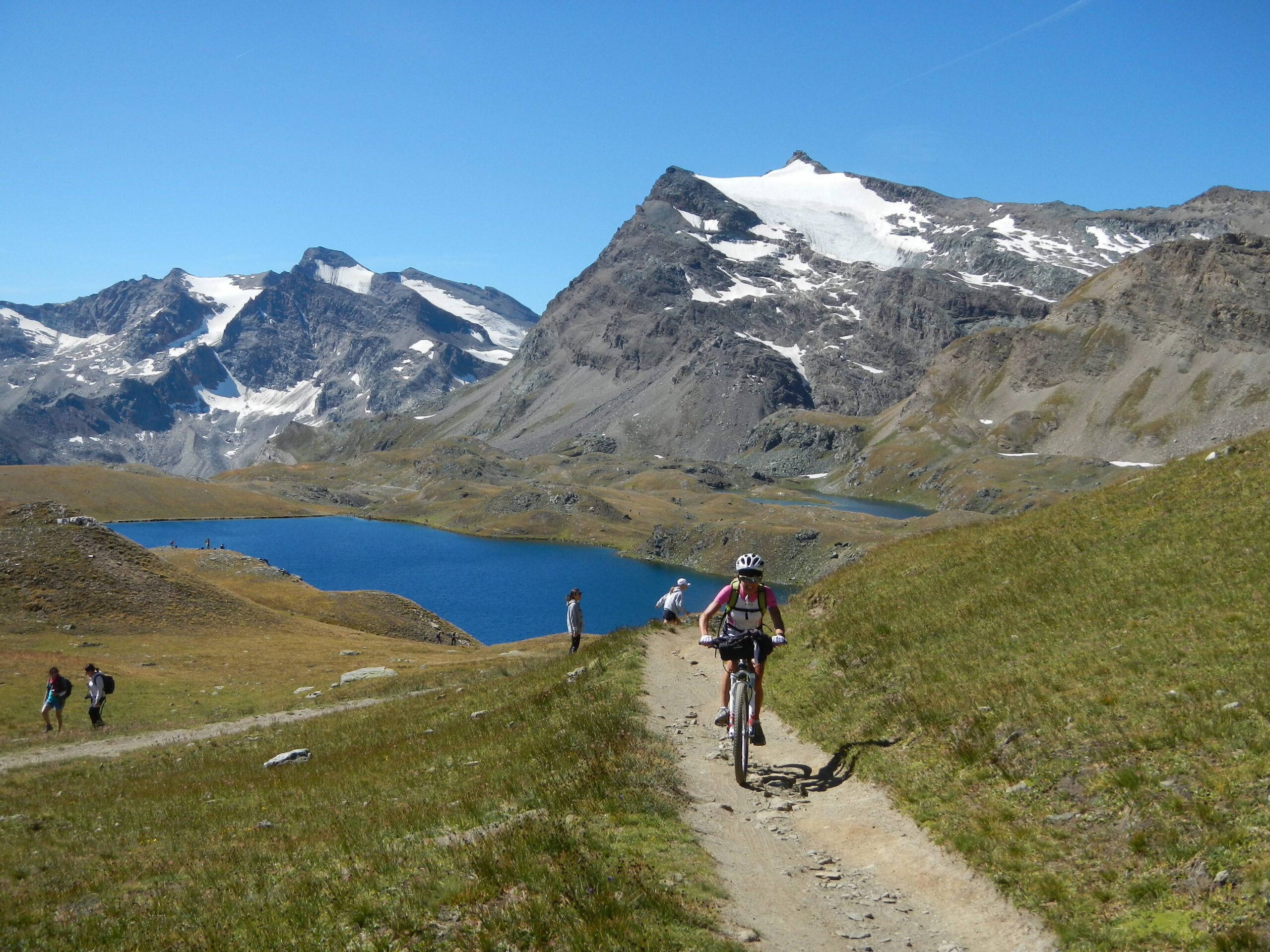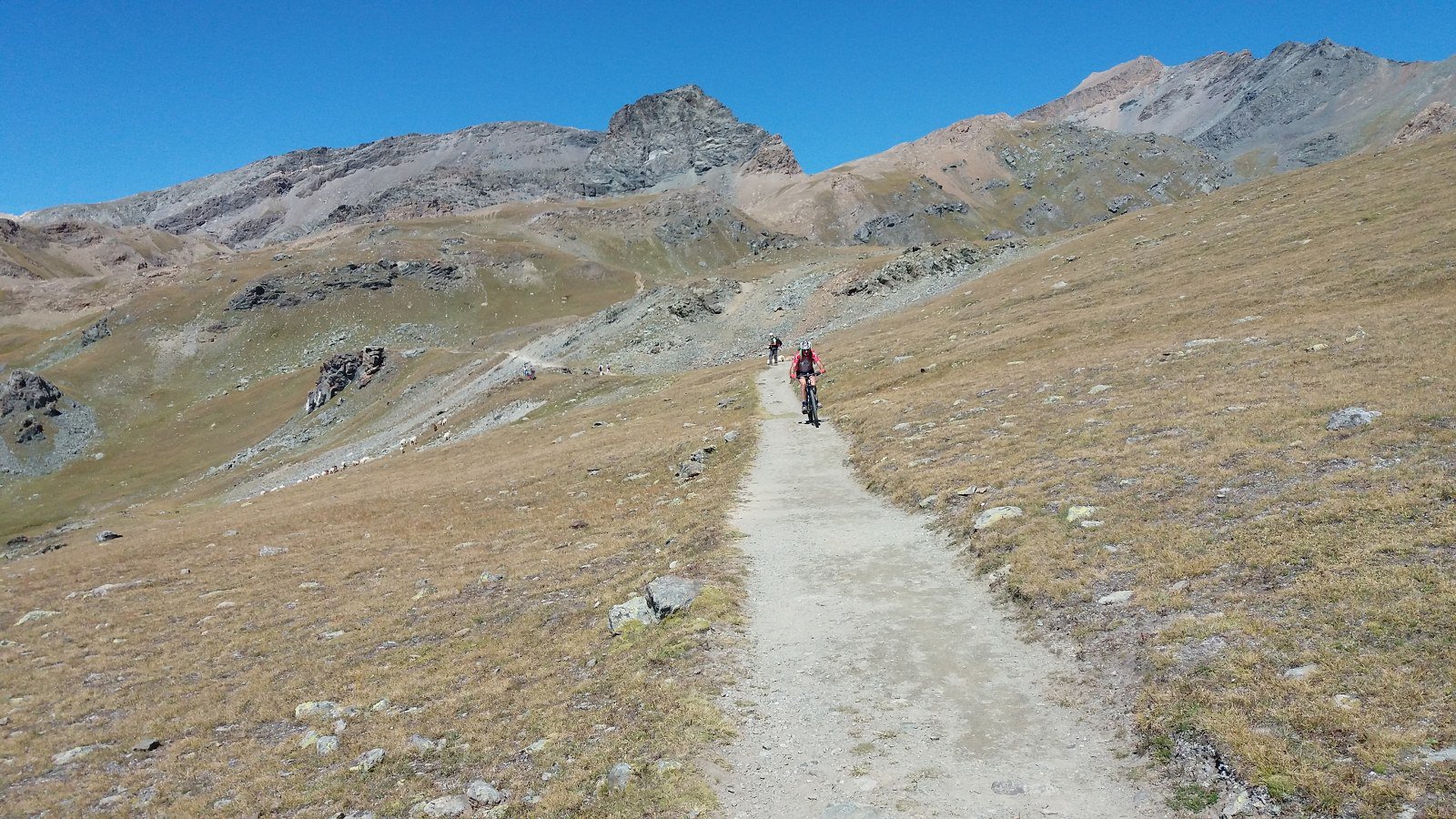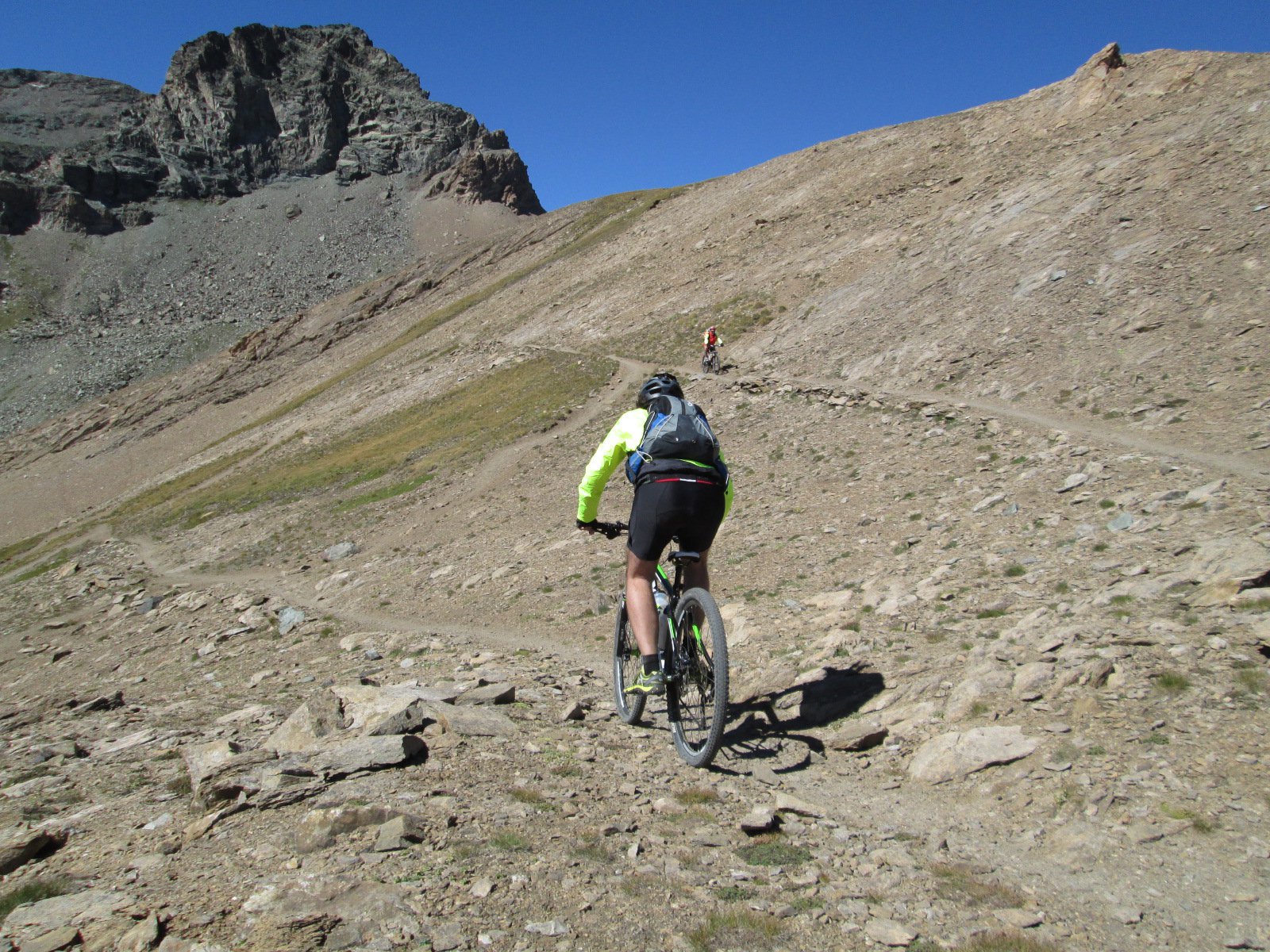 Si deve superare bici a fianco un primo breve tratto con pendenze eccessive e qualche sasso, poi raggiunto un pianoro erboso si può salire in sella ed in breve piegando a destra toccare un alpeggio. Il sentiero prosegue a monte del fabbricato, con una rampa più ripida ma pedalabile, poi inizia lo spettacolo; si pedala su vaste praterie solcate da questo stupendo sentiero terroso, costeggiando in alto a destra il Lago Rosset.
