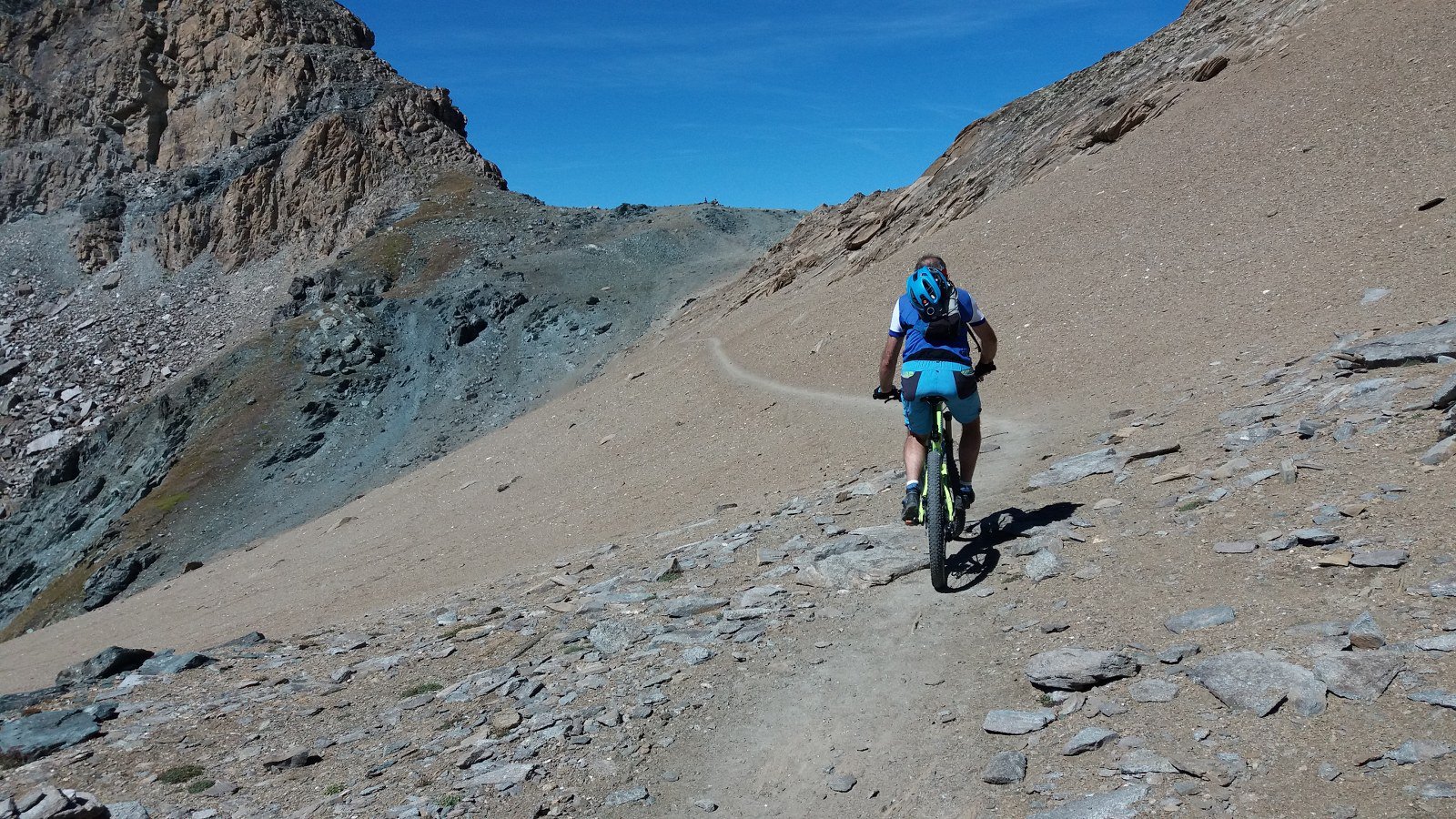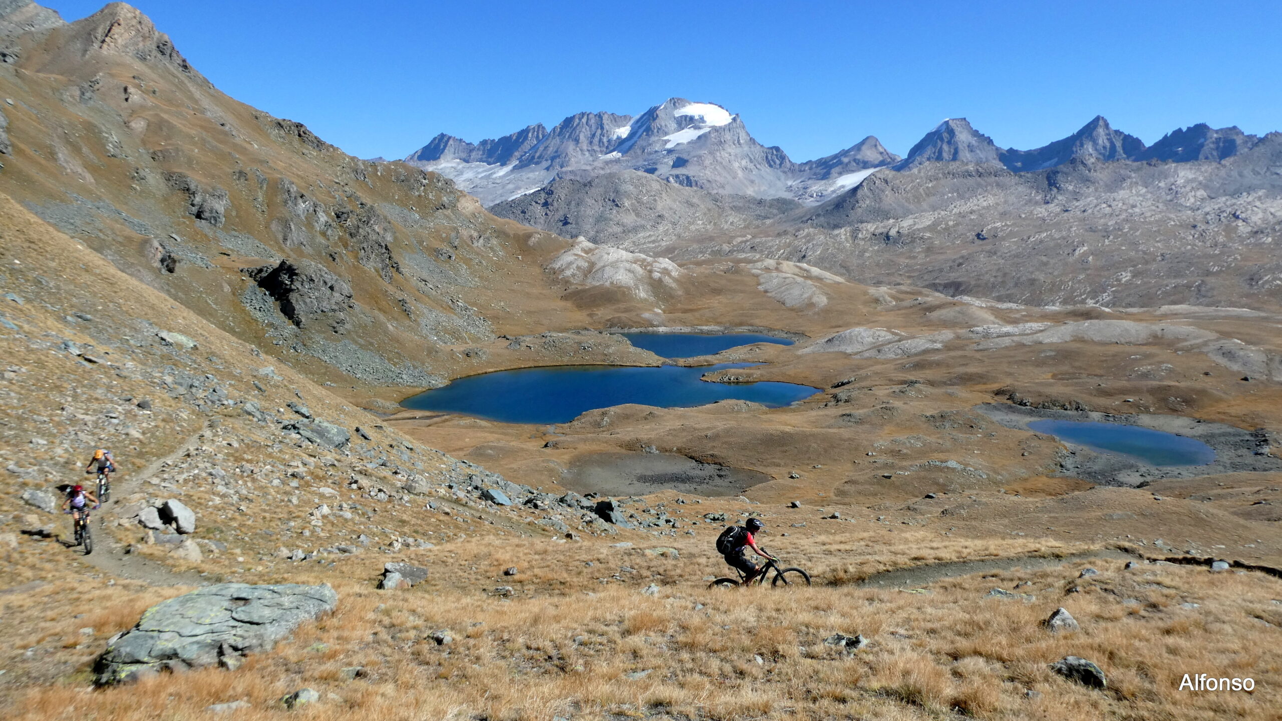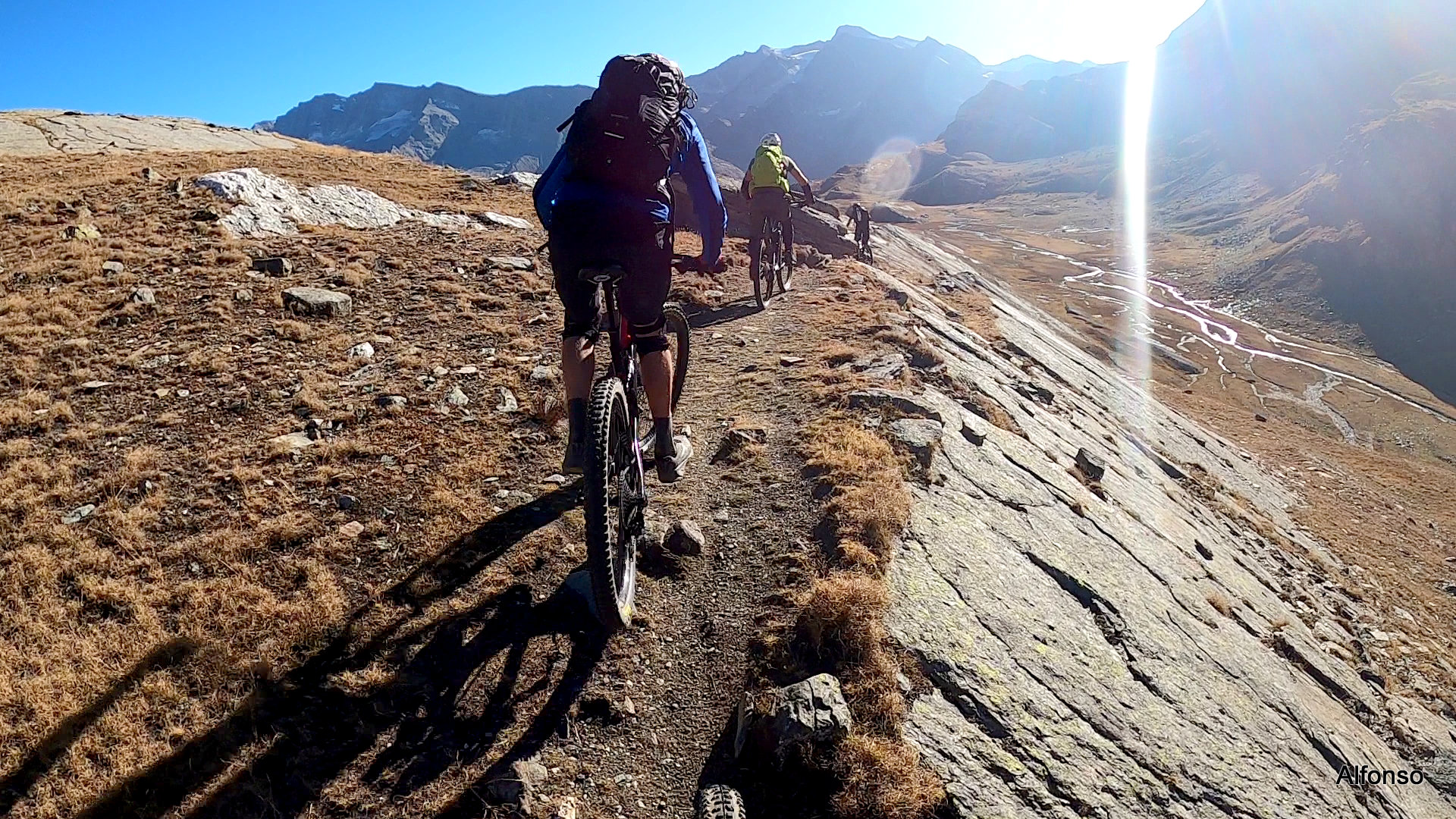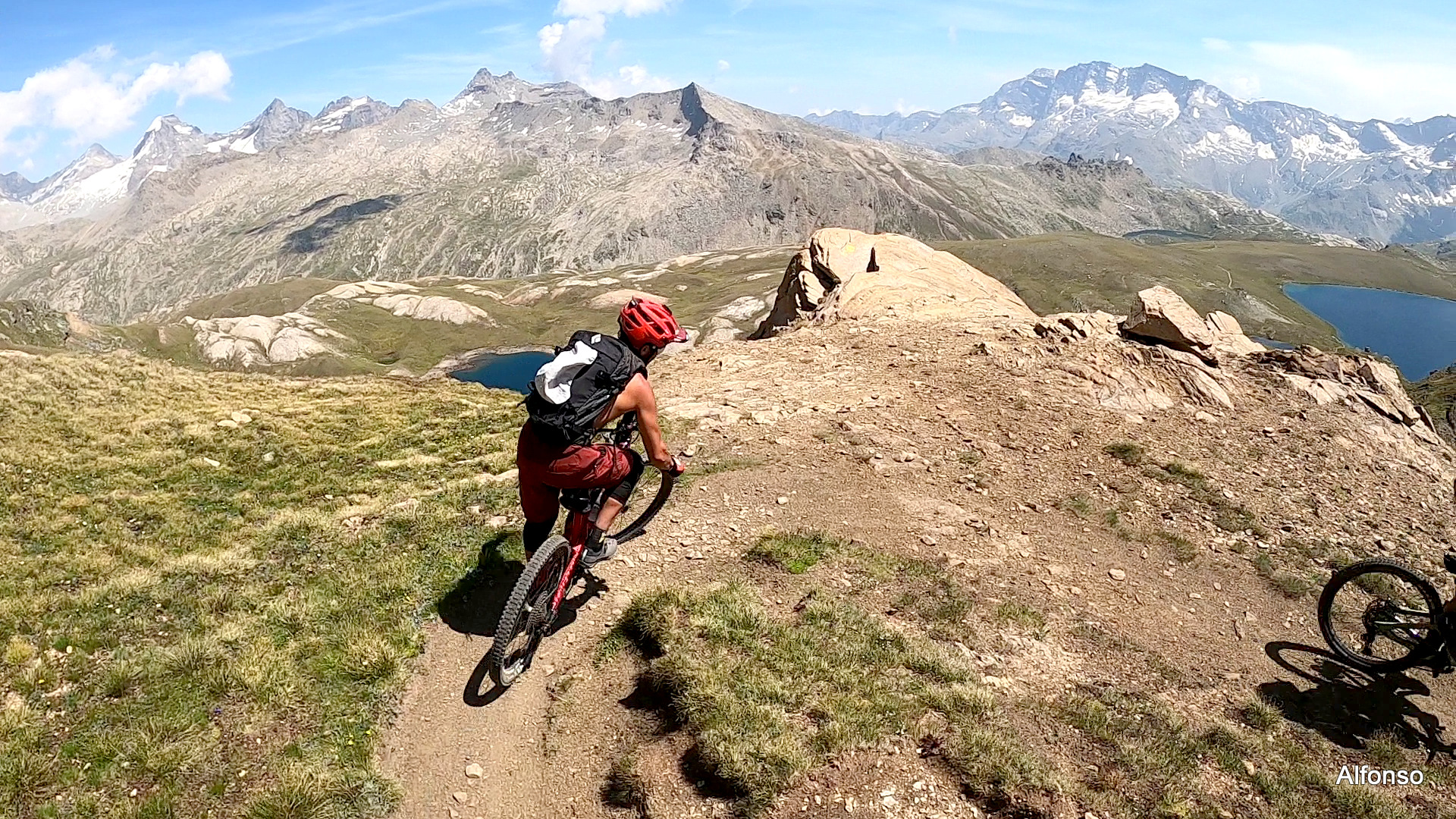 Si deve superare bici a fianco un primo breve tratto con pendenze eccessive e qualche sasso, poi raggiunto un pianoro erboso si può salire in sella ed in breve piegando a destra toccare un alpeggio. Il sentiero prosegue a monte del fabbricato, con una rampa più ripida ma pedalabile, poi inizia lo spettacolo; si pedala su vaste praterie solcate da questo stupendo sentiero terroso, costeggiando in alto a destra il Lago Rosset.