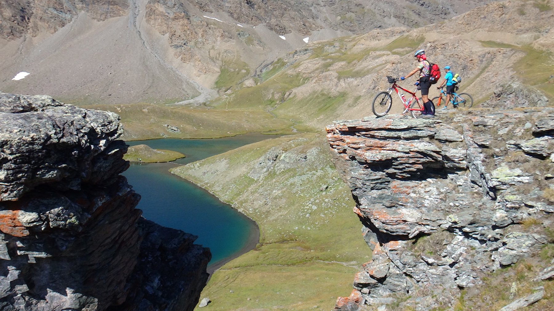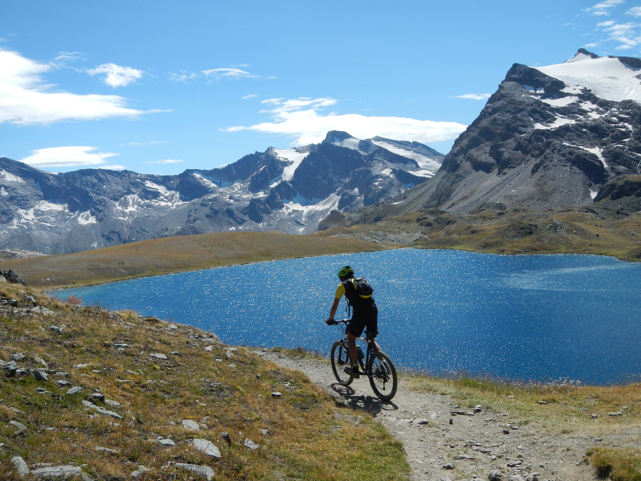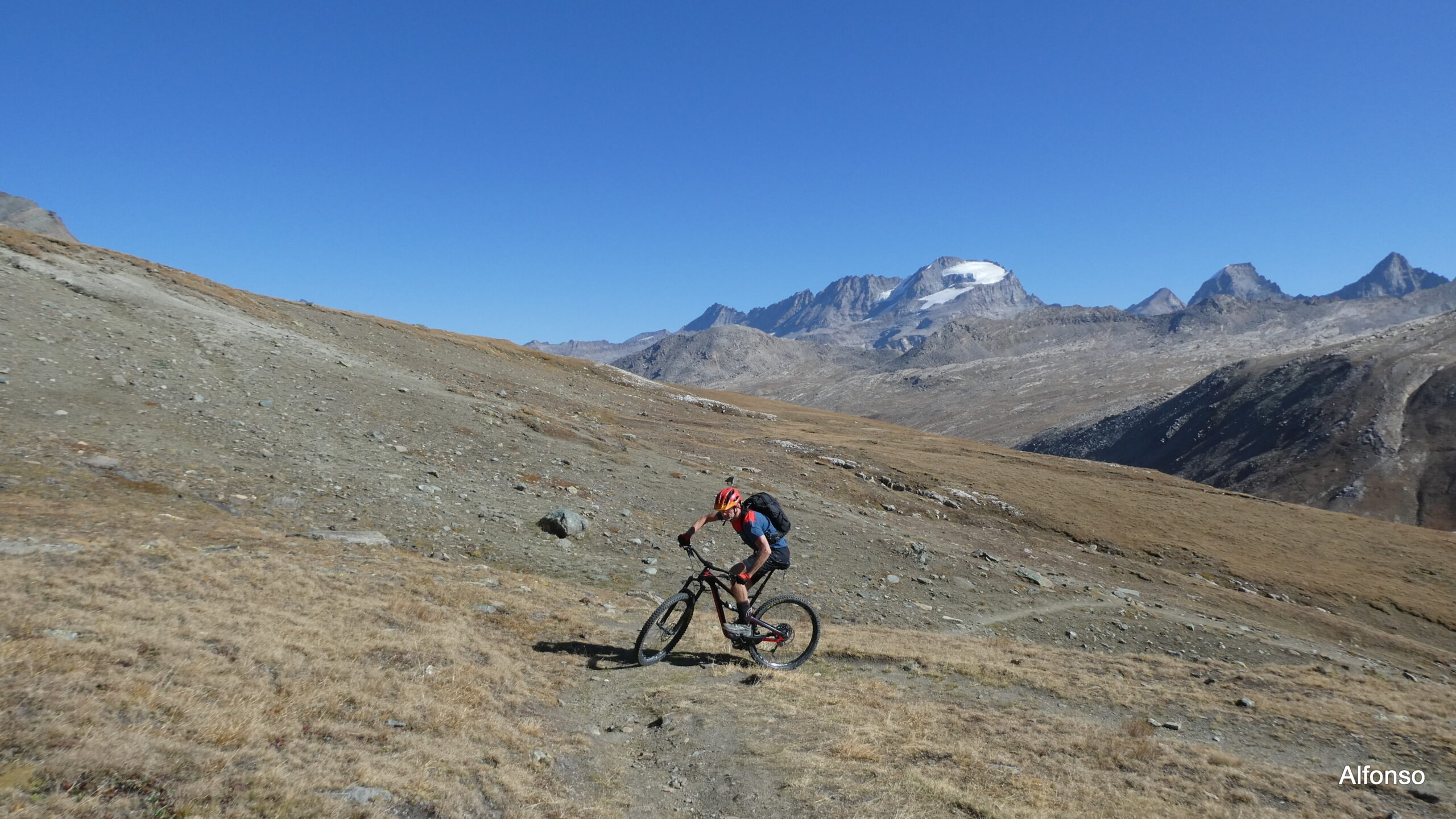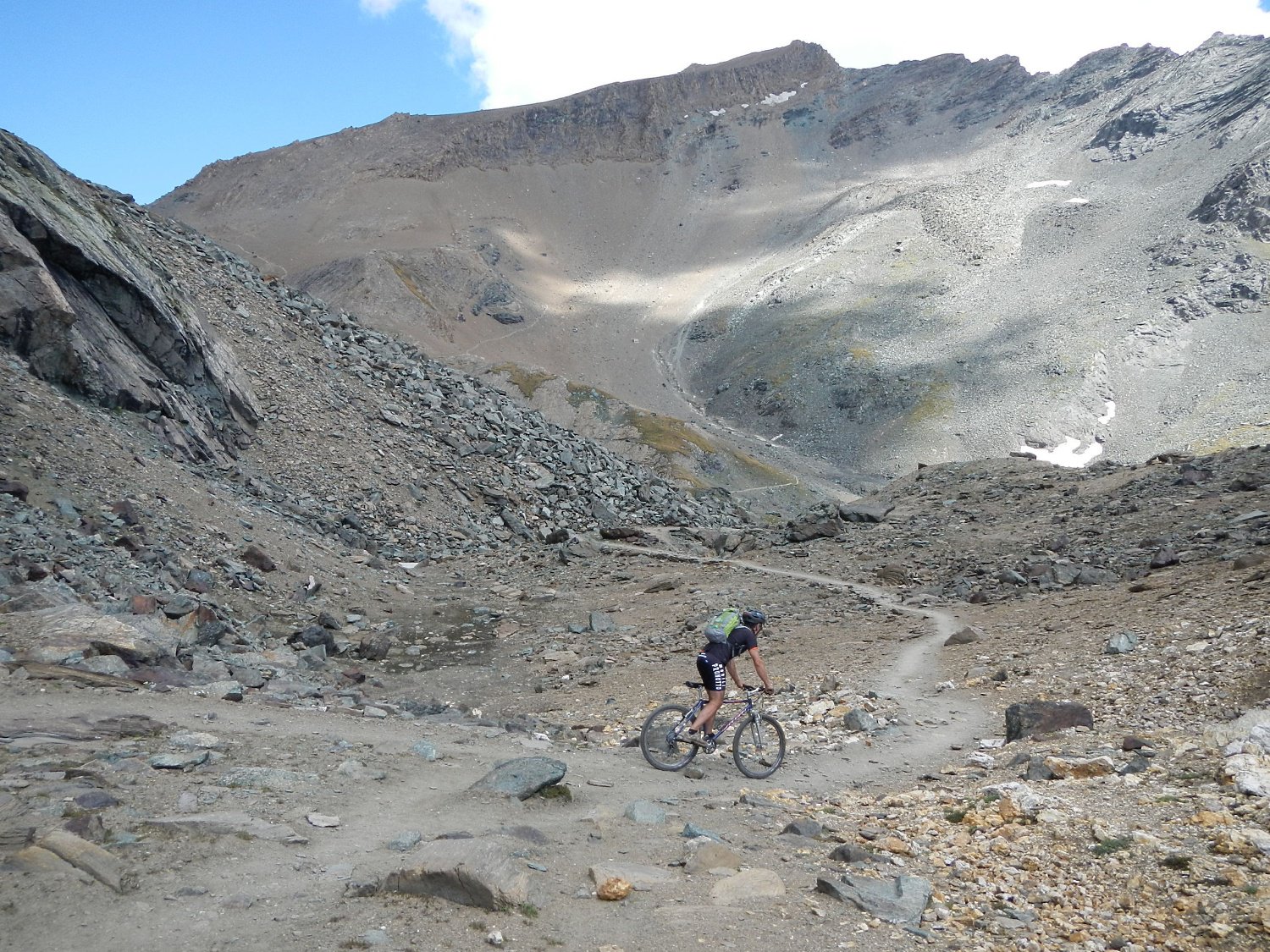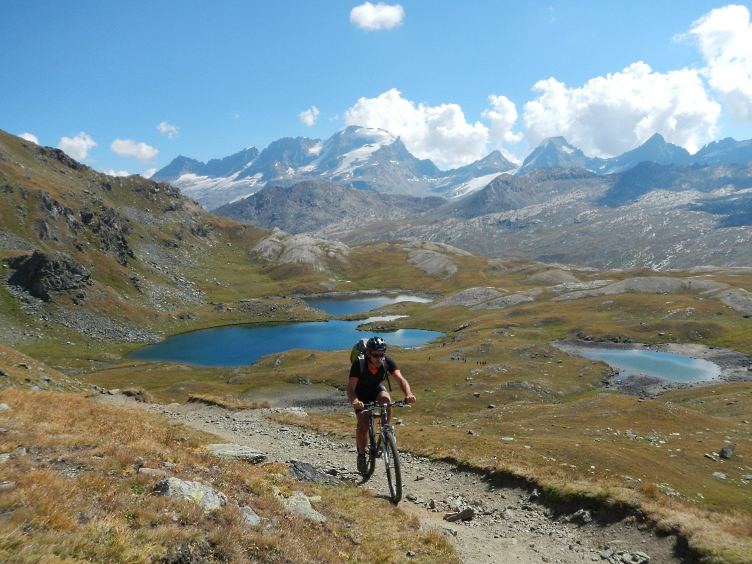 Si deve superare bici a fianco un primo breve tratto con pendenze eccessive e qualche sasso, poi raggiunto un pianoro erboso si può salire in sella ed in breve piegando a destra toccare un alpeggio. Il sentiero prosegue a monte del fabbricato, con una rampa più ripida ma pedalabile, poi inizia lo spettacolo; si pedala su vaste praterie solcate da questo stupendo sentiero terroso, costeggiando in alto a destra il Lago Rosset.