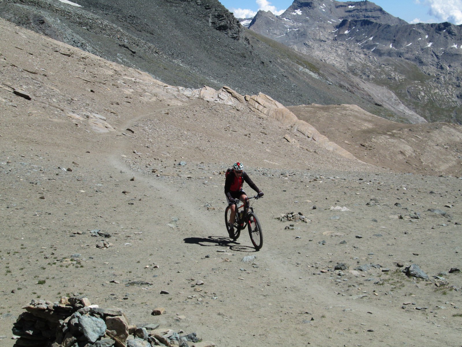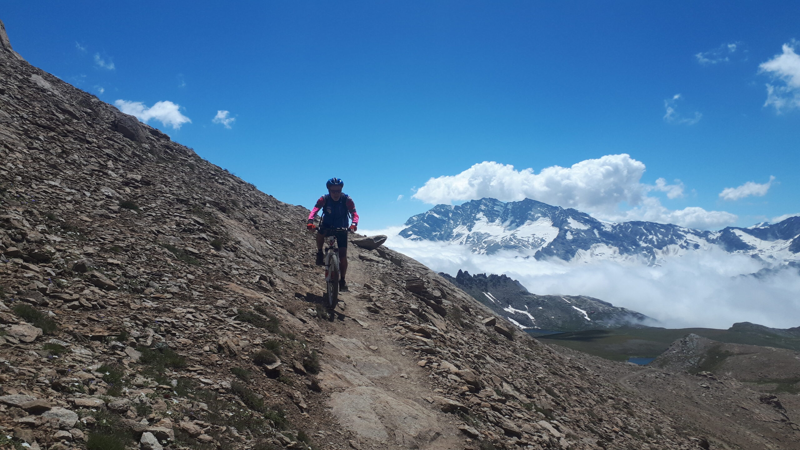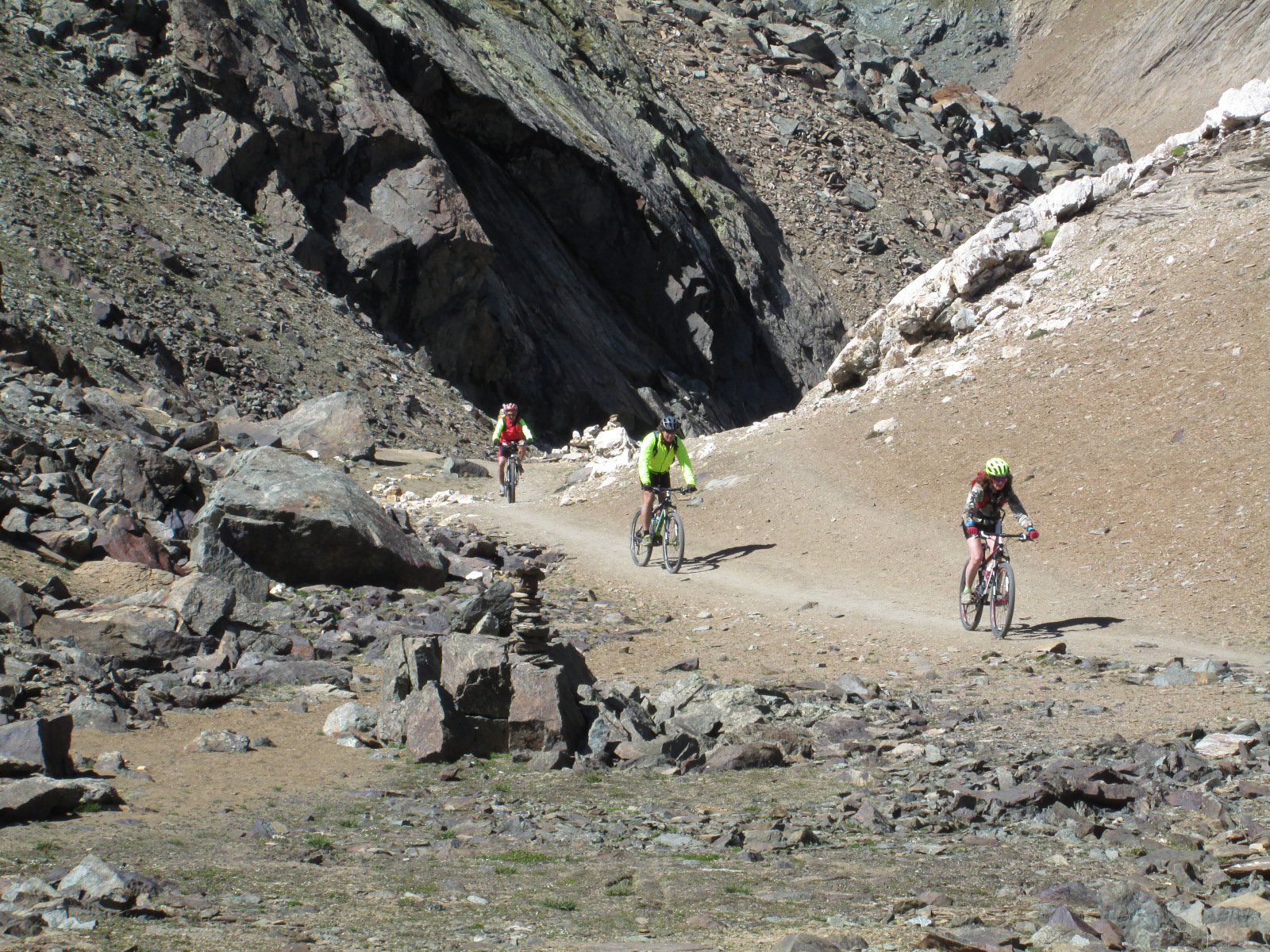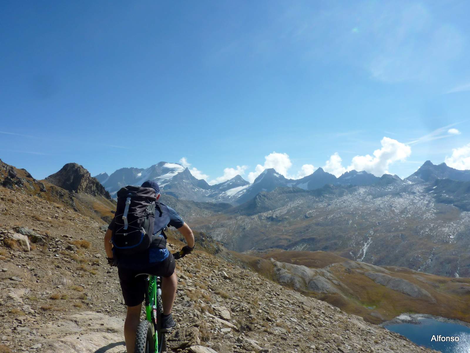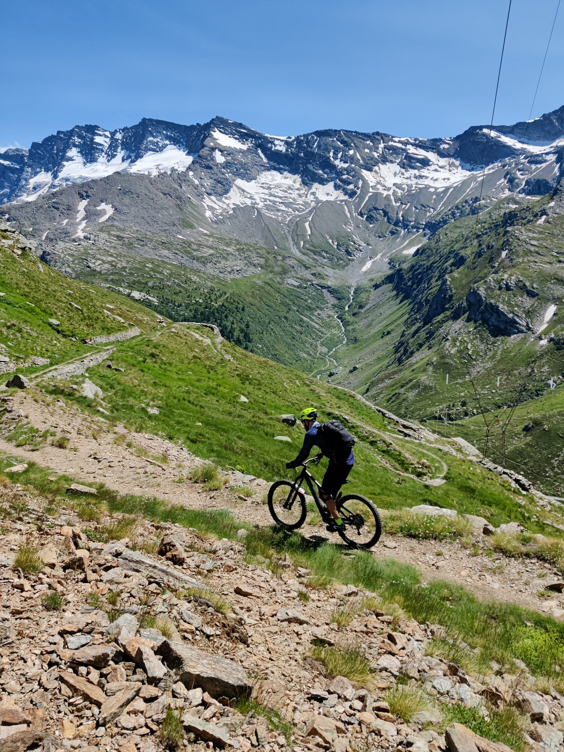 Si deve superare bici a fianco un primo breve tratto con pendenze eccessive e qualche sasso, poi raggiunto un pianoro erboso si può salire in sella ed in breve piegando a destra toccare un alpeggio. Il sentiero prosegue a monte del fabbricato, con una rampa più ripida ma pedalabile, poi inizia lo spettacolo; si pedala su vaste praterie solcate da questo stupendo sentiero terroso, costeggiando in alto a destra il Lago Rosset.