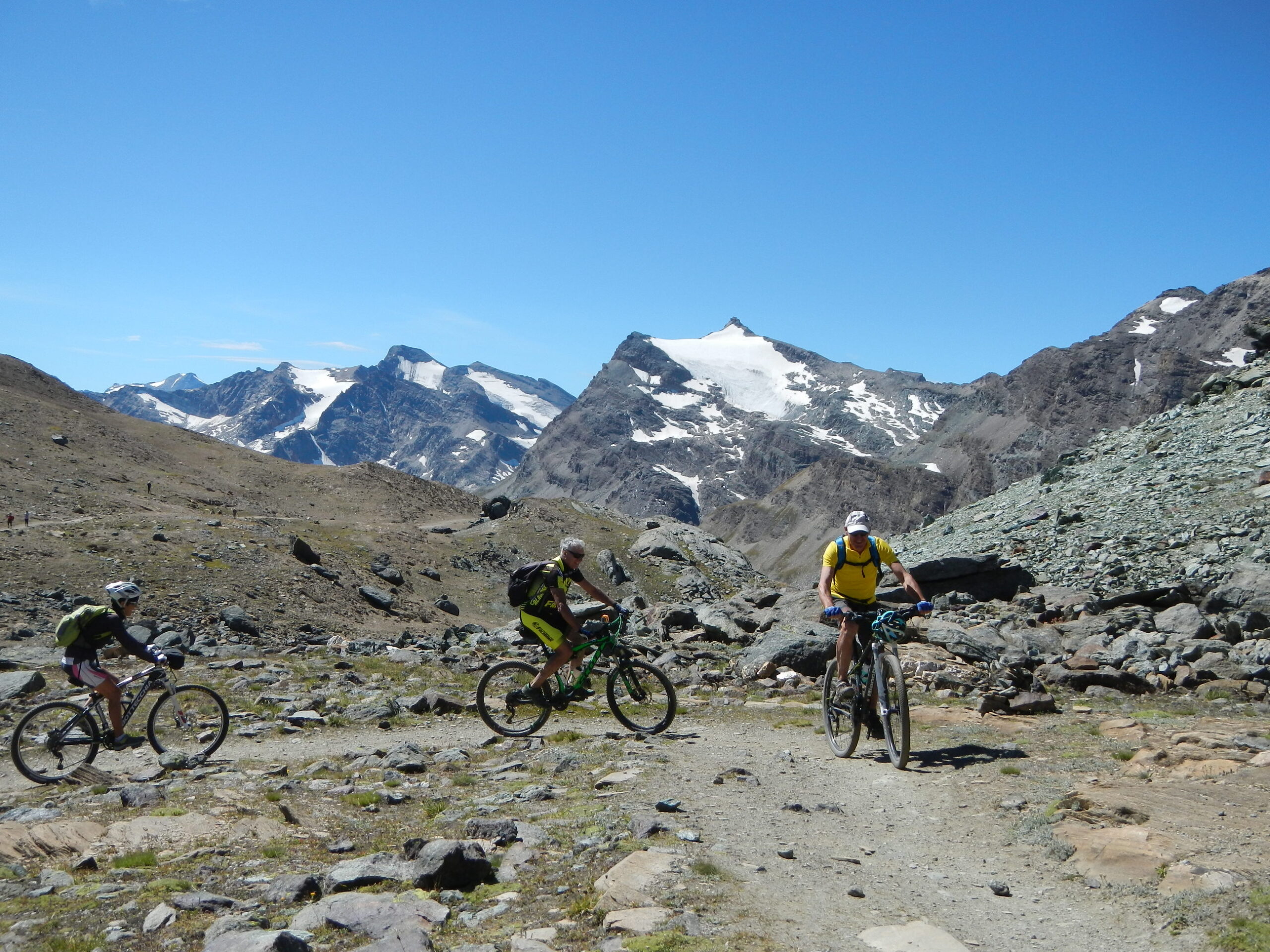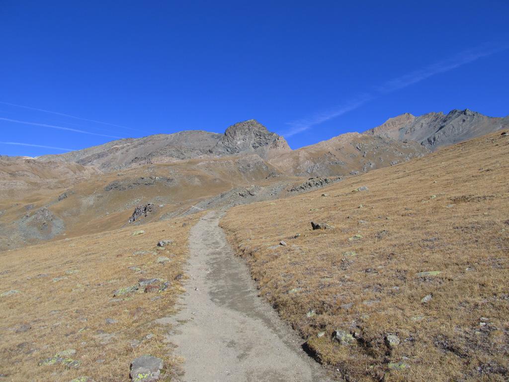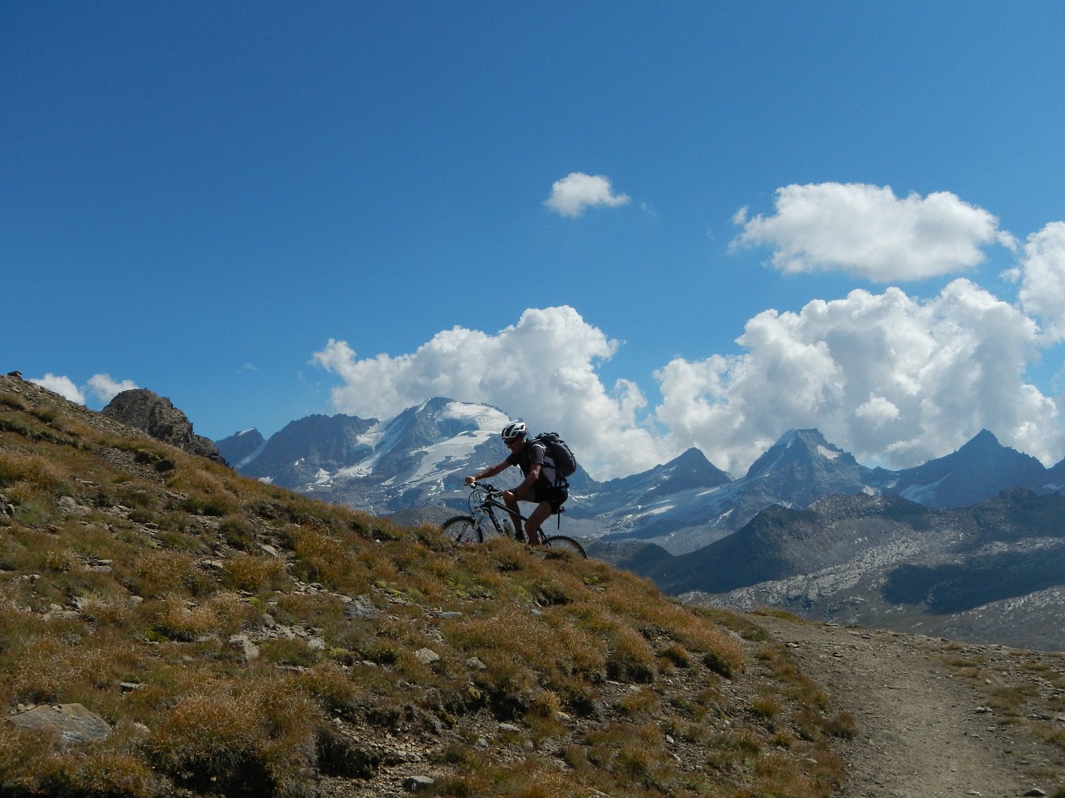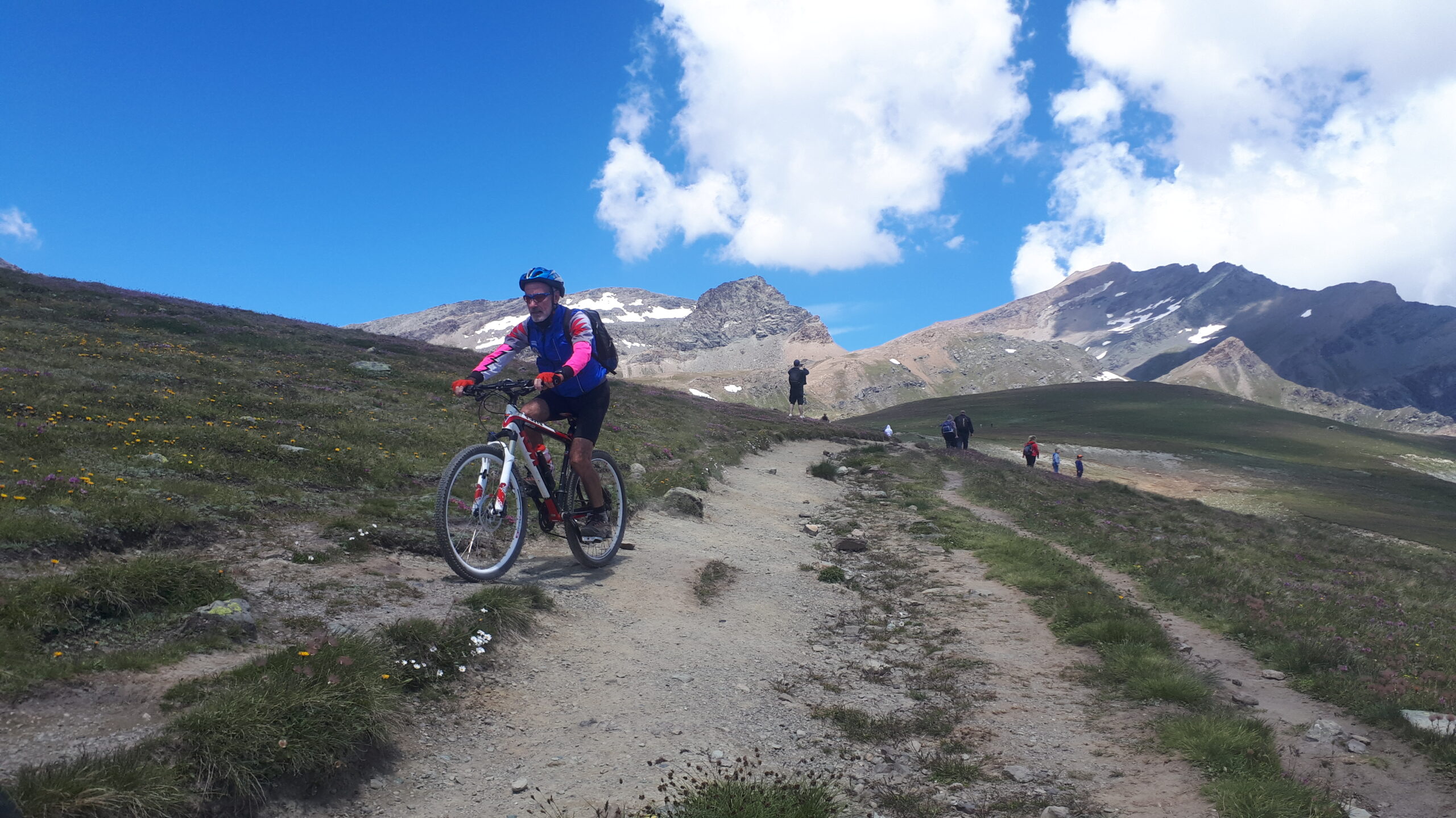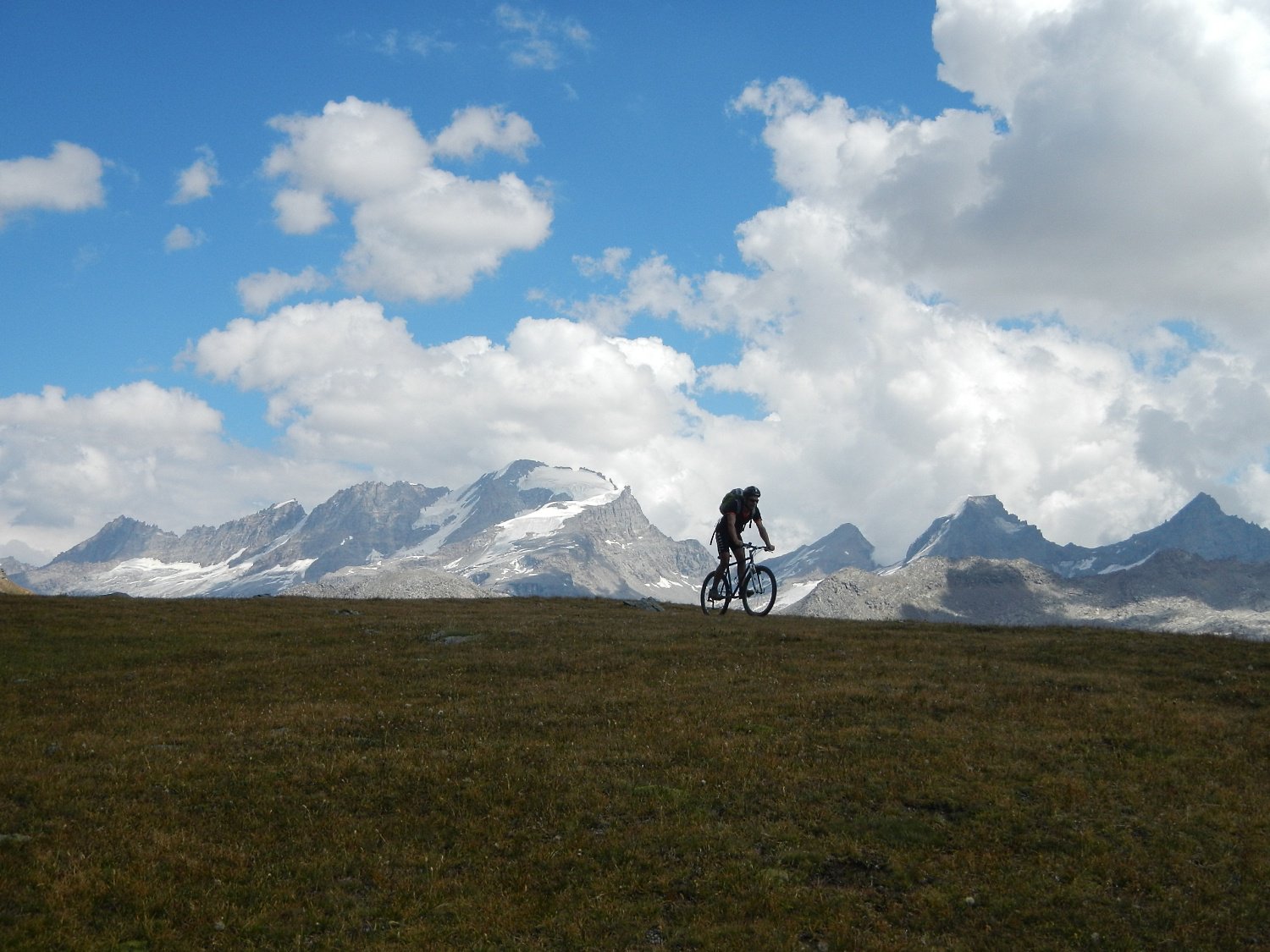 Si deve superare bici a fianco un primo breve tratto con pendenze eccessive e qualche sasso, poi raggiunto un pianoro erboso si può salire in sella ed in breve piegando a destra toccare un alpeggio. Il sentiero prosegue a monte del fabbricato, con una rampa più ripida ma pedalabile, poi inizia lo spettacolo; si pedala su vaste praterie solcate da questo stupendo sentiero terroso, costeggiando in alto a destra il Lago Rosset.