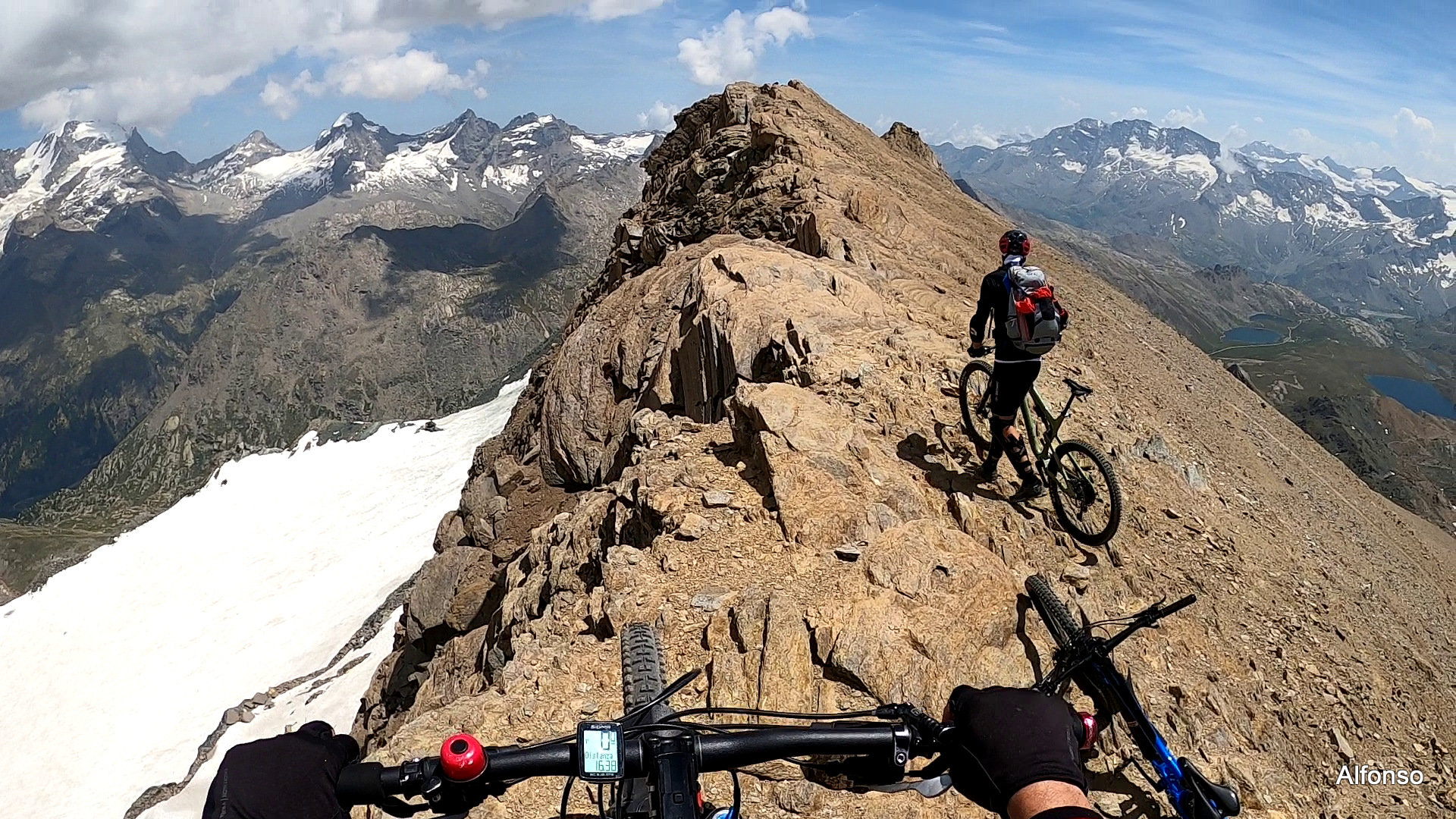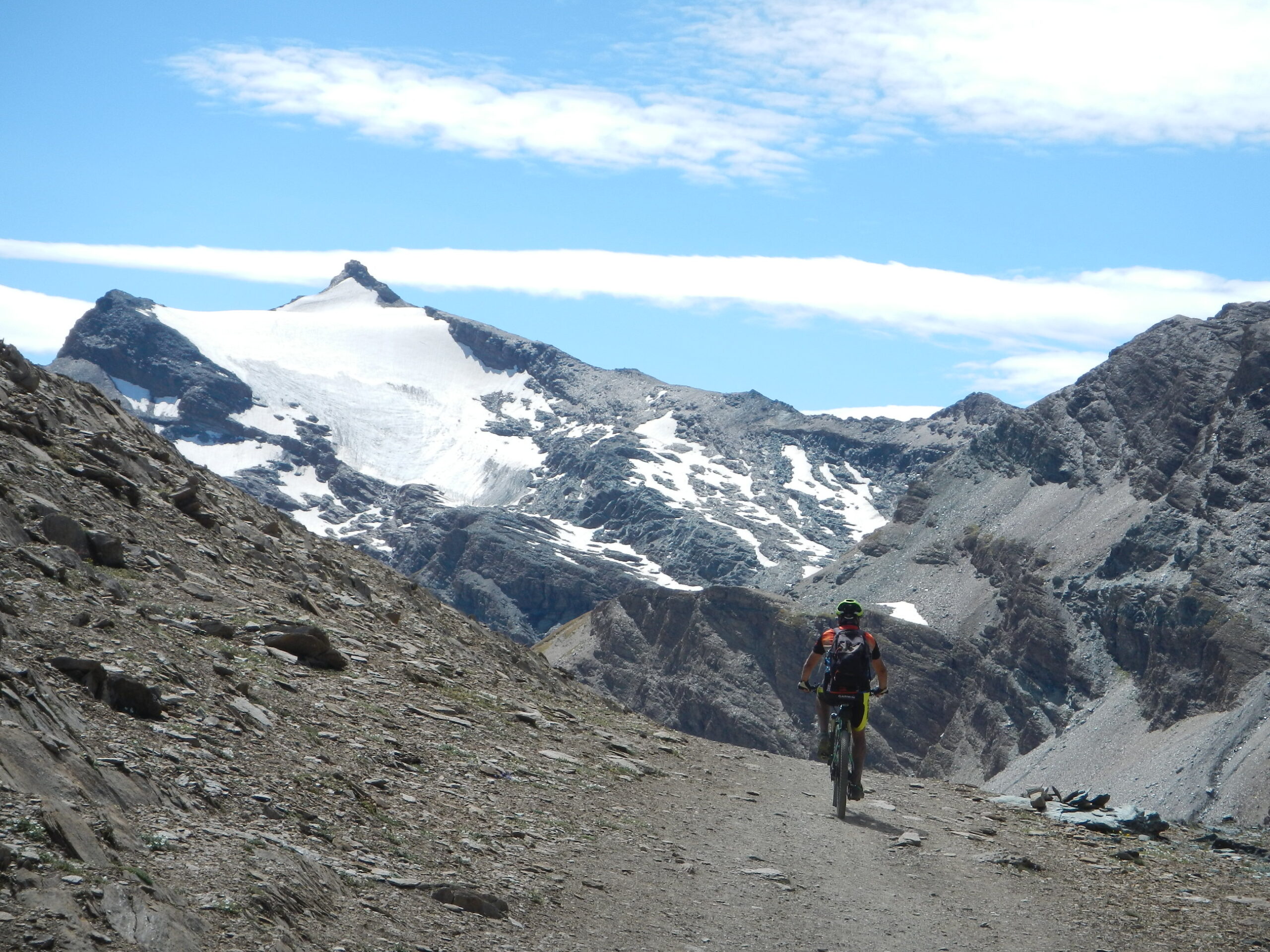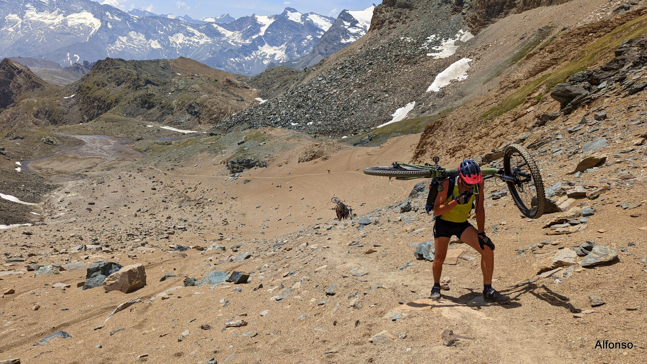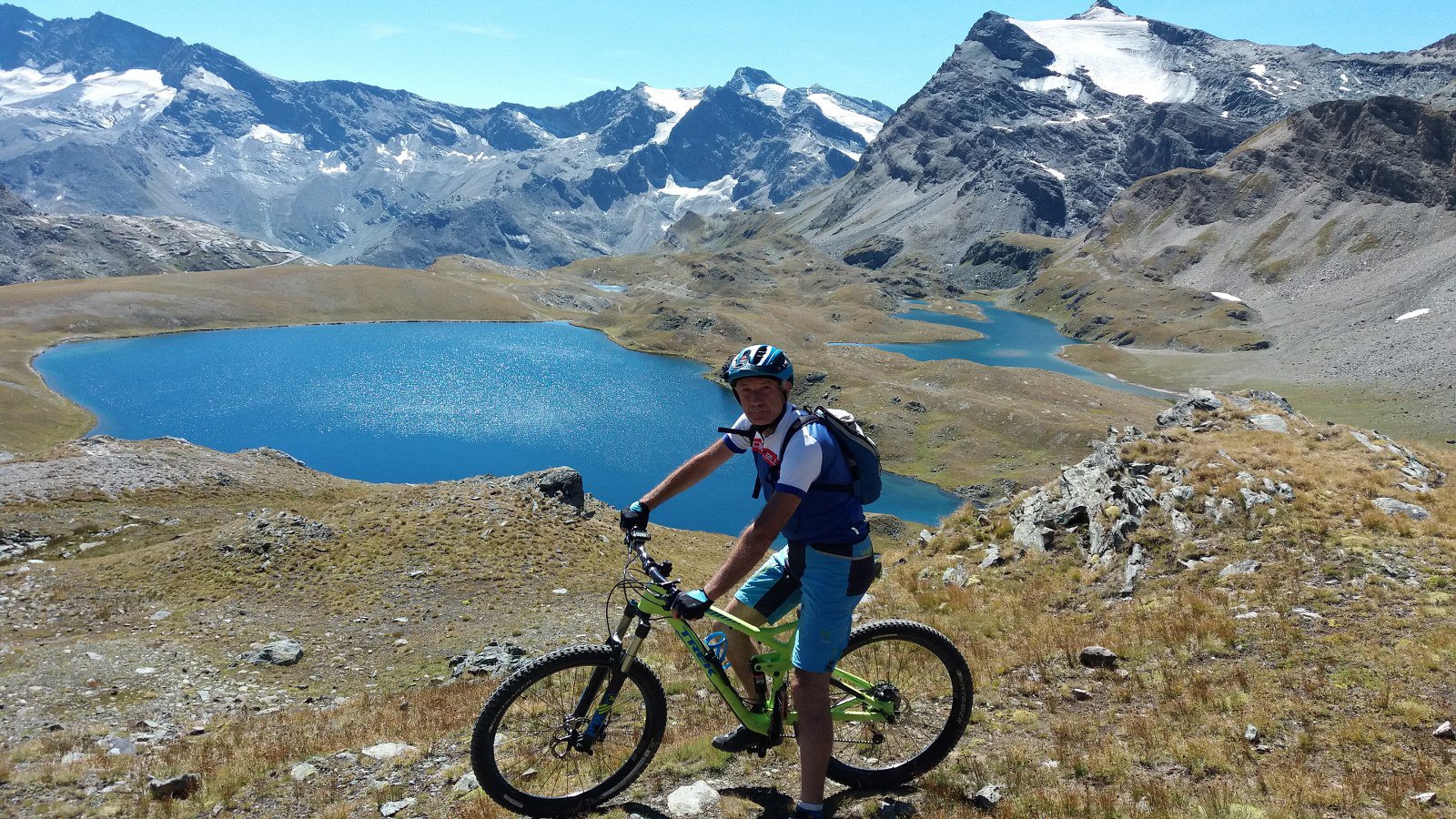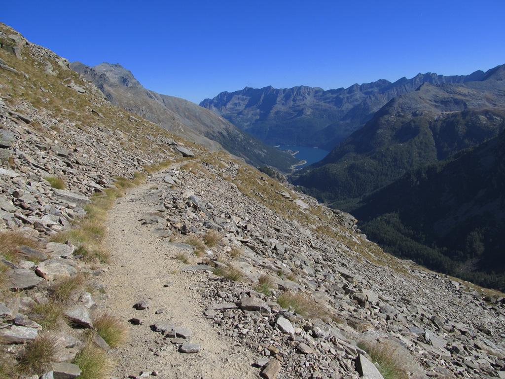 Si deve superare bici a fianco un primo breve tratto con pendenze eccessive e qualche sasso, poi raggiunto un pianoro erboso si può salire in sella ed in breve piegando a destra toccare un alpeggio. Il sentiero prosegue a monte del fabbricato, con una rampa più ripida ma pedalabile, poi inizia lo spettacolo; si pedala su vaste praterie solcate da questo stupendo sentiero terroso, costeggiando in alto a destra il Lago Rosset.