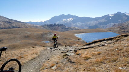 in discesa prima di raggiungere il lago Rosset abbiamo traversato per raggiungere il sentiero 3C che scende dal Col Rosset, assai più tecnico, a tratti ripido e un pò scavato; al bivio per la Basei ci siamo ricongiunti con l’itinerario classico.