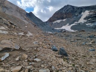 Sentiero sempre evidente; ben segnata anche la pietraia e l’ultimo tratto di sfasciumi dove sono stati messi alcuni gradini ed un cavo metallico.