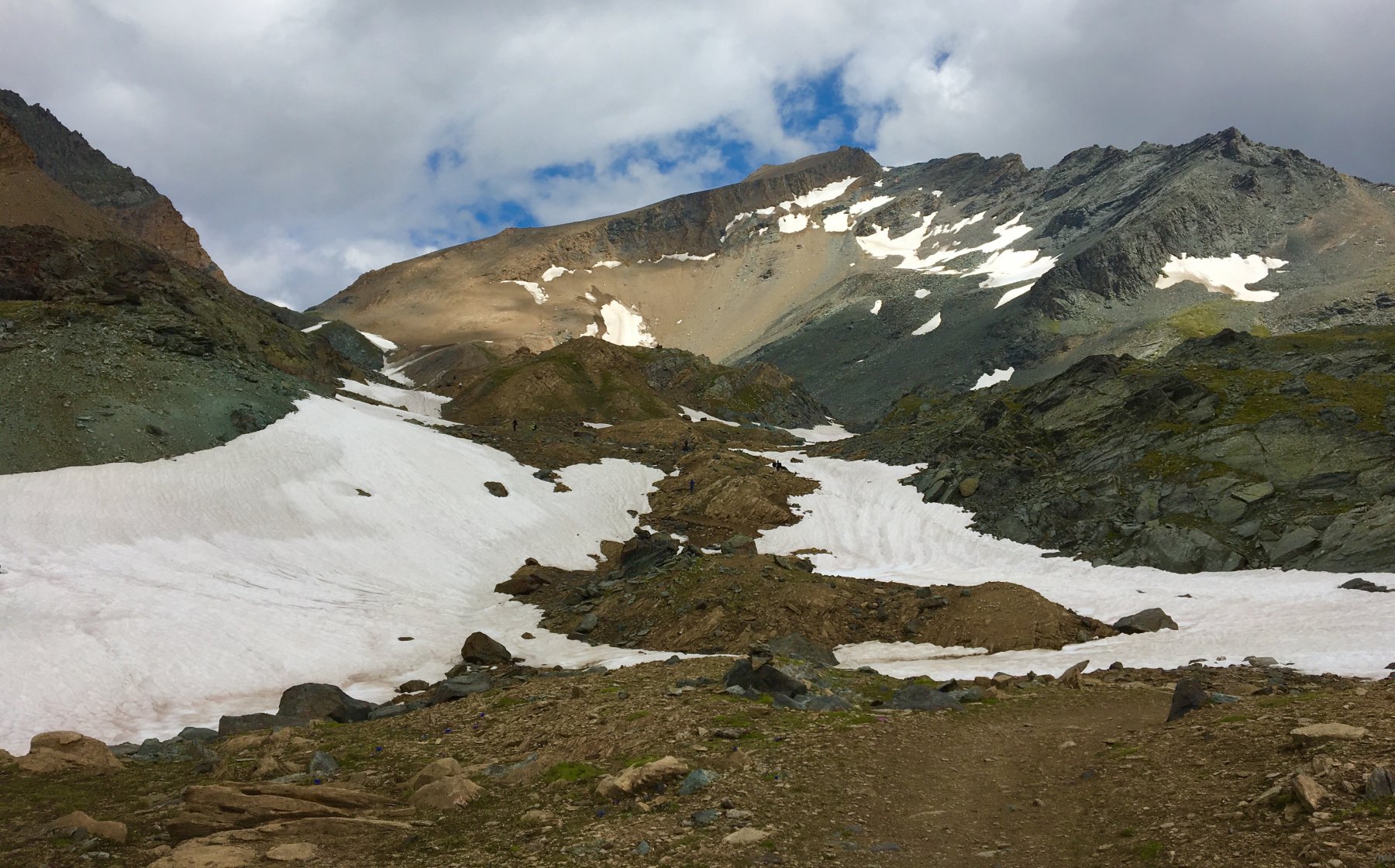 il sentiero s’impenna nuovamente e s’incontra un ‘ampio nevaio che copre spesso il sentiero, generalmente ci sono vari ometti che indicano il tragitto migliore.