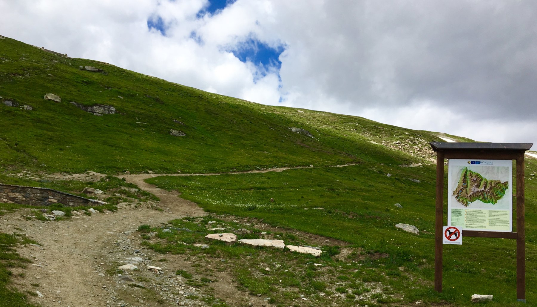 dopo questa rampa il sentiero spiana leggermente, siamo intorno ai 2800 m, da qui in avanti il paesaggio cambia e da verdi praterie passa e terreno più brullo con roccia e detriti, quasi lunare.