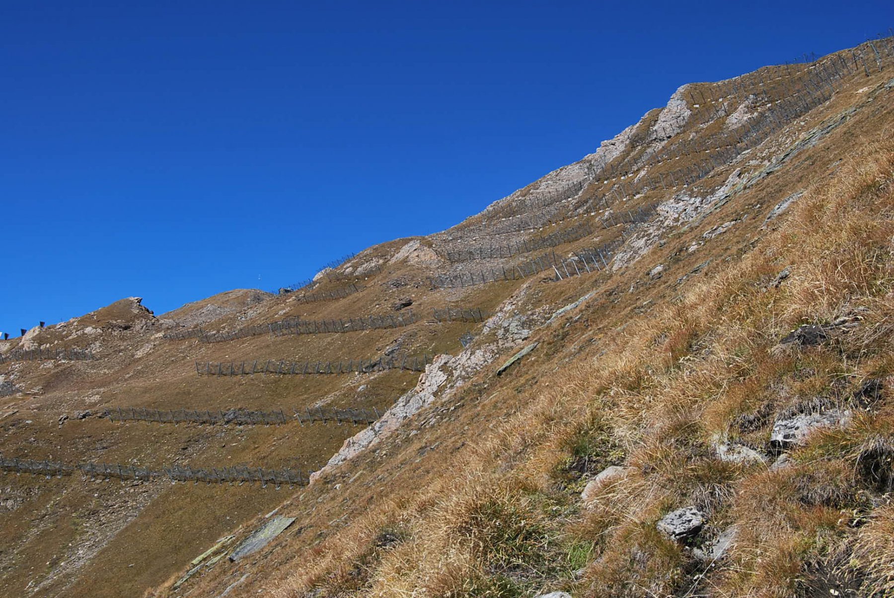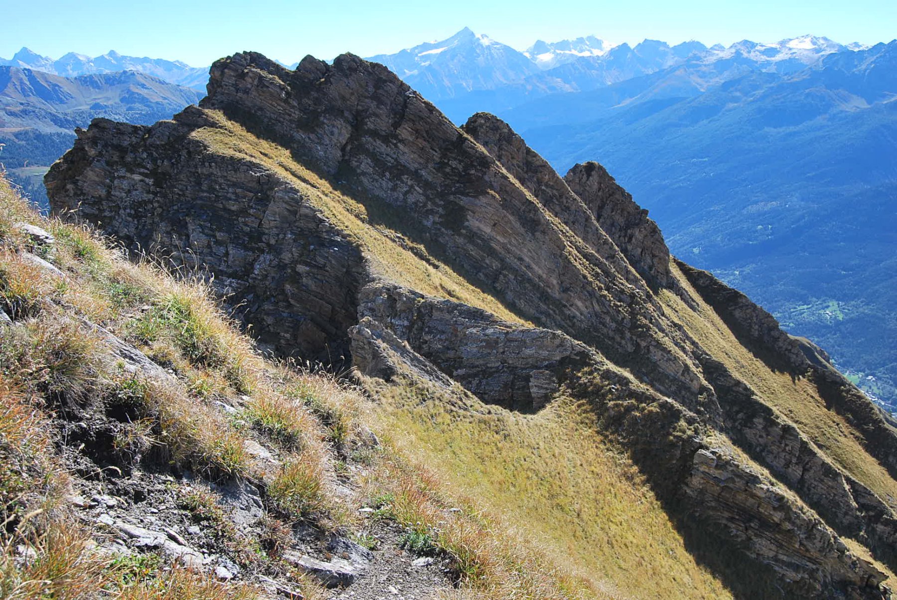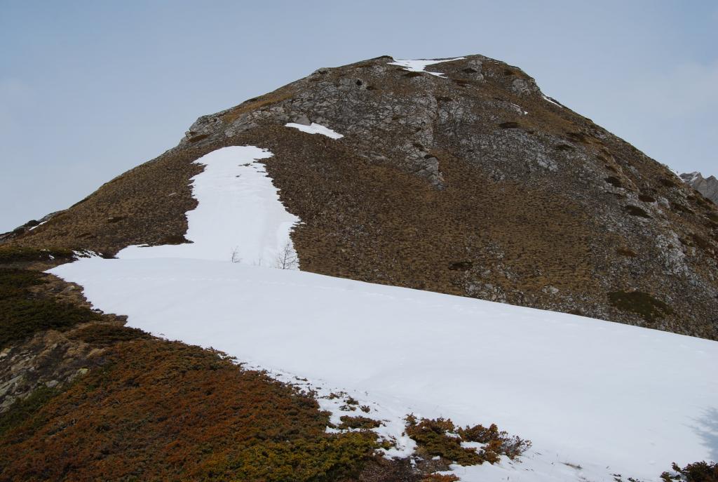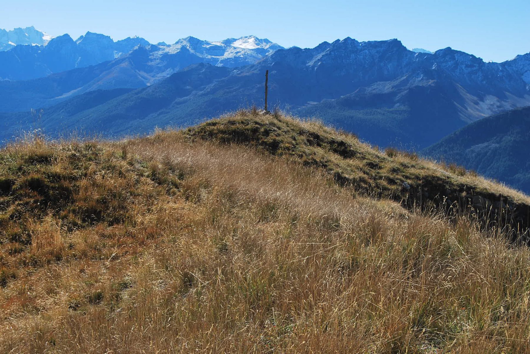 Da qui si prosegue inizialmente per una ampia cresta a saliscendi fin quando la cresta non diventa molto ripida. Si prosegue ora sul fianco Sud della nostra montagna usando quando possibile le varie tracce di camosci o salendo direttamente per i ripidissimi pendii erbosi. Si giunge sulla cresta sommitale superando il punto più altro (m. 2945 circa) e si prosegue ormai in direzione Ovest scendendo con alcuni passi su roccia (II) al colletto che ci separa dalla vera vetta. In breve si è al Bivacco posto appena sotto sulla cima sormontata da 3 grossi ometti.