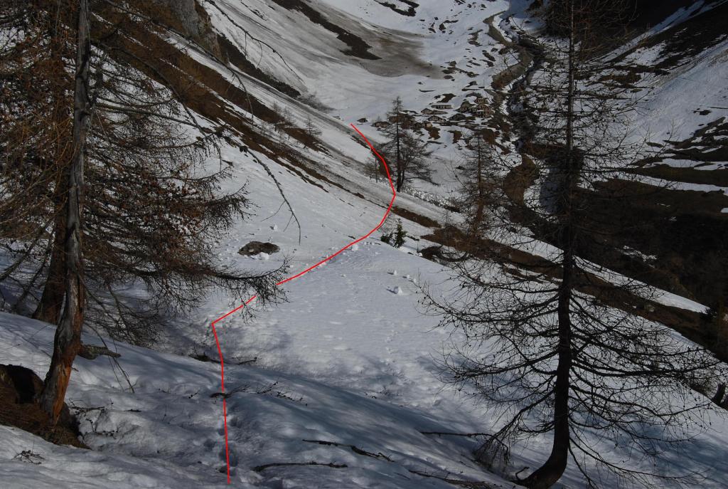 Si parcheggia al tornante sopra Morge, e si prende subito la stradina segnalata che dopo poche decine di metri scende di circa 50 metri di dislivello ad attraversare su di un ponte il torrente Grand Eau. Si continua raggiungendo subito una bella baita ristrutturata e si prosegue ora su sentiero fino a congiungersi con la mulattiera che arriva da Planavalle. Per un tratto su buona mulattiera pianeggiante si tagliano a mezza costa boschi di conifere, poi la mulattiera si trasforma in sentiero che sale addentrandosi nella Comba di Chambave fino all’alpeggio Capanna Chambave, m. 1880 sulla riva destra (idr) del torrente.