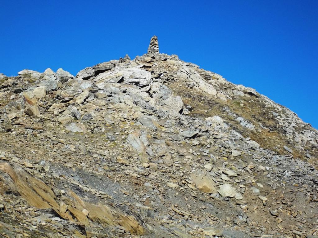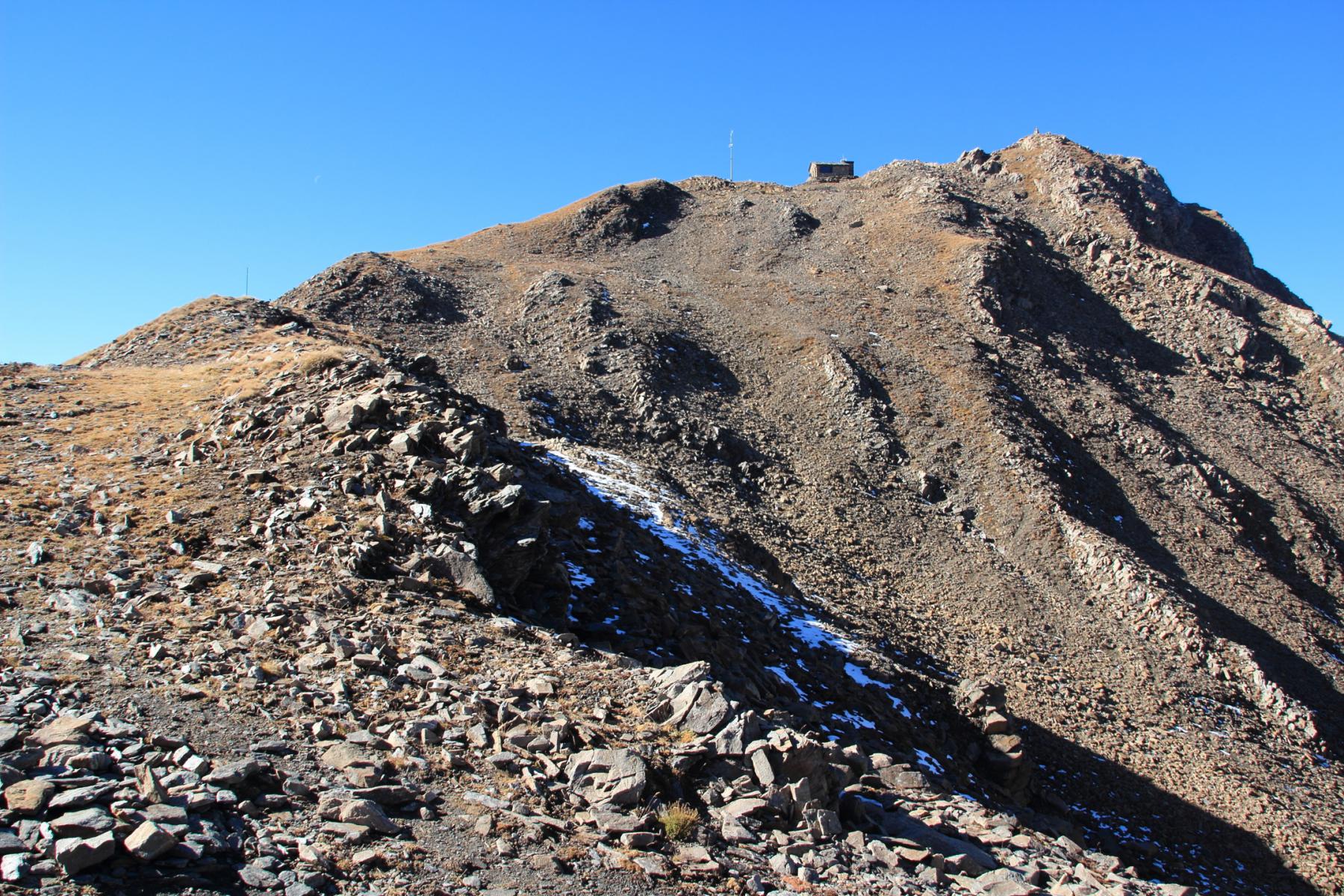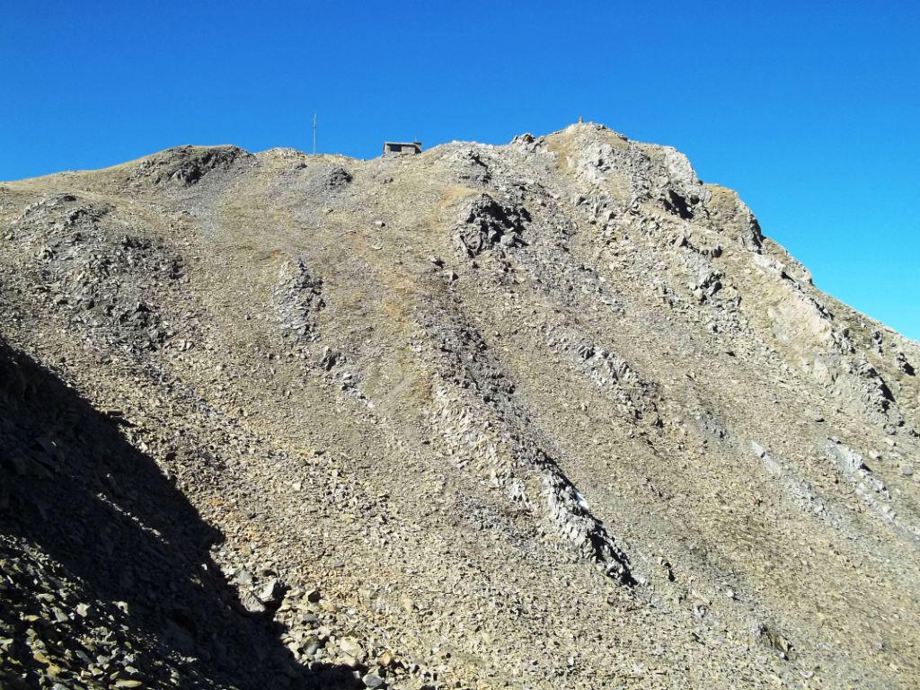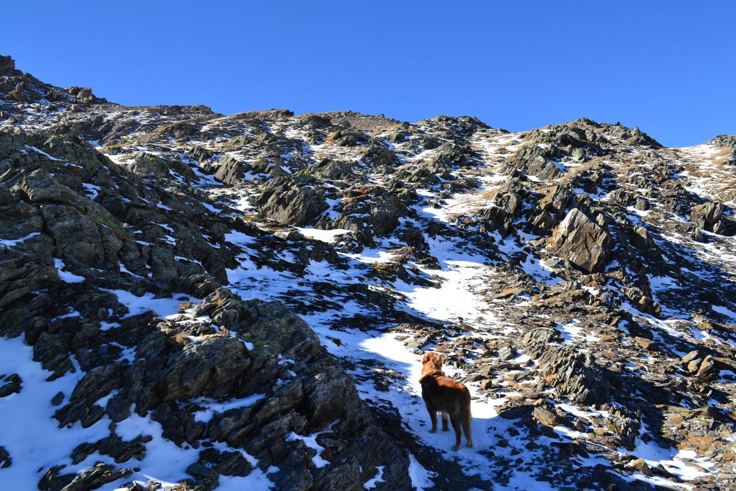 Per tracce si sentiero raggiungere per detriti la cresta di rocce rotte che porta in vetta 2929 m