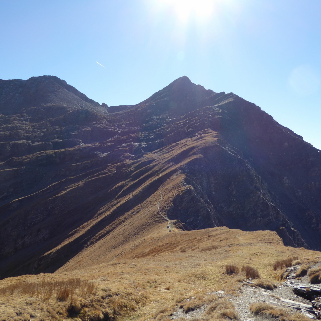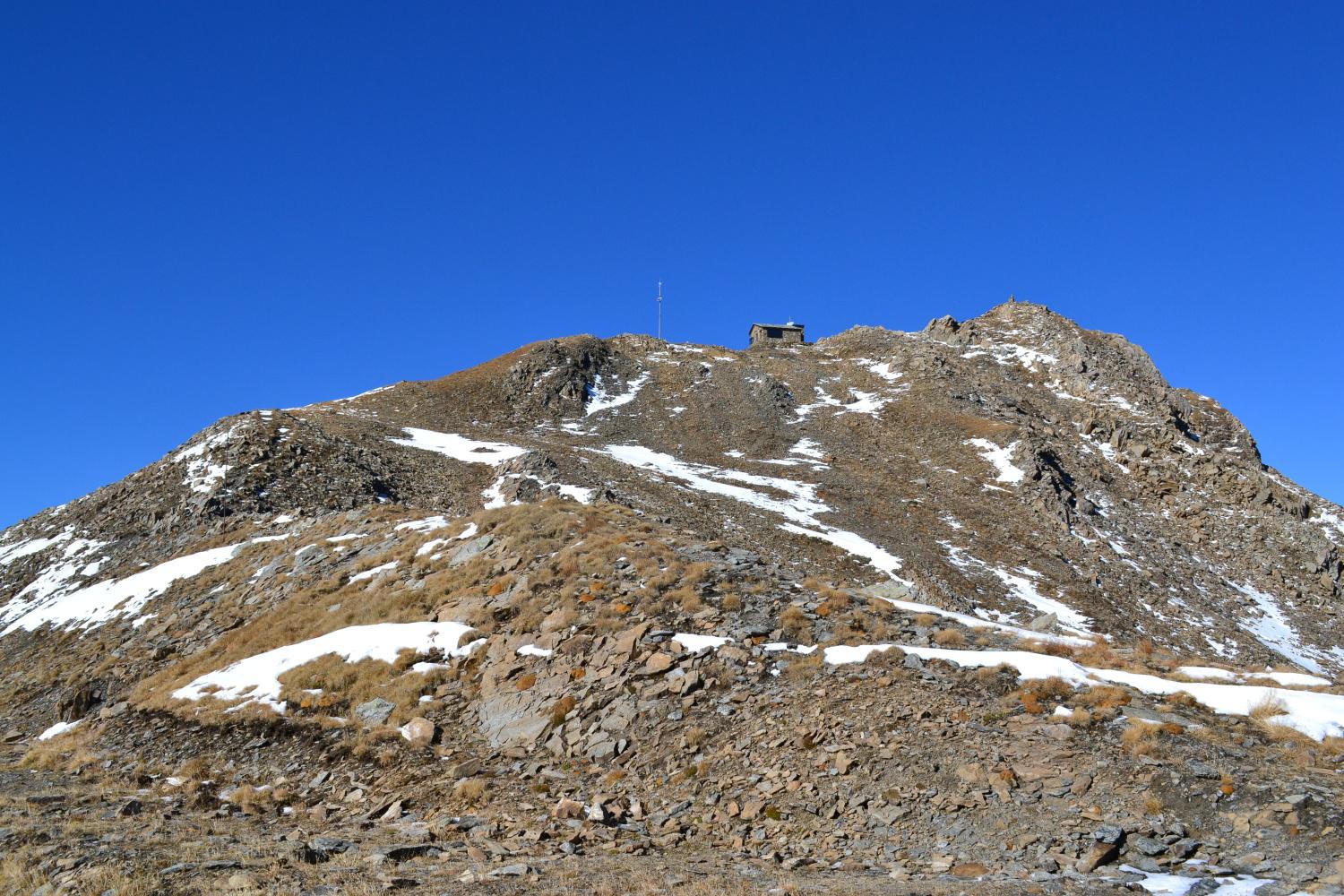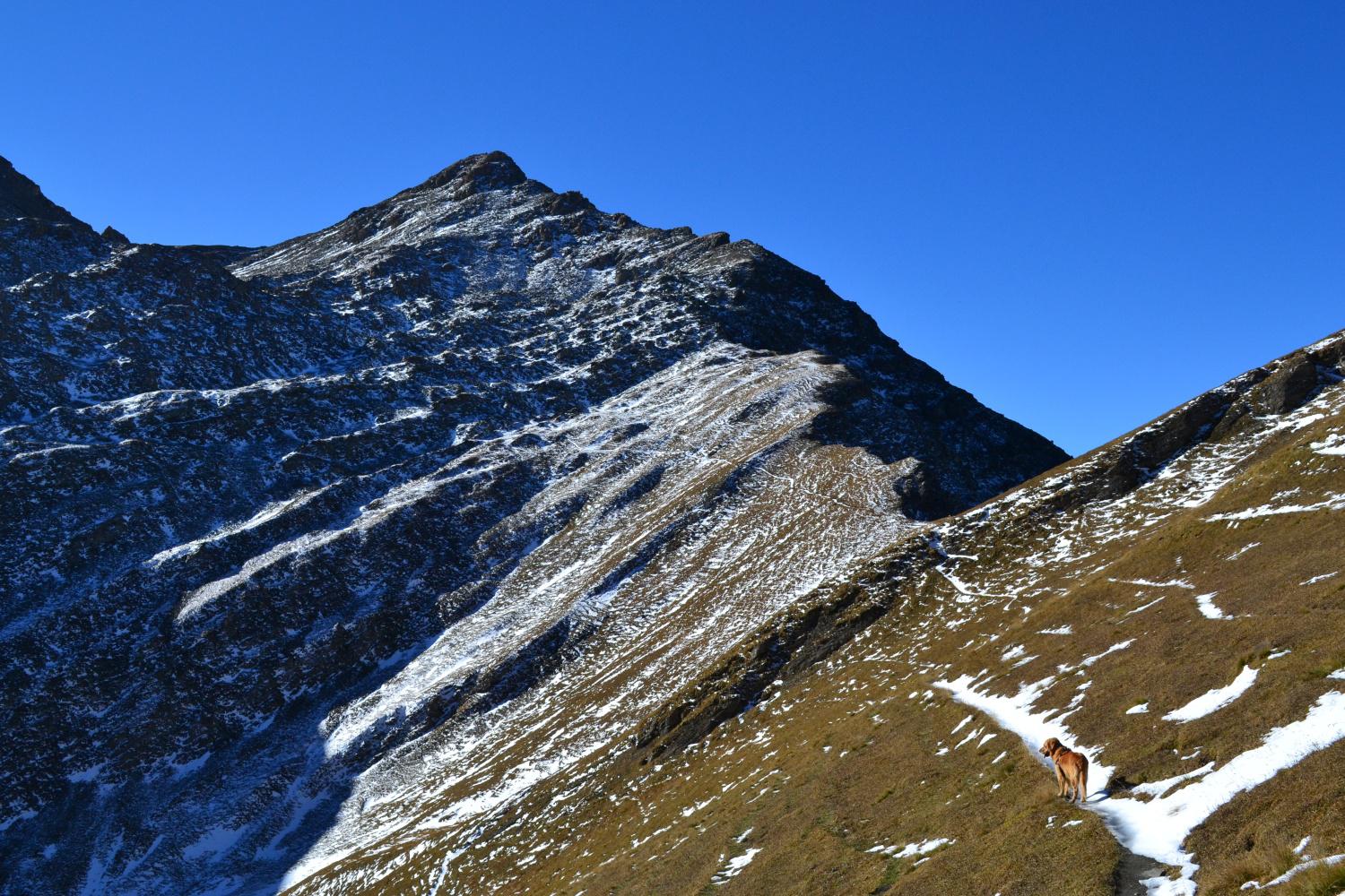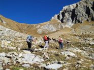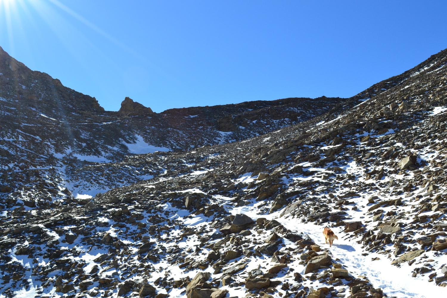 Per tracce si sentiero raggiungere per detriti la cresta di rocce rotte che porta in vetta 2929 m