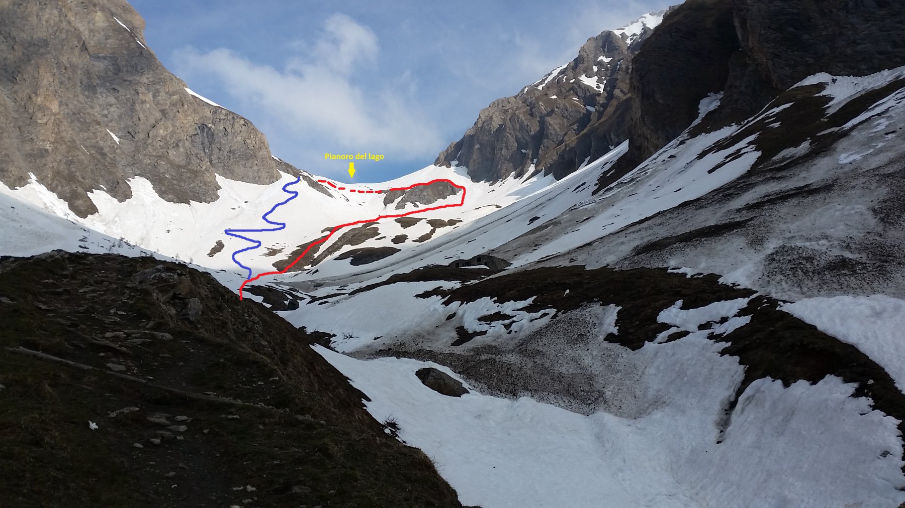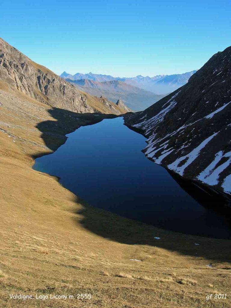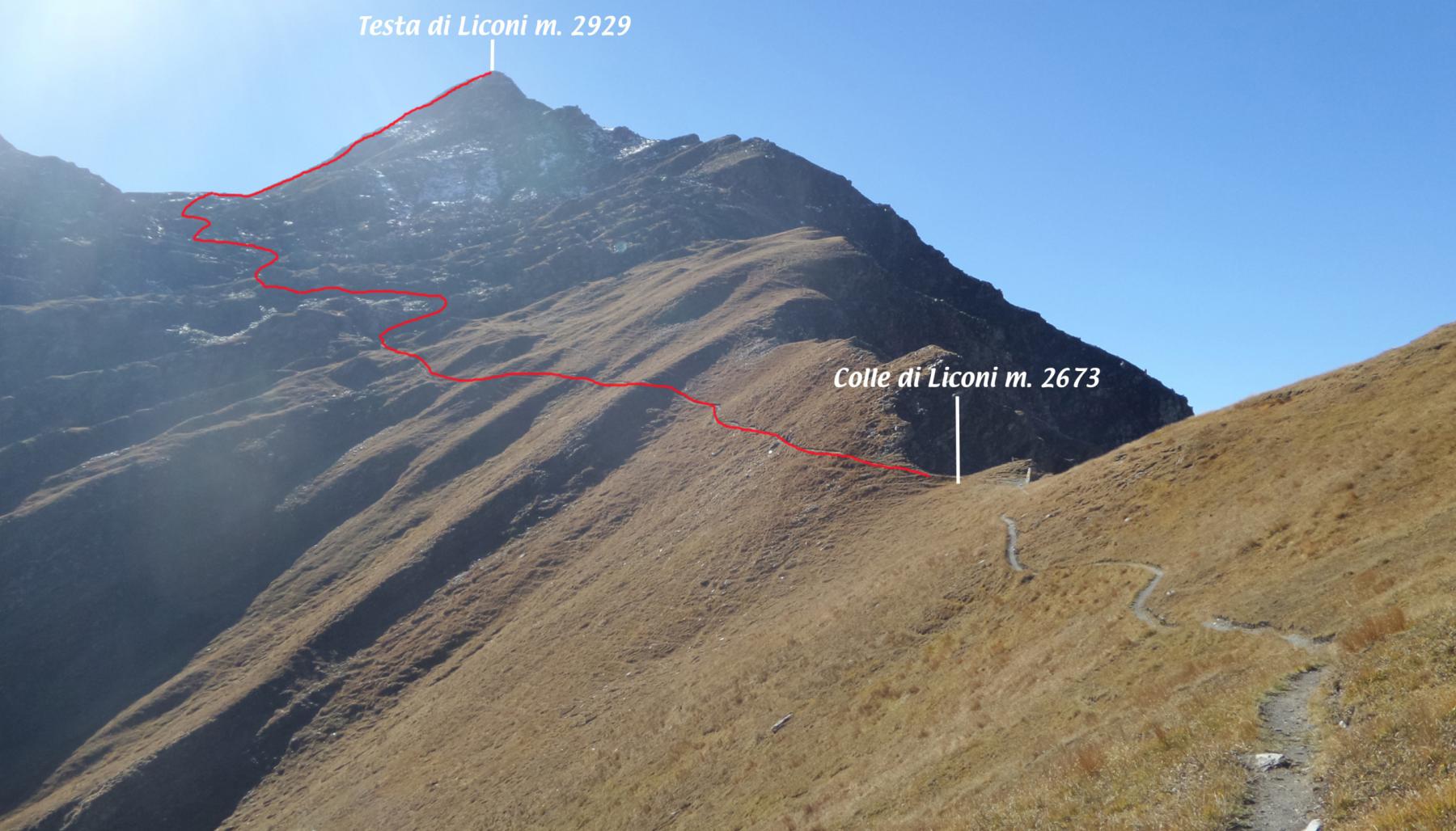 Il sentiero sale a zig zag, passa da una piccola conca, piega a sinistra e, infine, inerpicandosi sul contrafforte orientale della Testa di Liconi, sbuca sulla grande conca che accoglie il Lago Liconi 2595 m. Con il sentiero che ne costeggia la riva settentrionale oppure con un altro che sta più in alto ci si porta sopra l’estremità occidentale del lago e in breve si sale alla depressione del colle 2674 m.