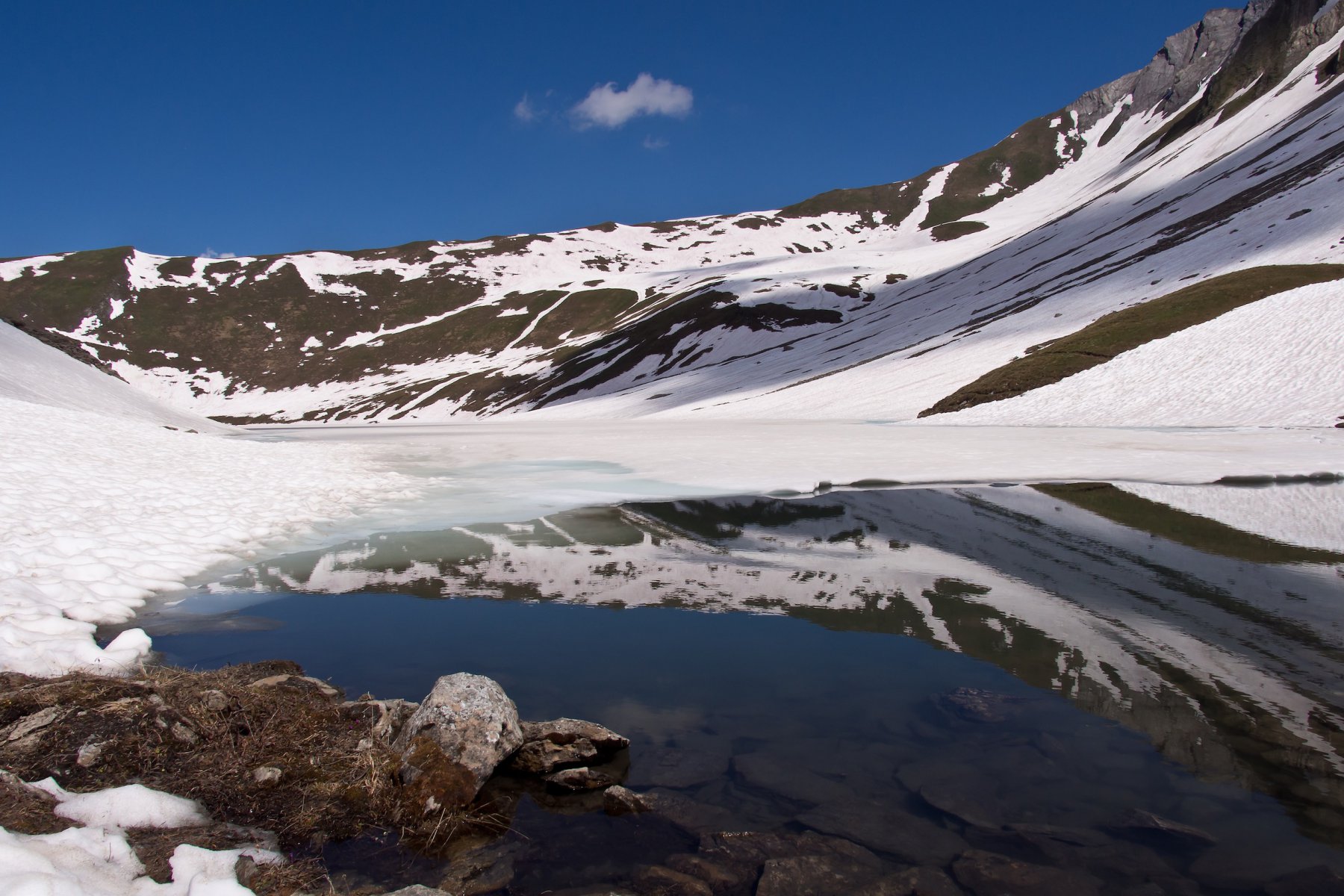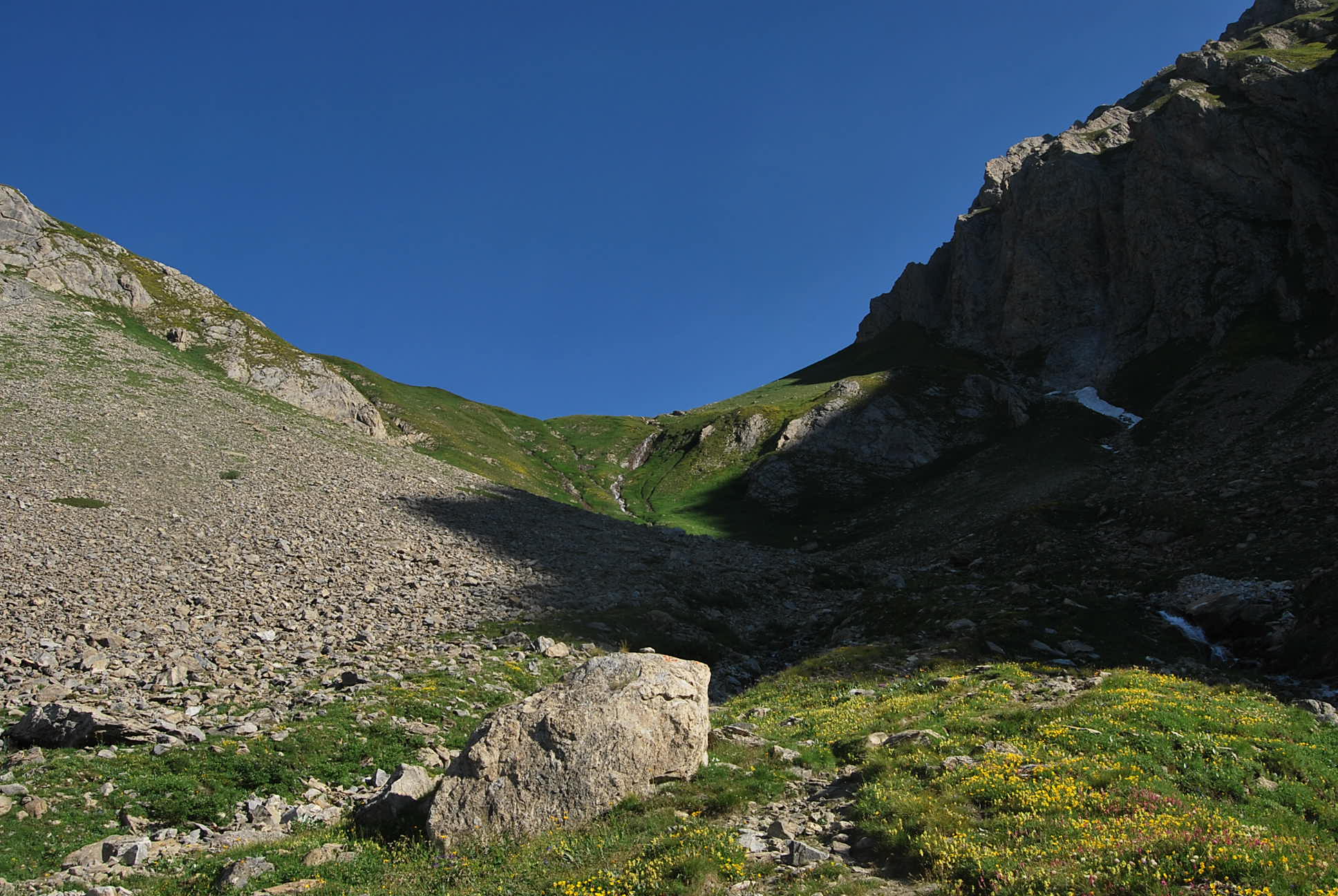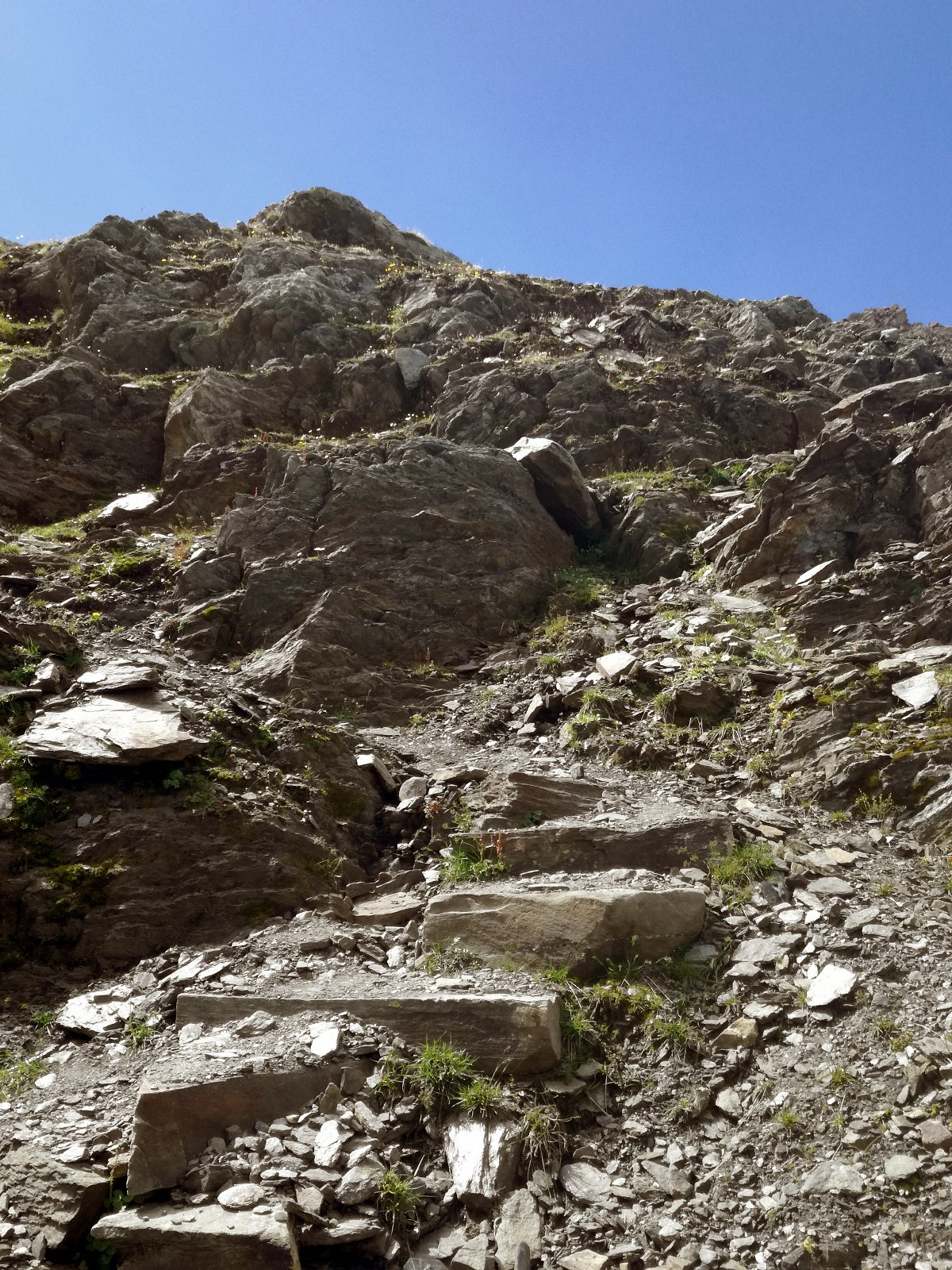 Il sentiero sale a zig zag, passa da una piccola conca, piega a sinistra e, infine, inerpicandosi sul contrafforte orientale della Testa di Liconi, sbuca sulla grande conca che accoglie il Lago Liconi 2595 m. Con il sentiero che ne costeggia la riva settentrionale oppure con un altro che sta più in alto ci si porta sopra l’estremità occidentale del lago e in breve si sale alla depressione del colle 2674 m.