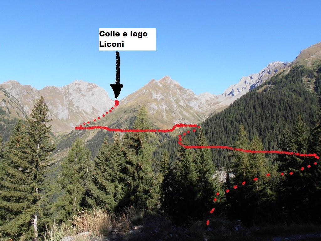 Da quest’alpeggio parte un sentiero che, sempre con andamento pianeggiante, dopo aver attraversato un pianoro taglia le falde erbose della montagna, passa nei pressi di un gruppo di larici e giunge a Liconi 1879 m, posto sul fondo della valle omonima, sulla riva destra del torrente.