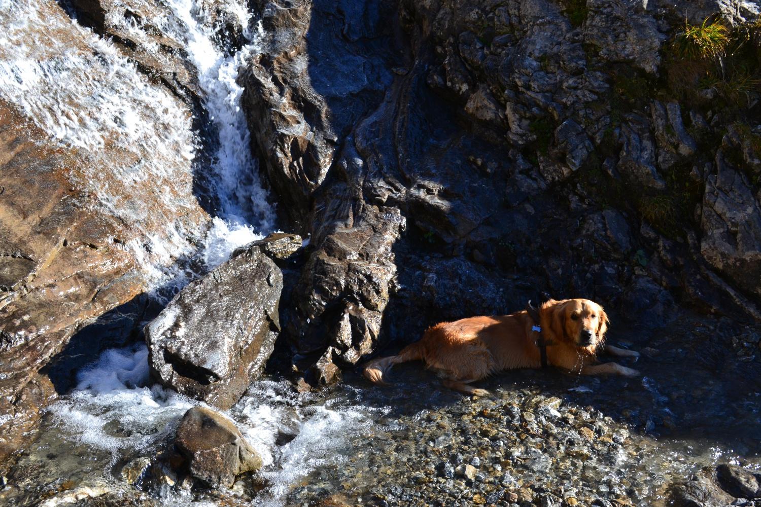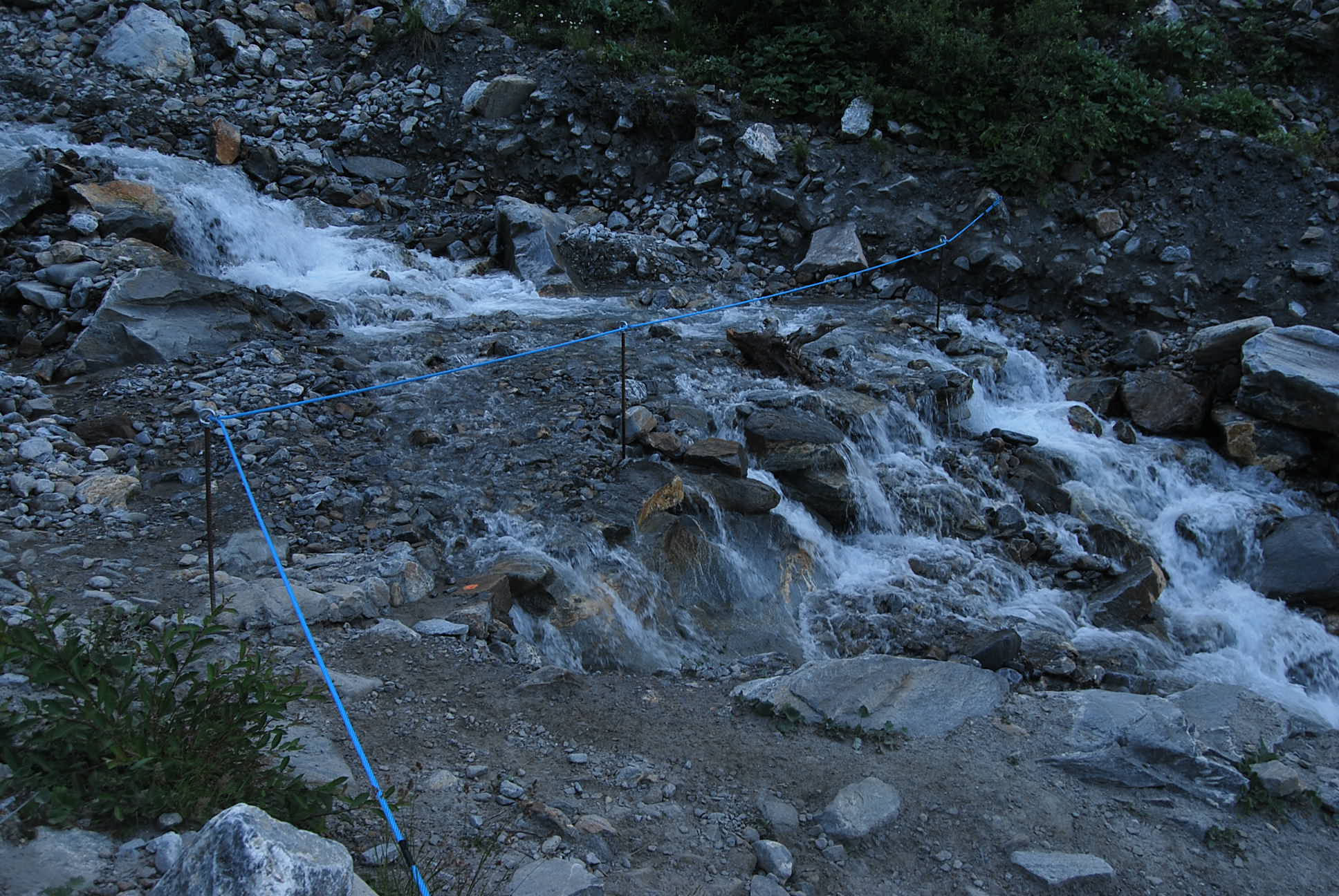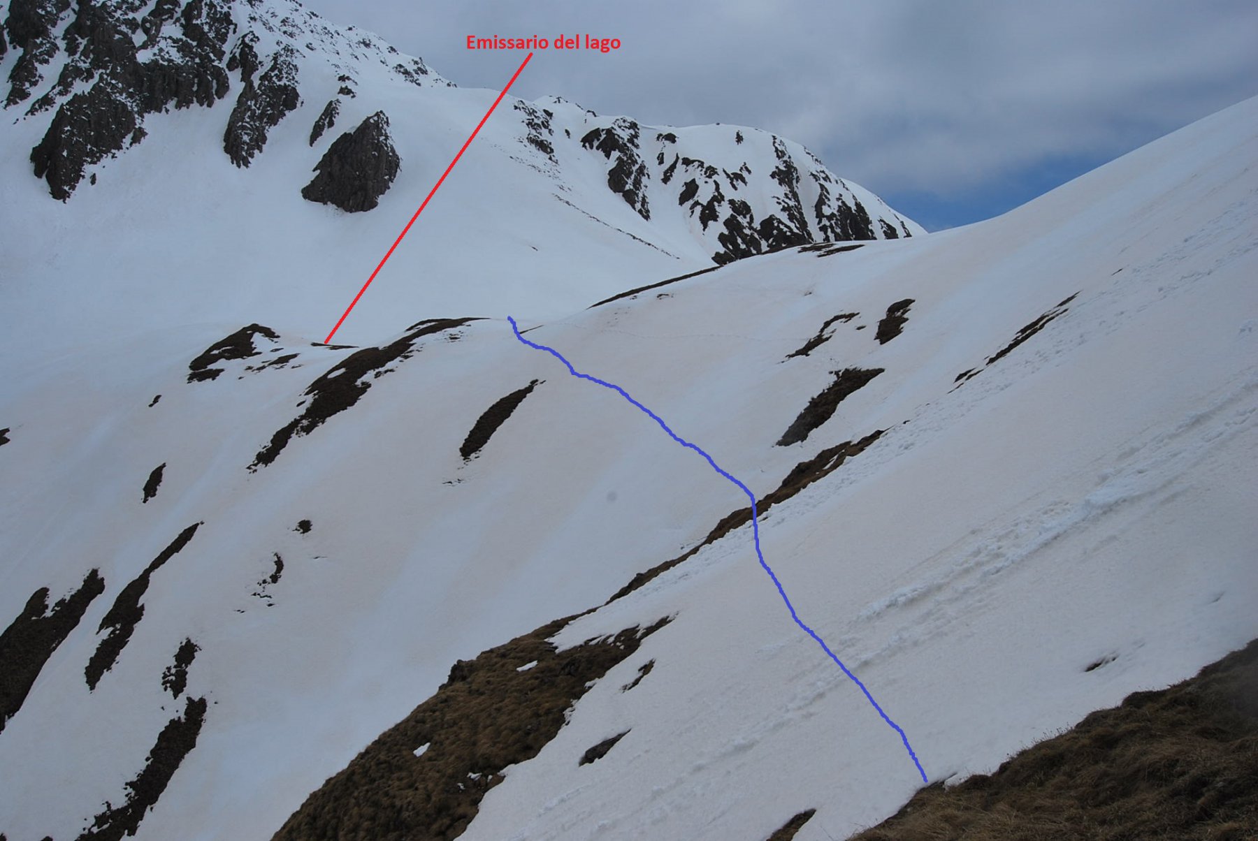 Si prende un incerto sentiero (scritta in giallo su pietra: Liconi) che sale nei pressi del torrente (attenzione: giunti ad una casetta di presa dell’acquedotto si deve attraversare il corso del rigagnolo, passando sulla sua sinistra orografica – ometti sull’altra sponda); si lascia poi, a destra sull’altra riva, la stalla interrata delle Grotte, 2080 m e, proseguendo sempre a sininistra, salendo su pascoli, si arriva alle prime cascatelle.