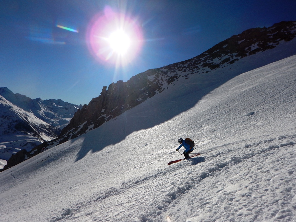 Ritornati su questo itinerario dopo due giorni con il resto della truppa: questa volta anzichè dirigerci verso Les Aiguillettes, raggiunta la parte terminale del pendio nord tra queste ed il Rocher Peyron abbiamo guadagnato l’esile selletta nevosa tra le guglie ad ovest della cresta del Rocher, con uscita non semplice. Di qui alcuni hanno risalito la breve guglia e si sono portati sulla dorsale verso il Rocher (delicato), il sottoscritto e Nik hanno sceso il breve canale sud ovest a lato della guglia (ramponi) congiungendosi con i soci alla base di questo. Discesa su farina vecchia, meno leggera rispetto a quella trovata due giorni prima ma ancora divertente sino al pianoro del vallon Remy. Ripello a guadagnare il col des Auriesses e poi belle discese su neve trasformata alternata a farina compatta seguendo l’itinerario descritto il 20.01
