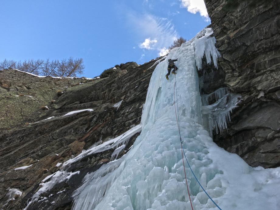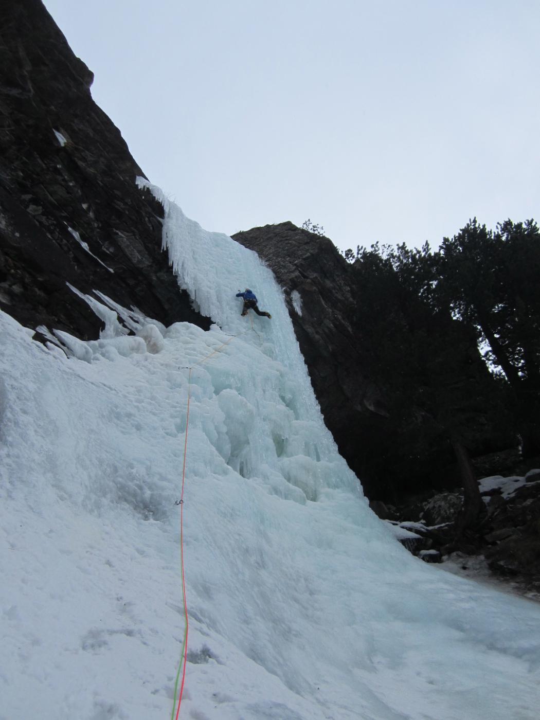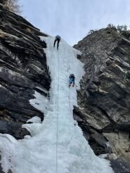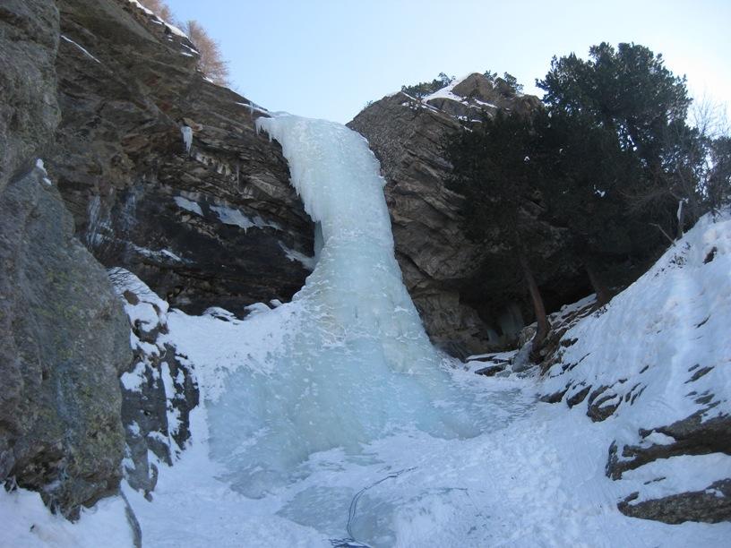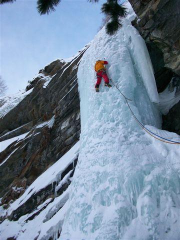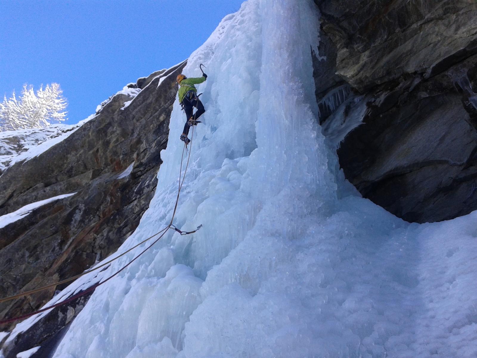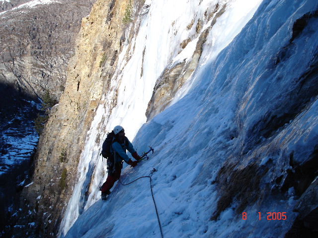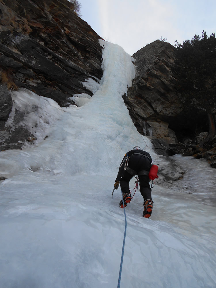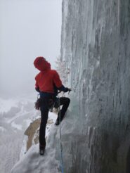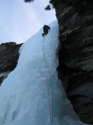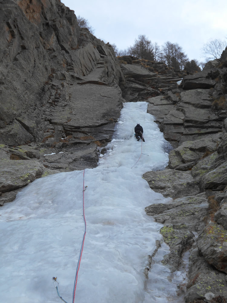 uscire dalla nicchia e attaccare il muro-candela nel centro per circa 10m e andare a sostare a sn su fix appena entrati nel canale finale (85° con brevissimo tratto a 90°)