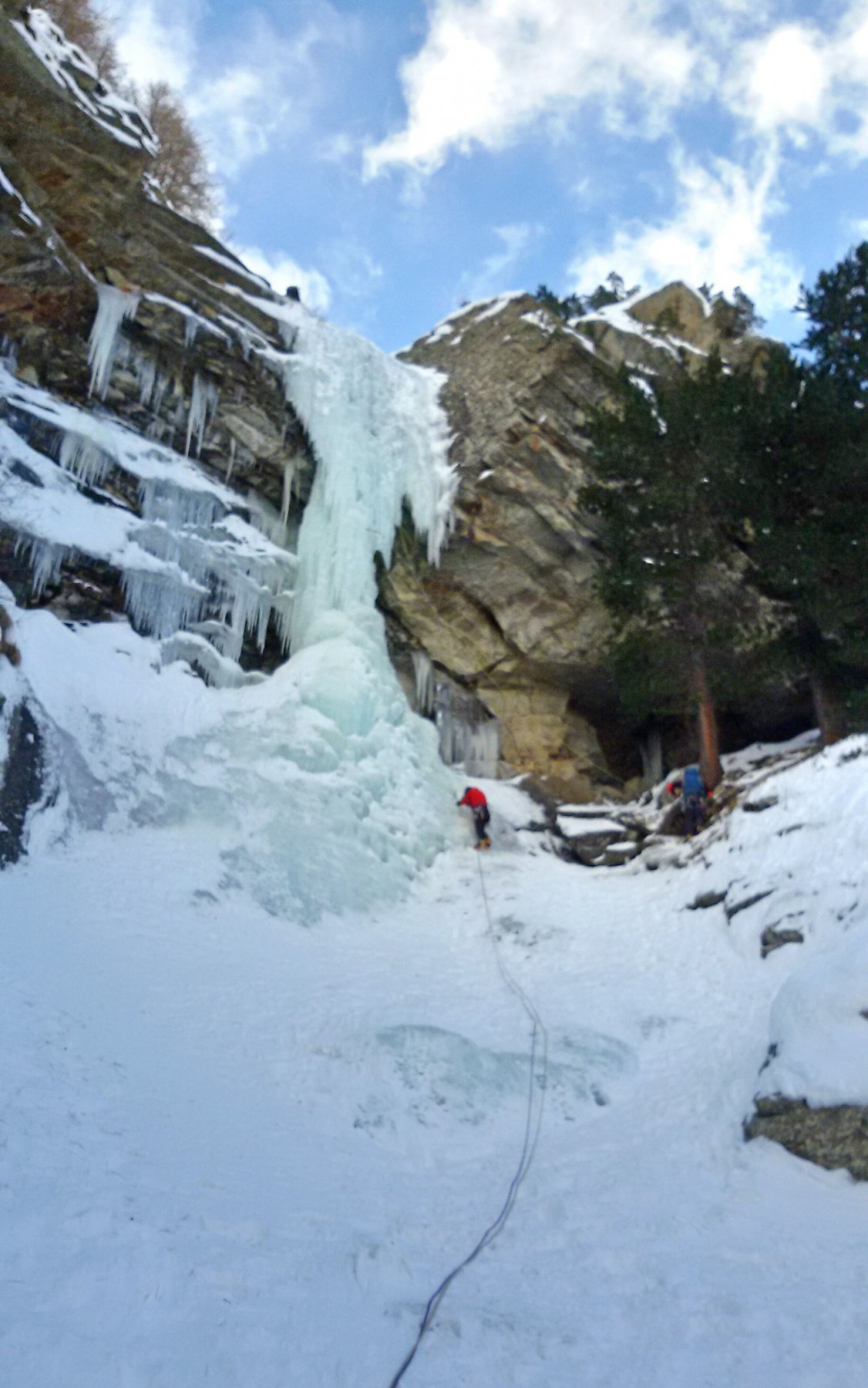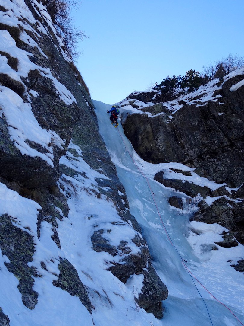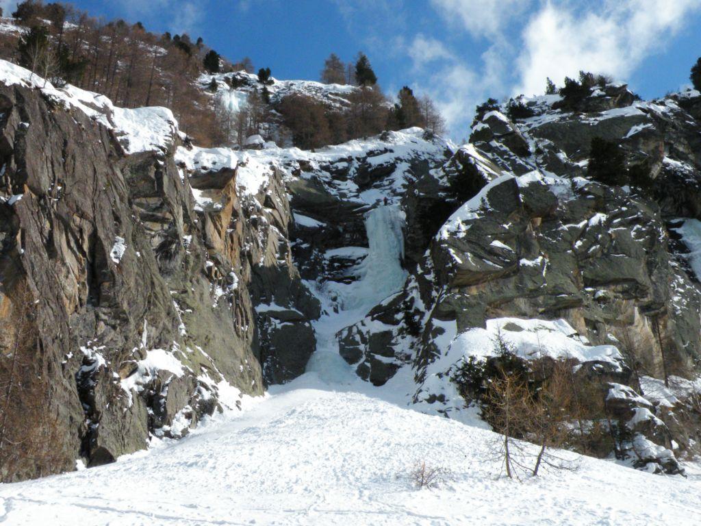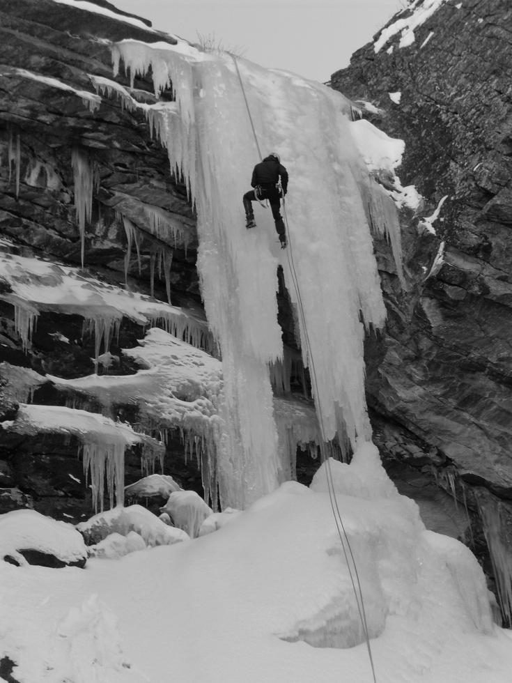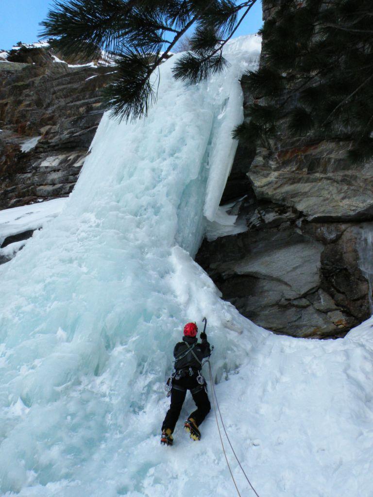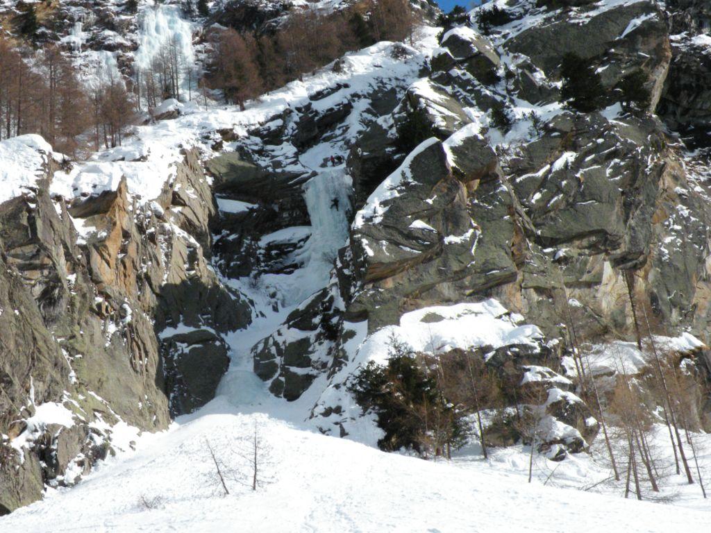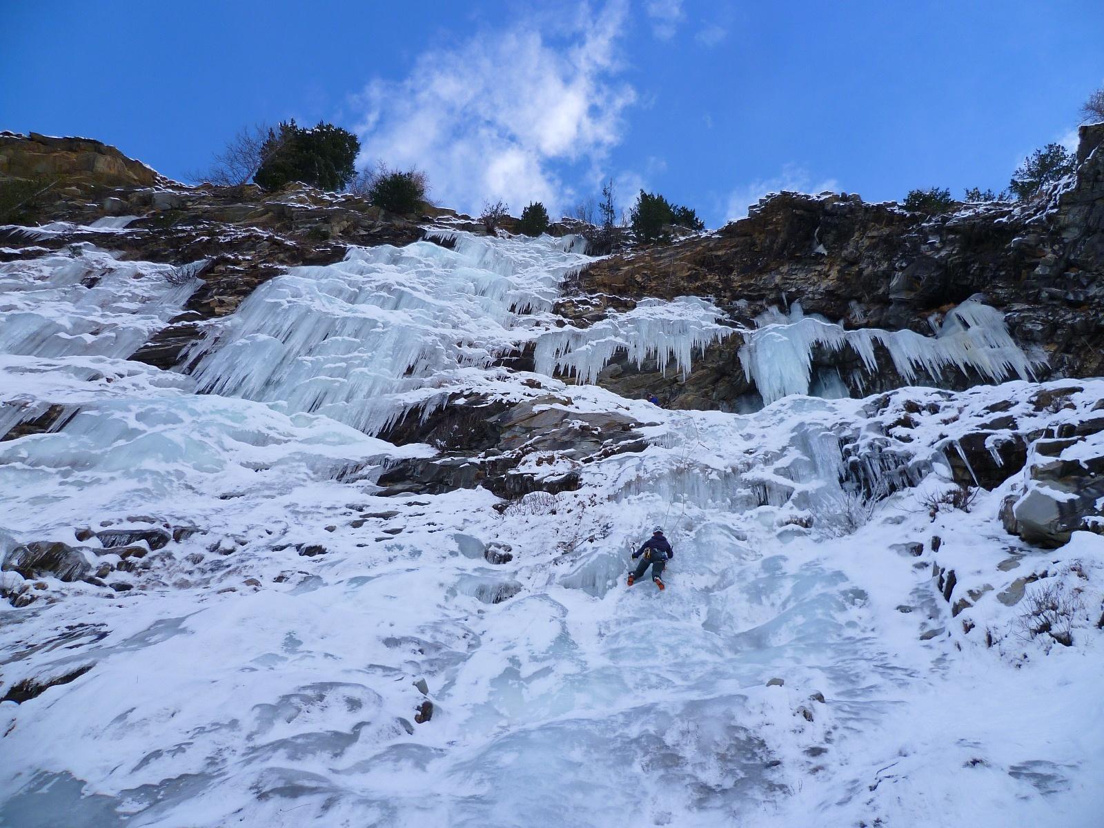 uscire dalla nicchia e attaccare il muro-candela nel centro per circa 10m e andare a sostare a sn su fix appena entrati nel canale finale (85° con brevissimo tratto a 90°)