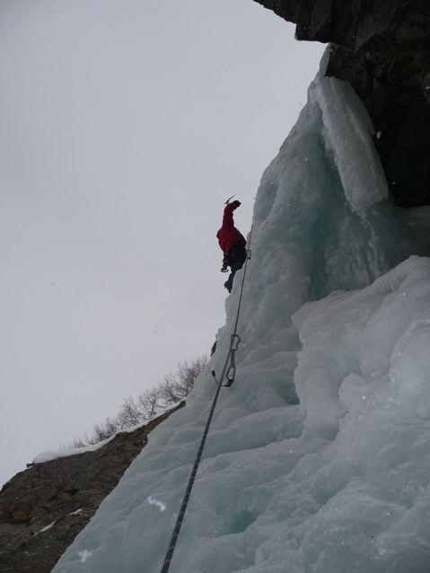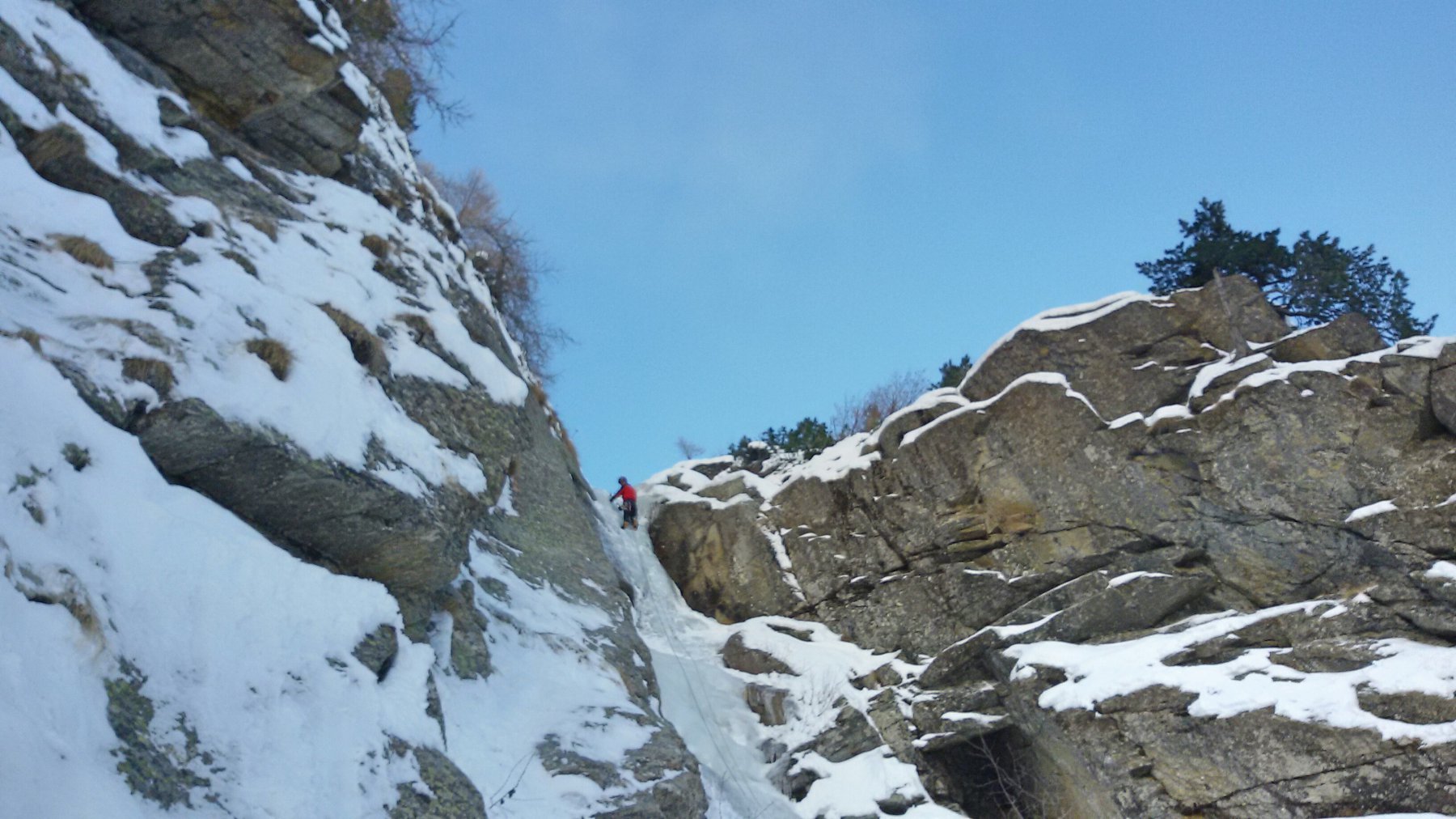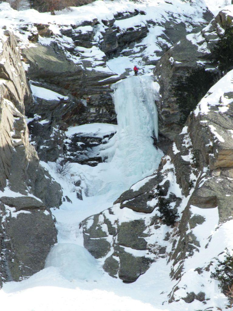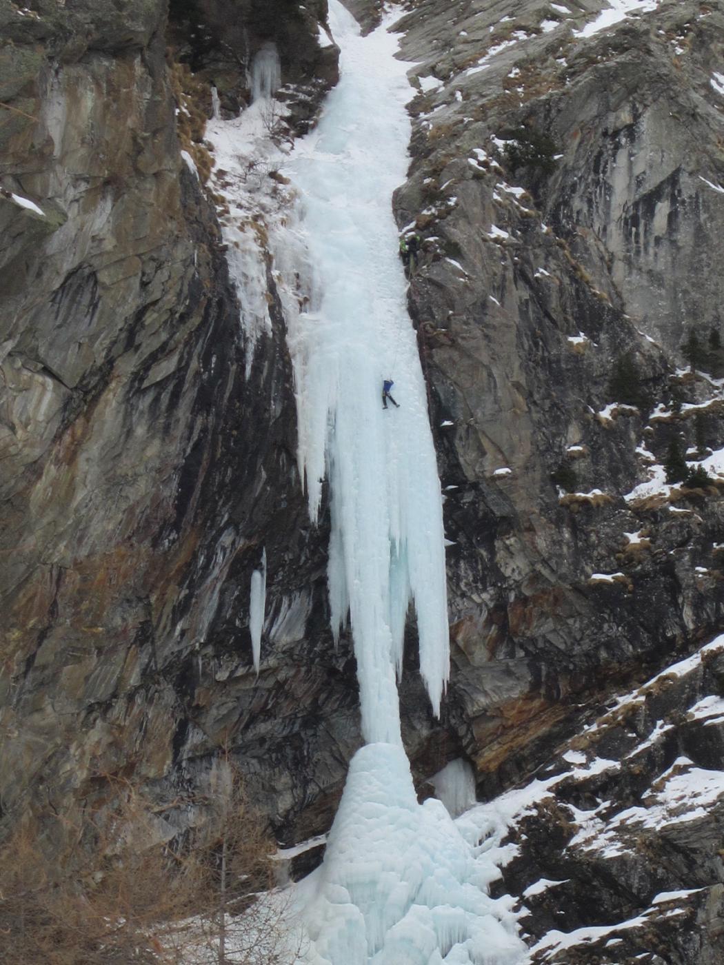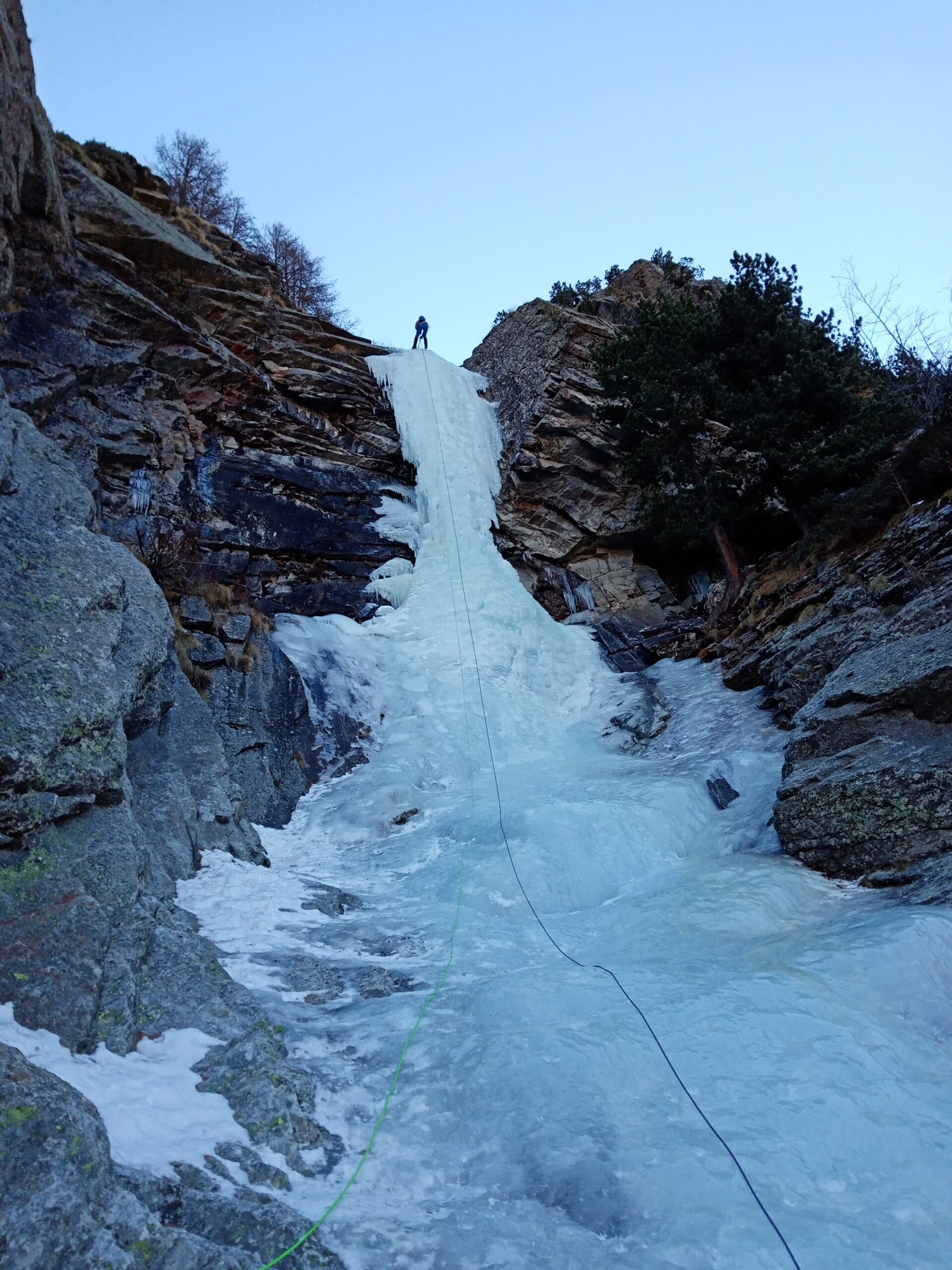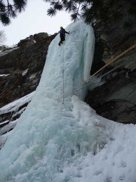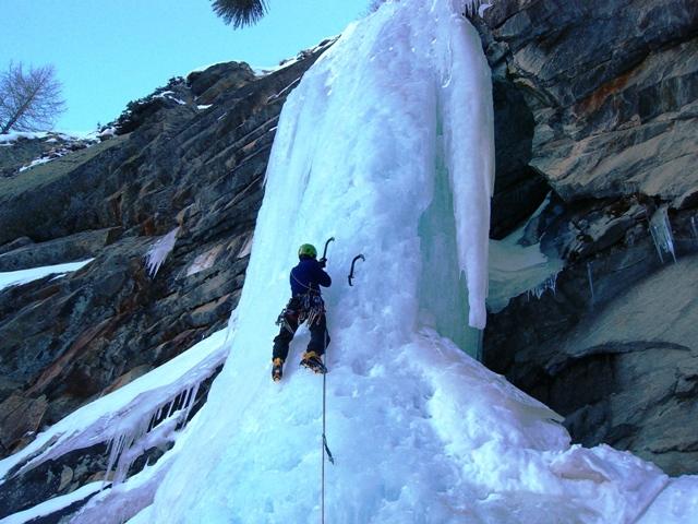 uscire dalla nicchia e attaccare il muro-candela nel centro per circa 10m e andare a sostare a sn su fix appena entrati nel canale finale (85° con brevissimo tratto a 90°)