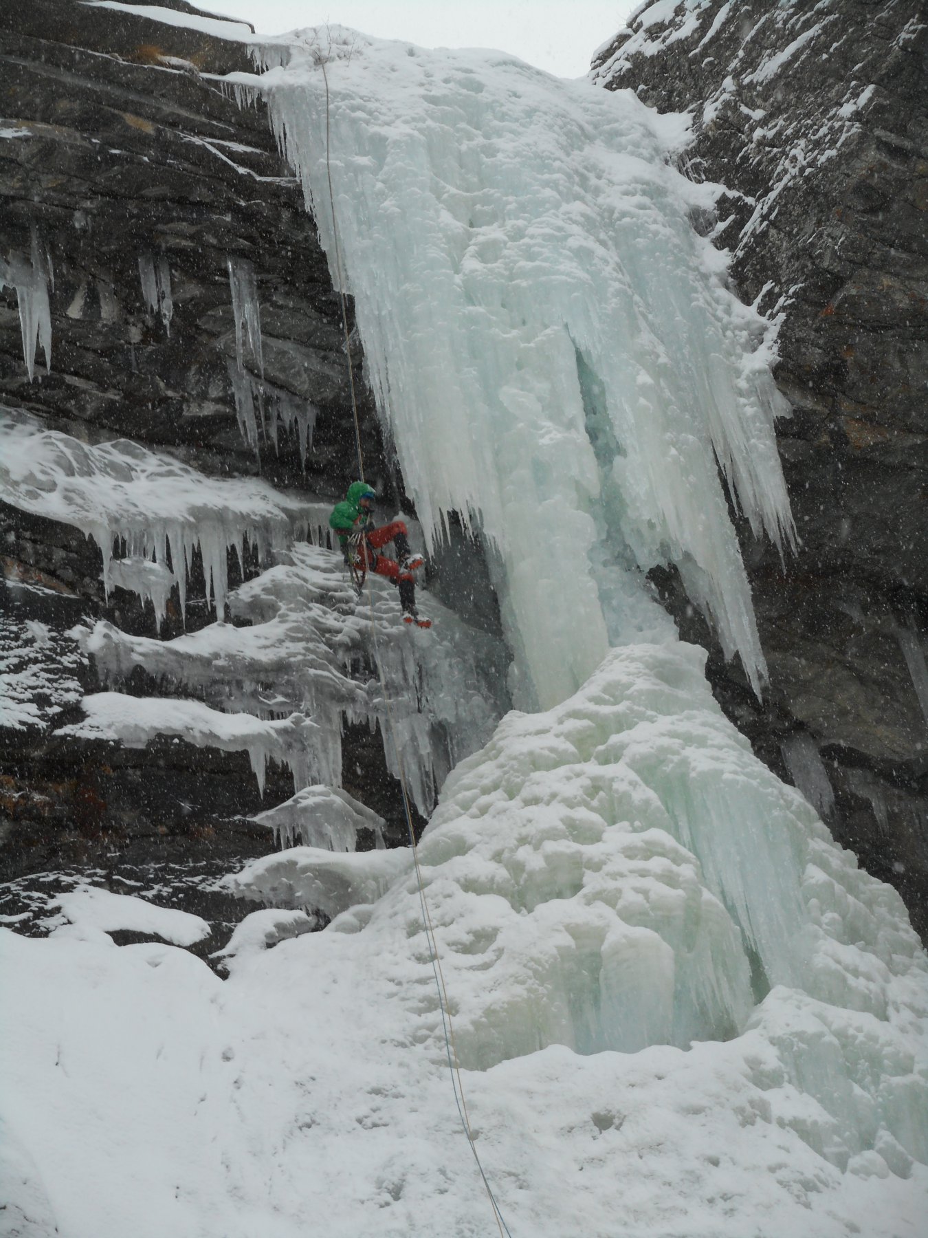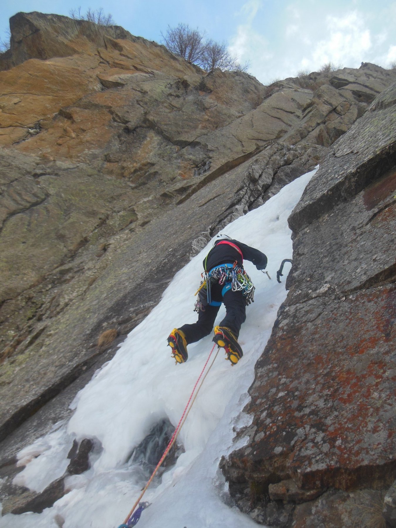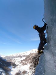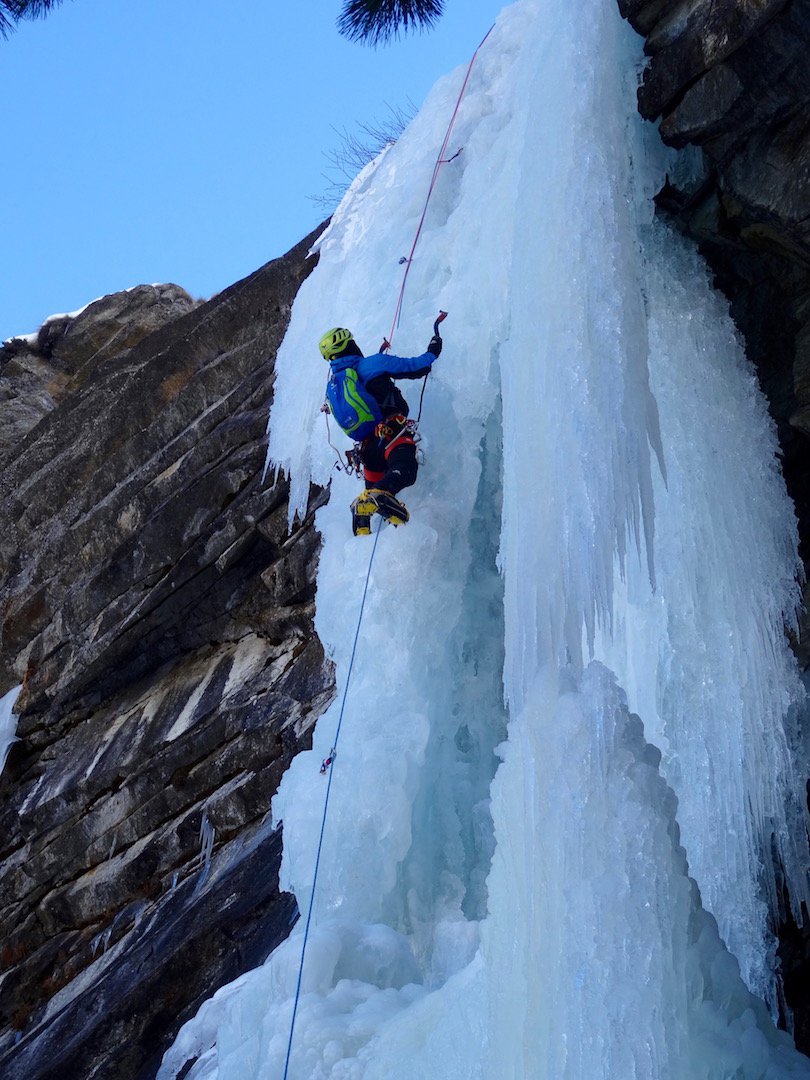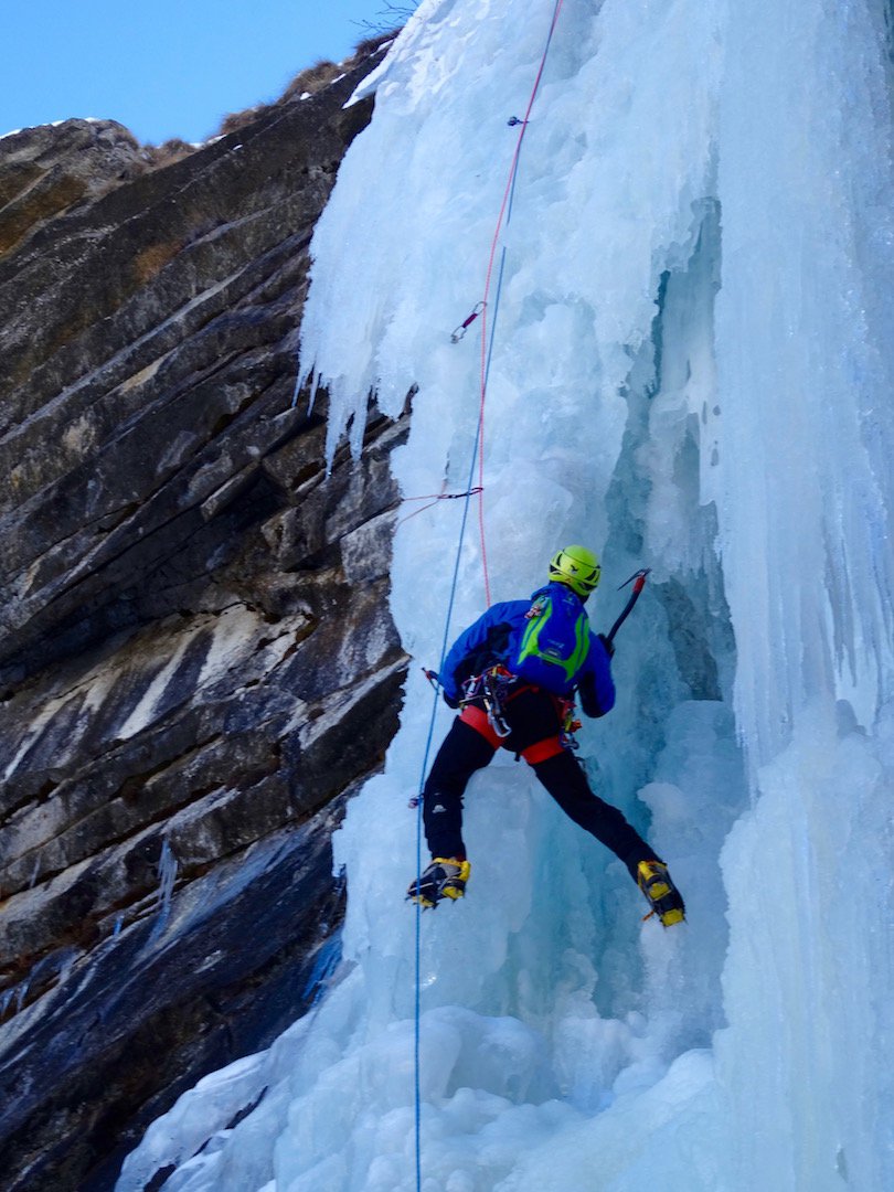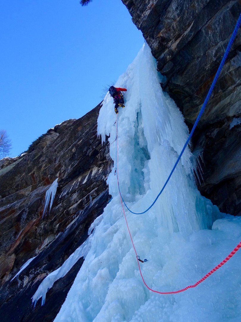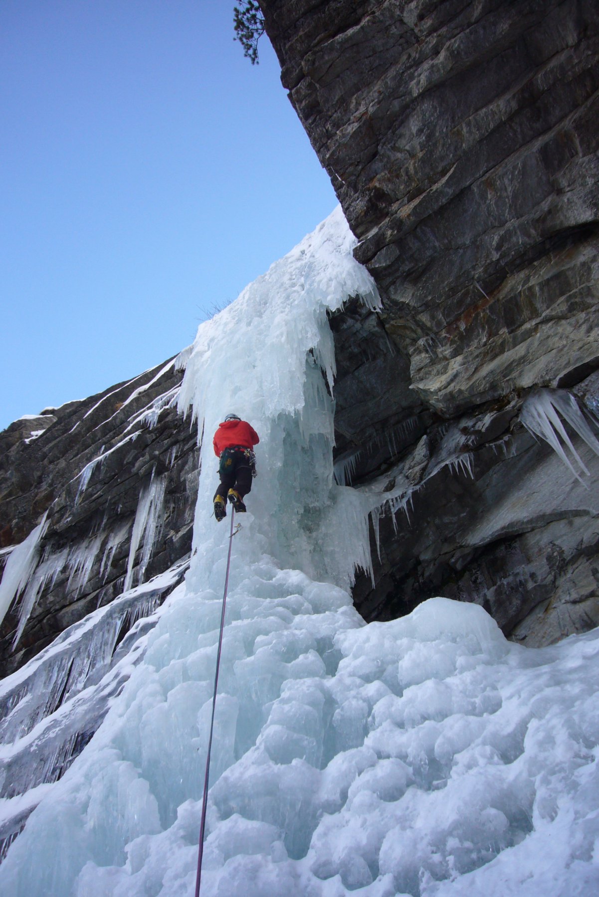 uscire dalla nicchia e attaccare il muro-candela nel centro per circa 10m e andare a sostare a sn su fix appena entrati nel canale finale (85° con brevissimo tratto a 90°)