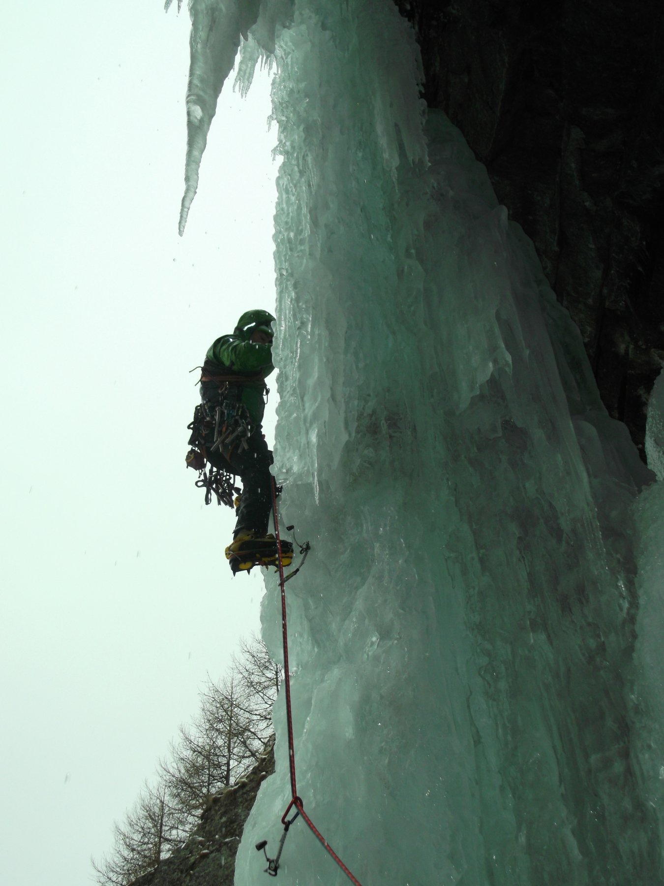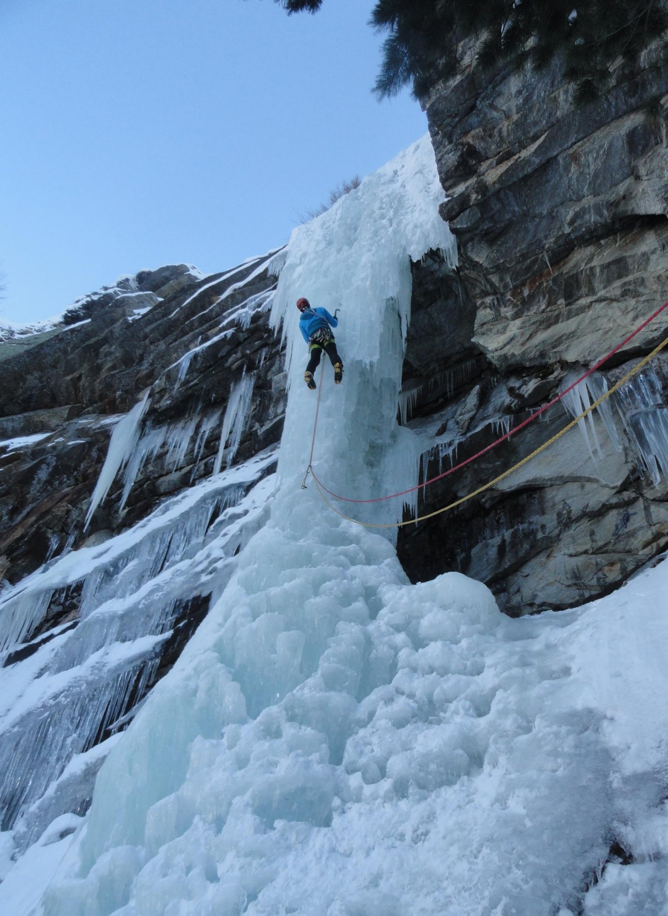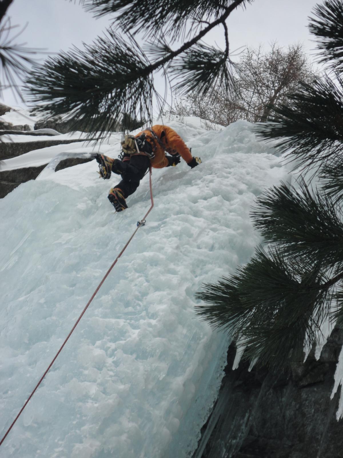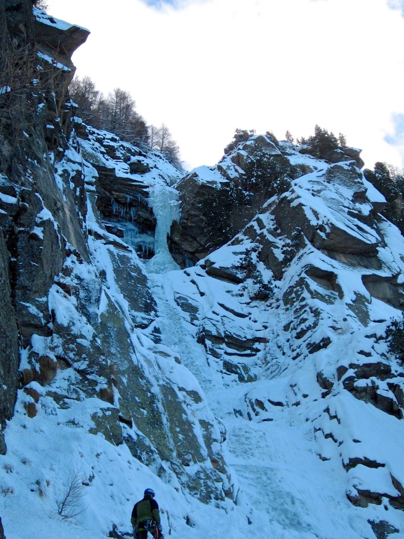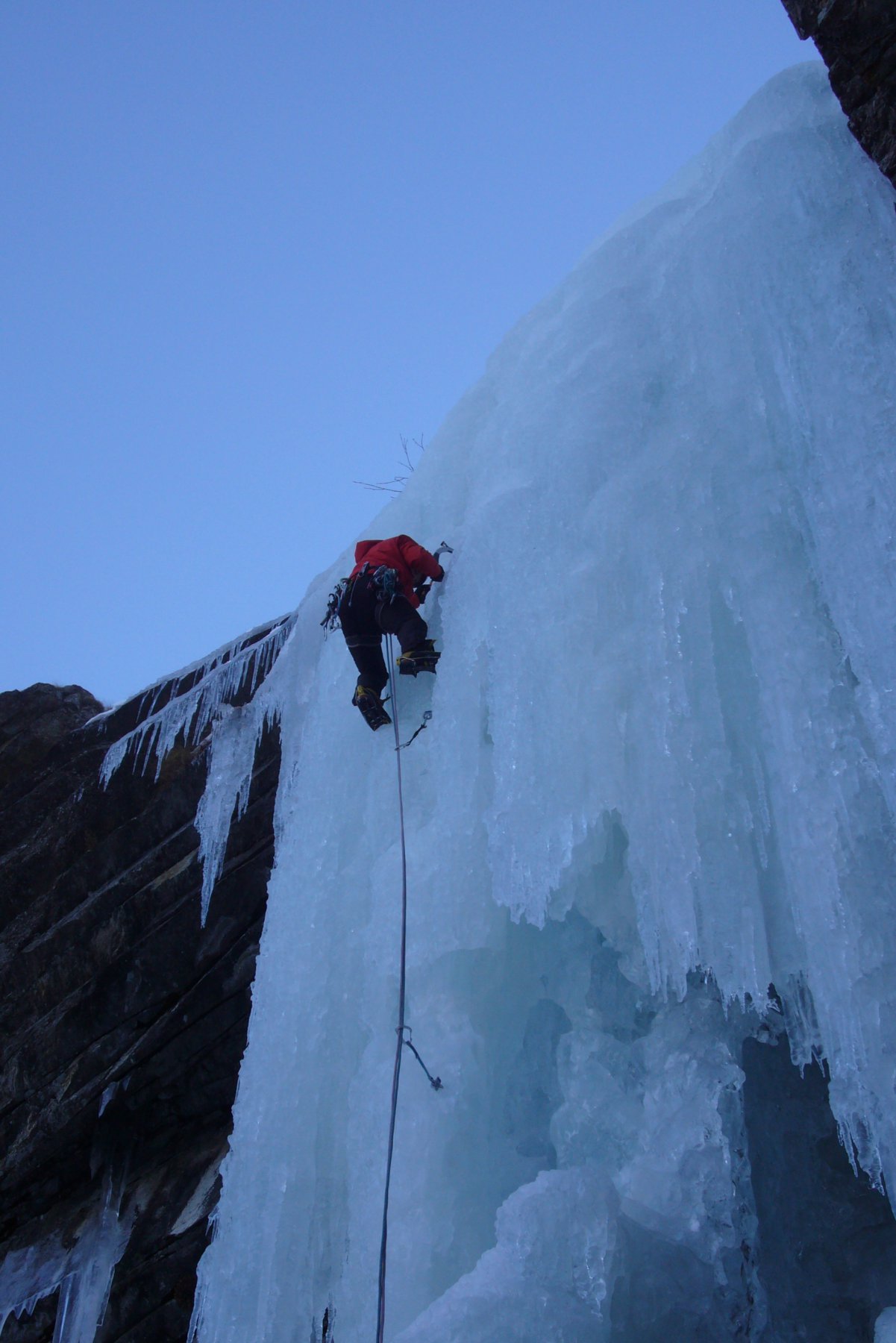 uscire dalla nicchia e attaccare il muro-candela nel centro per circa 10m e andare a sostare a sn su fix appena entrati nel canale finale (85° con brevissimo tratto a 90°)