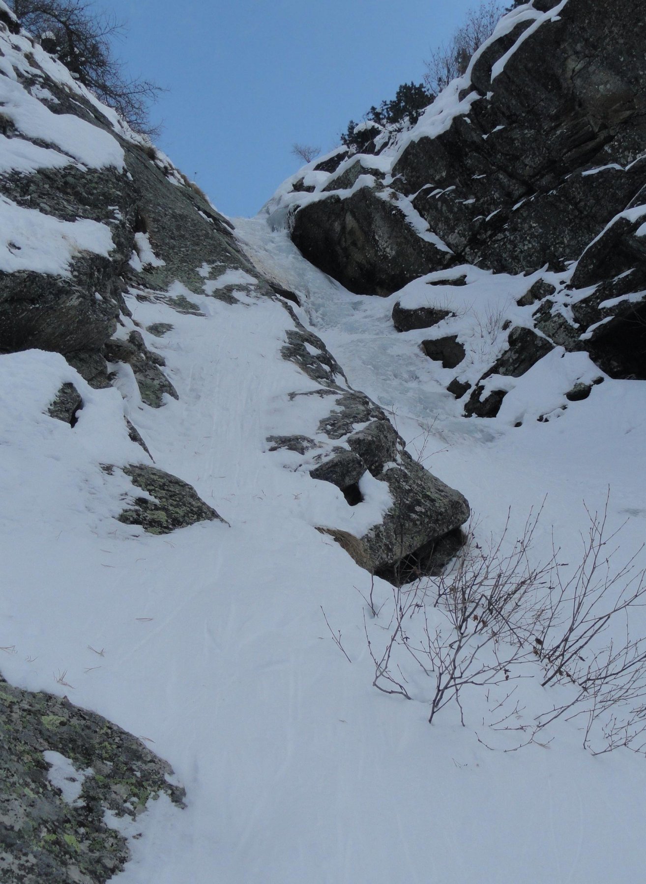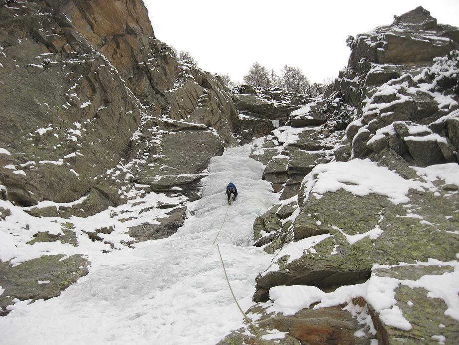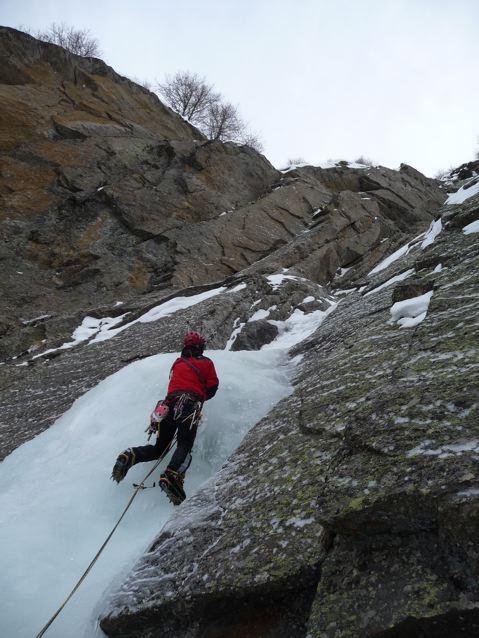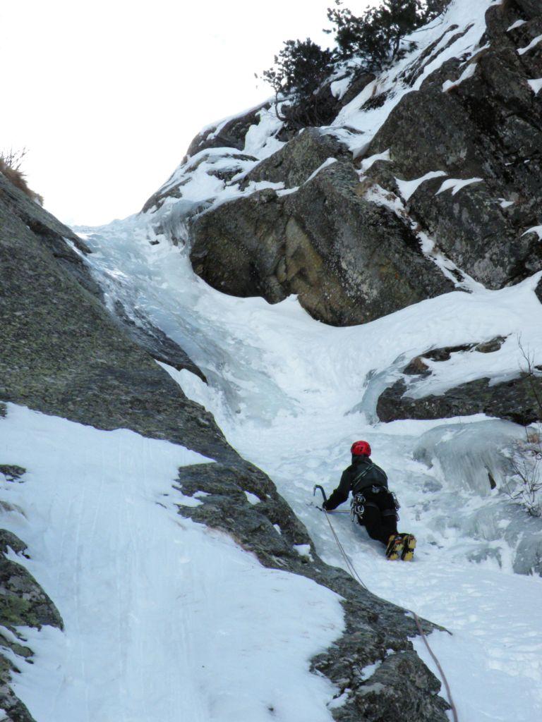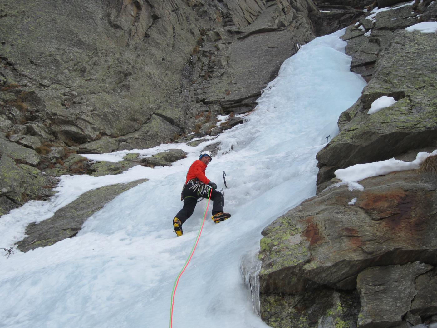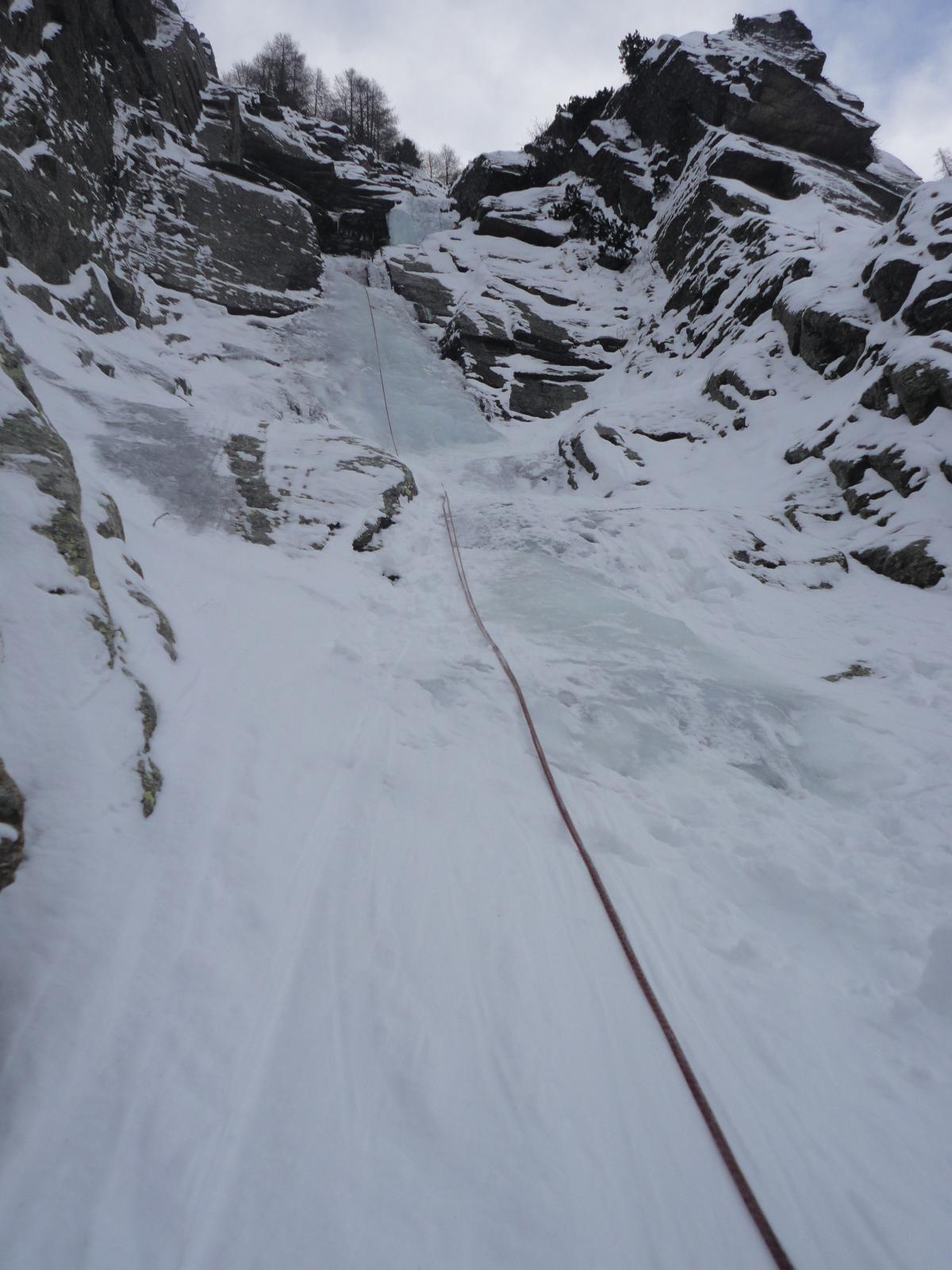 seguire lo scivolo iniziale 70° sino a toccare il canale nevoso (sosta a sn su fix 50m)