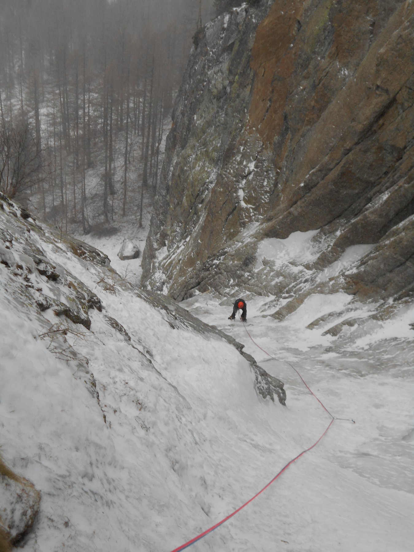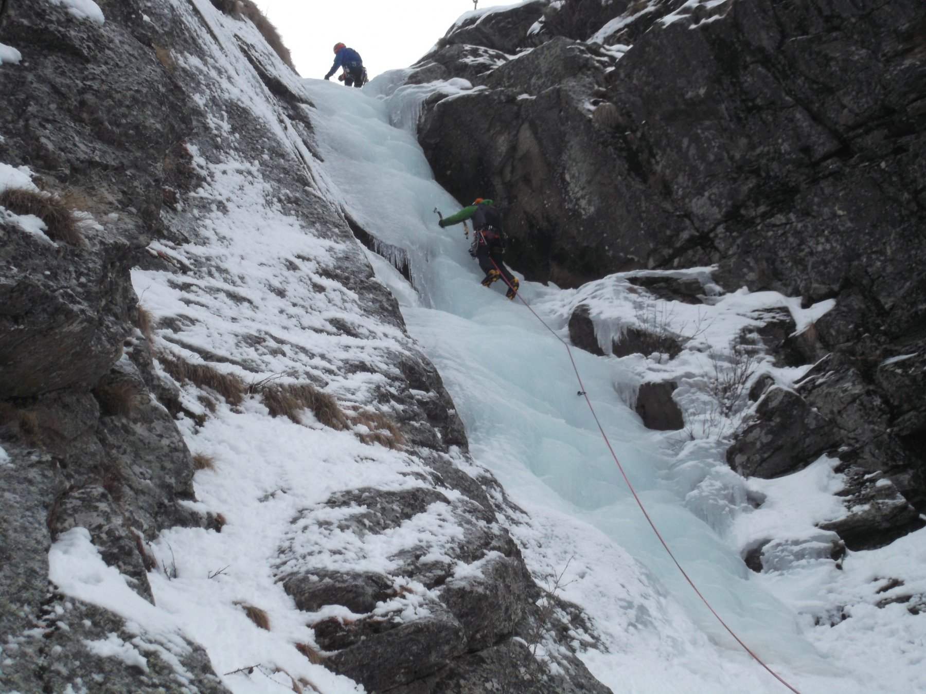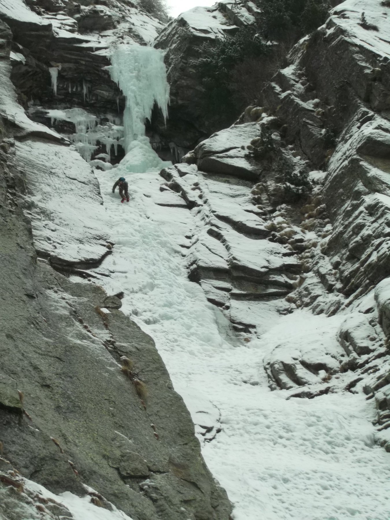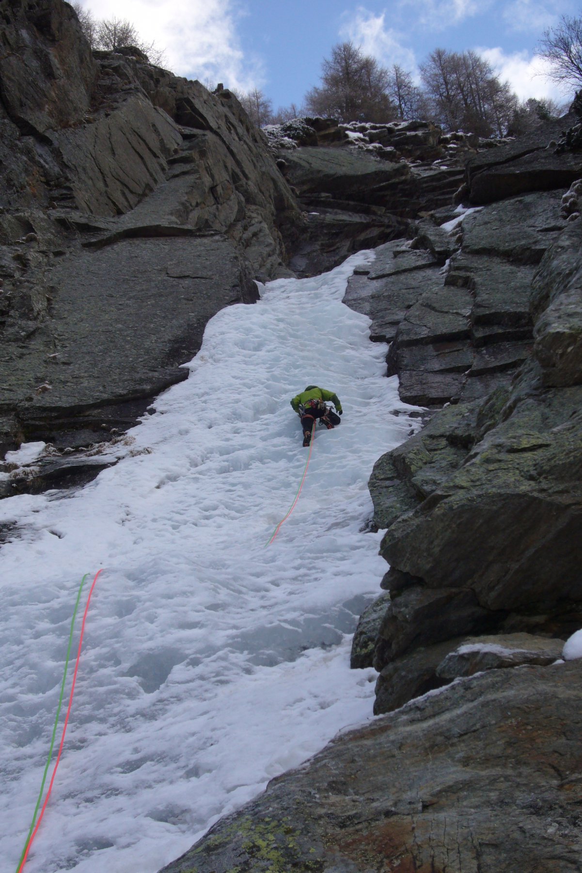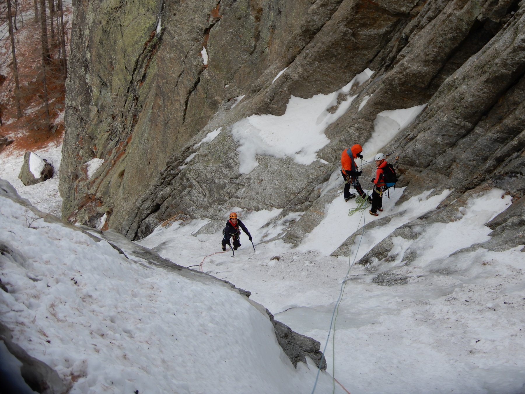 seguire lo scivolo iniziale 70° sino a toccare il canale nevoso (sosta a sn su fix 50m)