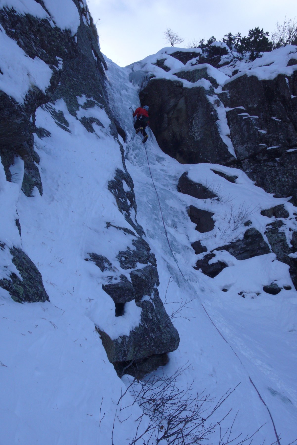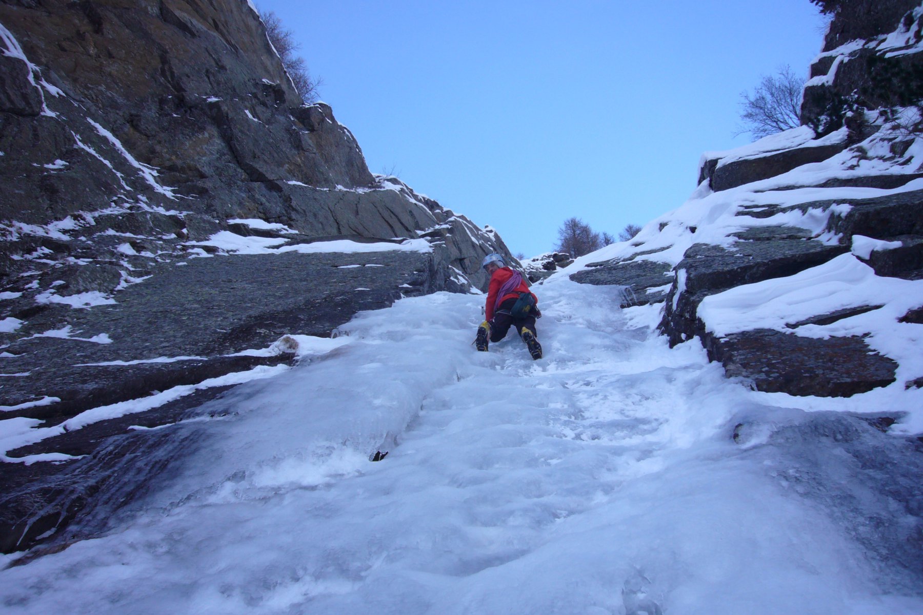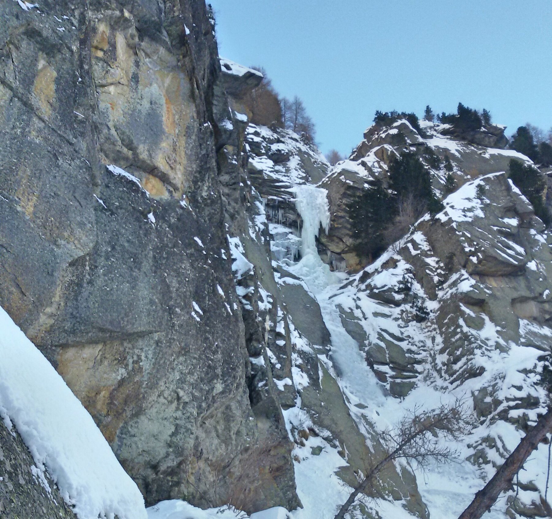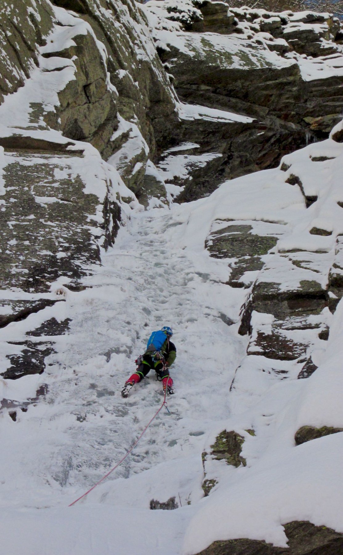 seguire lo scivolo iniziale 70° sino a toccare il canale nevoso (sosta a sn su fix 50m)