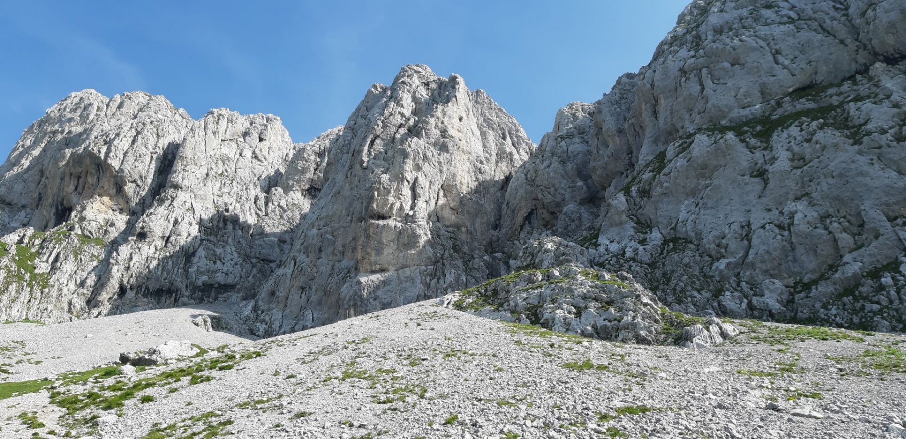 L4: muretti divertenti sopra la sosta, aggirare a sinistra il secondo bombamento poco pronunciato, al termine traverso a destra sotto un muro verticale. 20m, 5c.