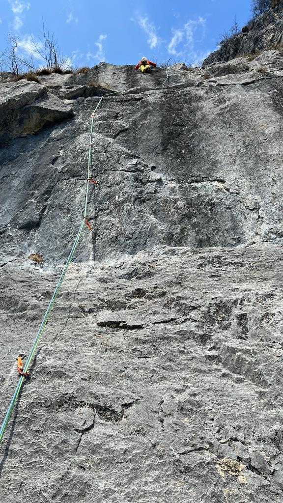 L6: muro verticale, o forse lievemente aggettante, con lame superficiali a destra e piccoli appoggi di piede sinistro. Da domare rigidamente con frusta e sgabello per pochi metri poi buon riposo sui piedi. Traverso a destra e ultimi metri con cambio di assetto: due tacche nettissime da arcuare allo spasmo come piace a noi incapaci, spaccata ampia che può aiutare ad alzare il baricentro. Buchetti nascosti ben a sinistra, due/tre passi sulle punte dei piedi e si agguanta la sosta. 30m, 6c. Superlativo.