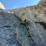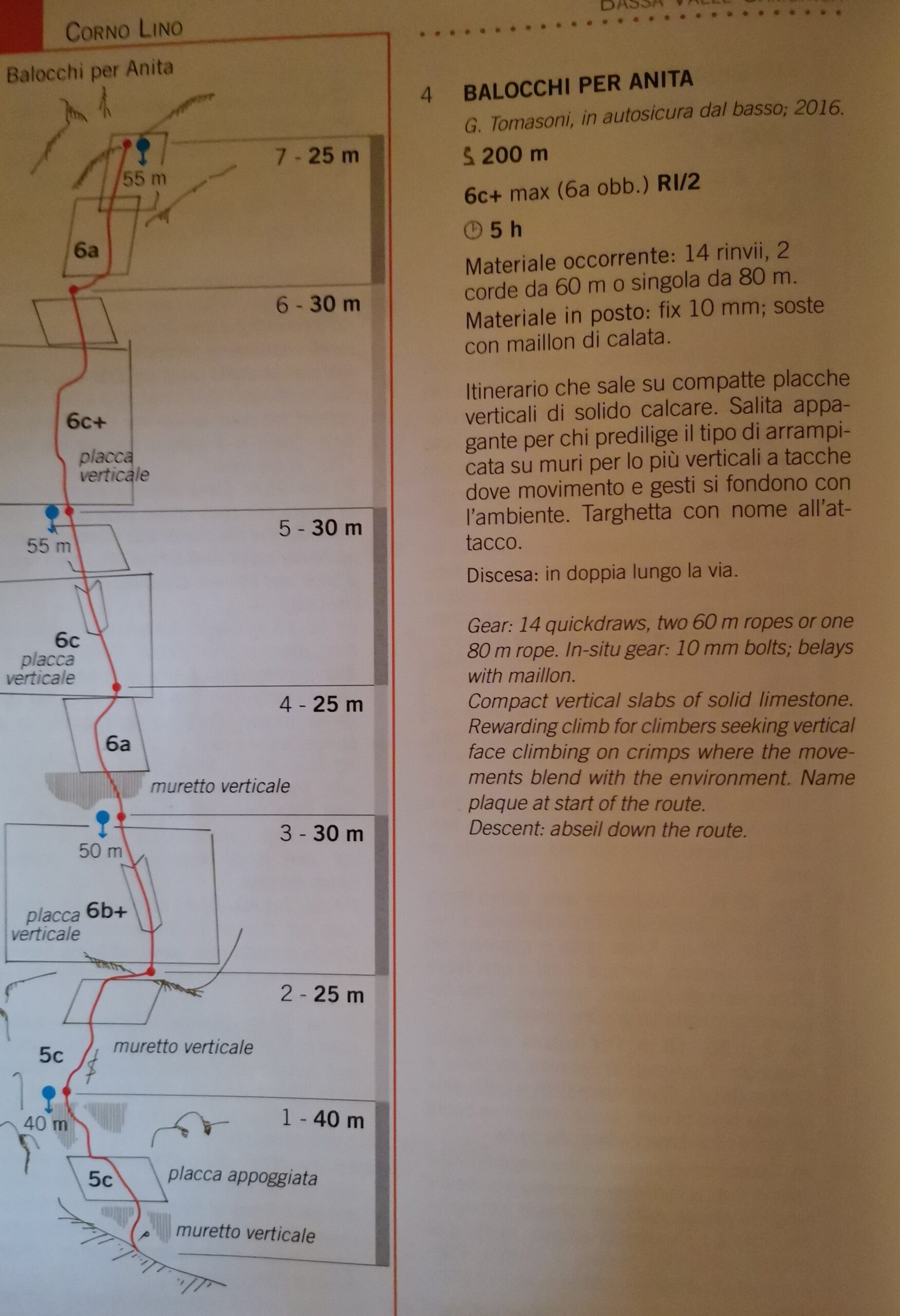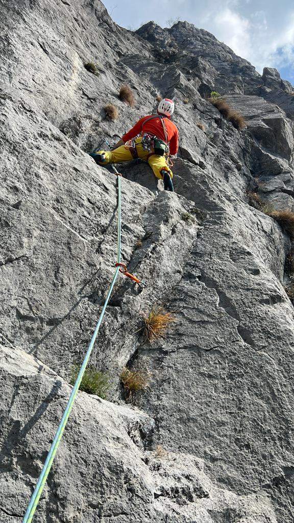 L3: diedro sopra la sosta, assai estetico e tennico. Crux in traverso verso sinistra delicato sui piedi e due tacche obbligatorie, poi pochi metri abbattuti sotto una favolosa fessura laterale e in leggero surplomb che richiede ancora un poco di energia. 35m, 6b+. Spettacolare.