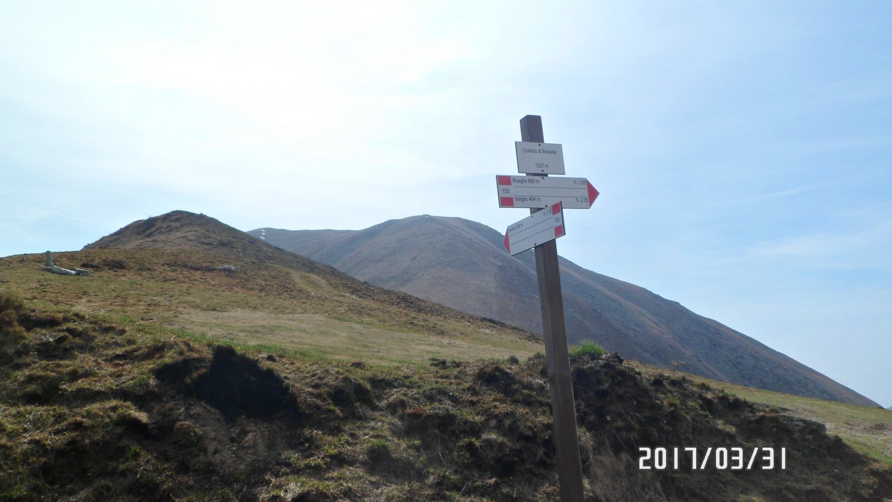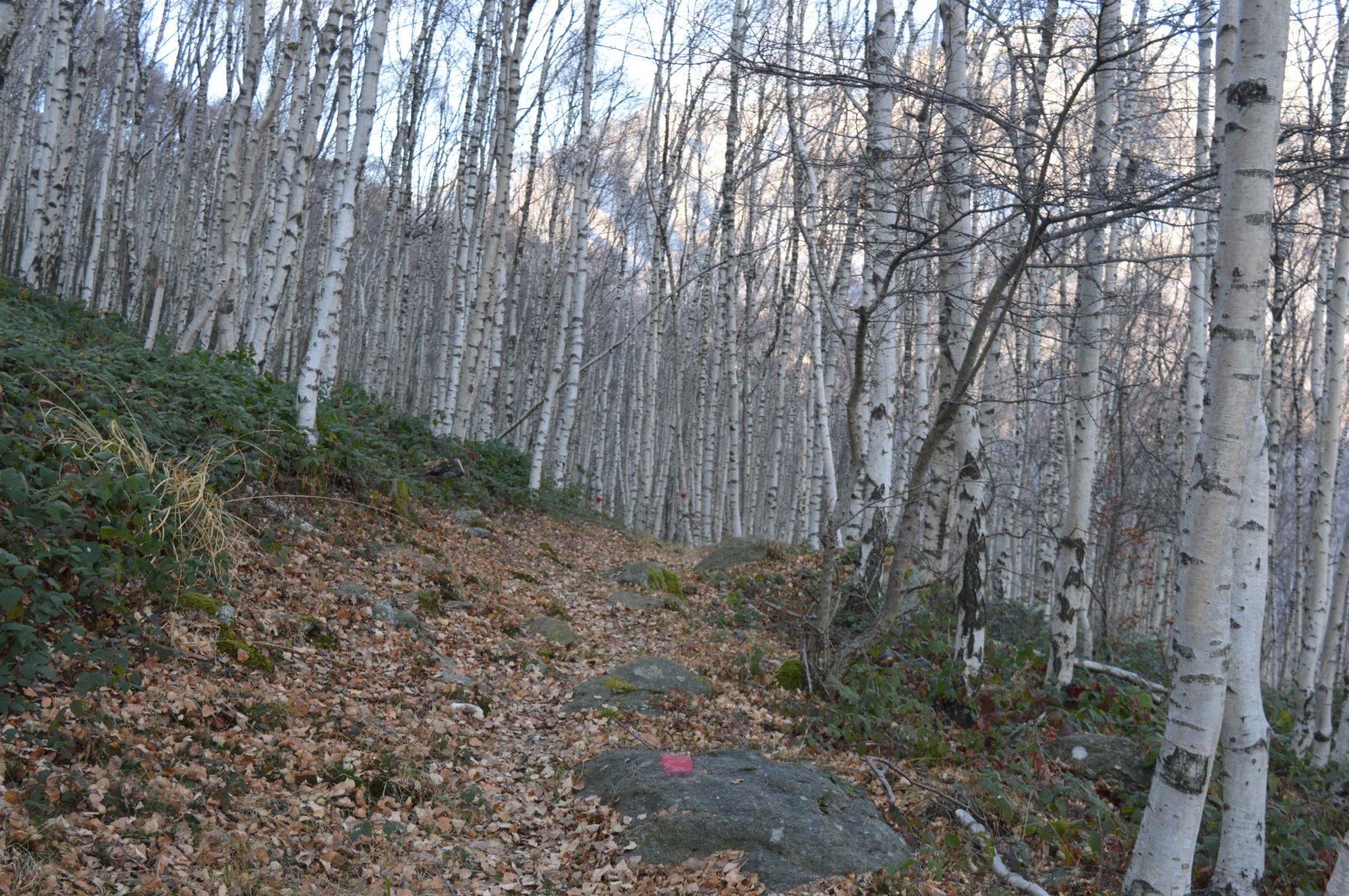 Seguire in salita come da indicazione “ C. Bossola” il sentiero fra gli arbusti seguendo i bolli rossi di vernice sui massi o piante, entrare nel bosco verso destra e giunti ad un bivio, 1000 m circa, svoltare a sinistra e seguire il sentiero che con un lungo traverso a saliscendi verso sud, giunge ad un successivo bivio, di quota 1020 m circa.
