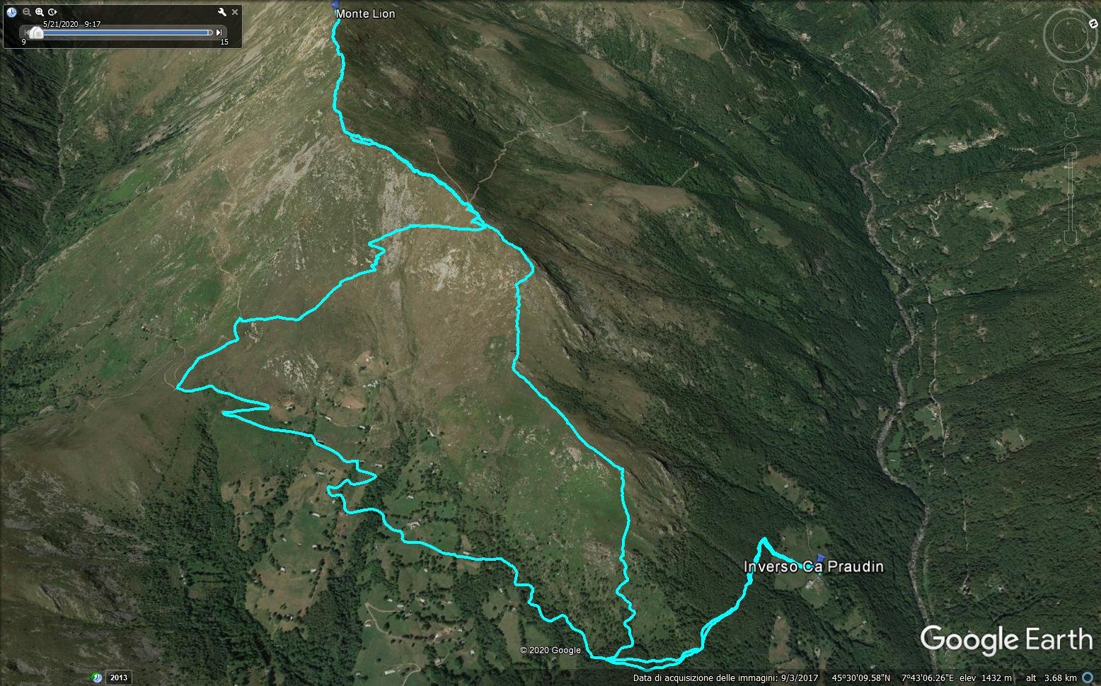 Discesa sullo stesso percorso di salita, con possibilità di una piccola variante ad anello, dove giunti in discesa nei pressi della quota 1627, si svolta a destra raggiungendo l’Alpe Laser, 1625 m; si prosegue nella discesa, sempre segnavia con paline in legno e traversina a freccia di colore rosso, giungendo alla sterrata dell’Alpe Moriondo, un centinaio di metri più in alto del Colletto di Bossola che si raggiunge in breve; dal colletto si scende su sterrata fino al tornante di quota 1101 dove si riprende il sentiero del Praudino giungendo in breve al bivio di quota 1020, punto di incontro del percorso fatto in salita; da questo si fa rientro alla macchina.