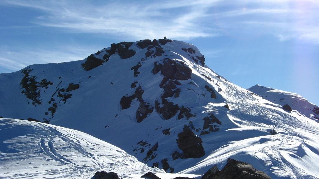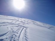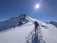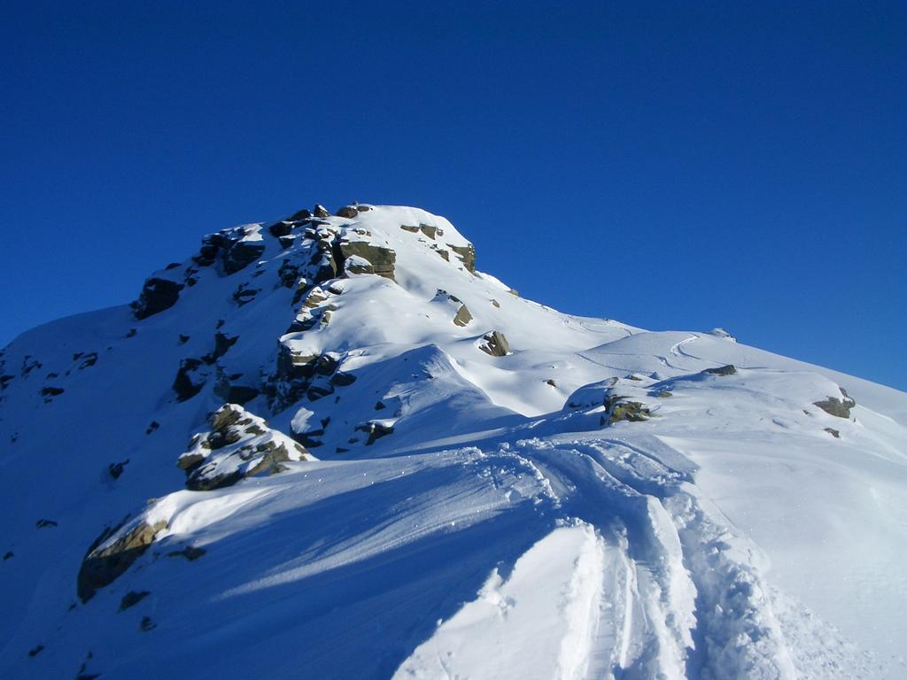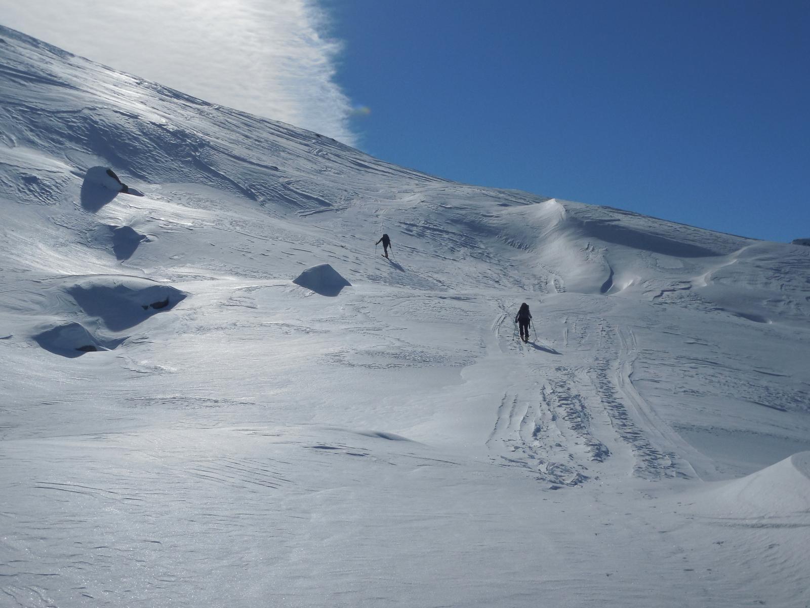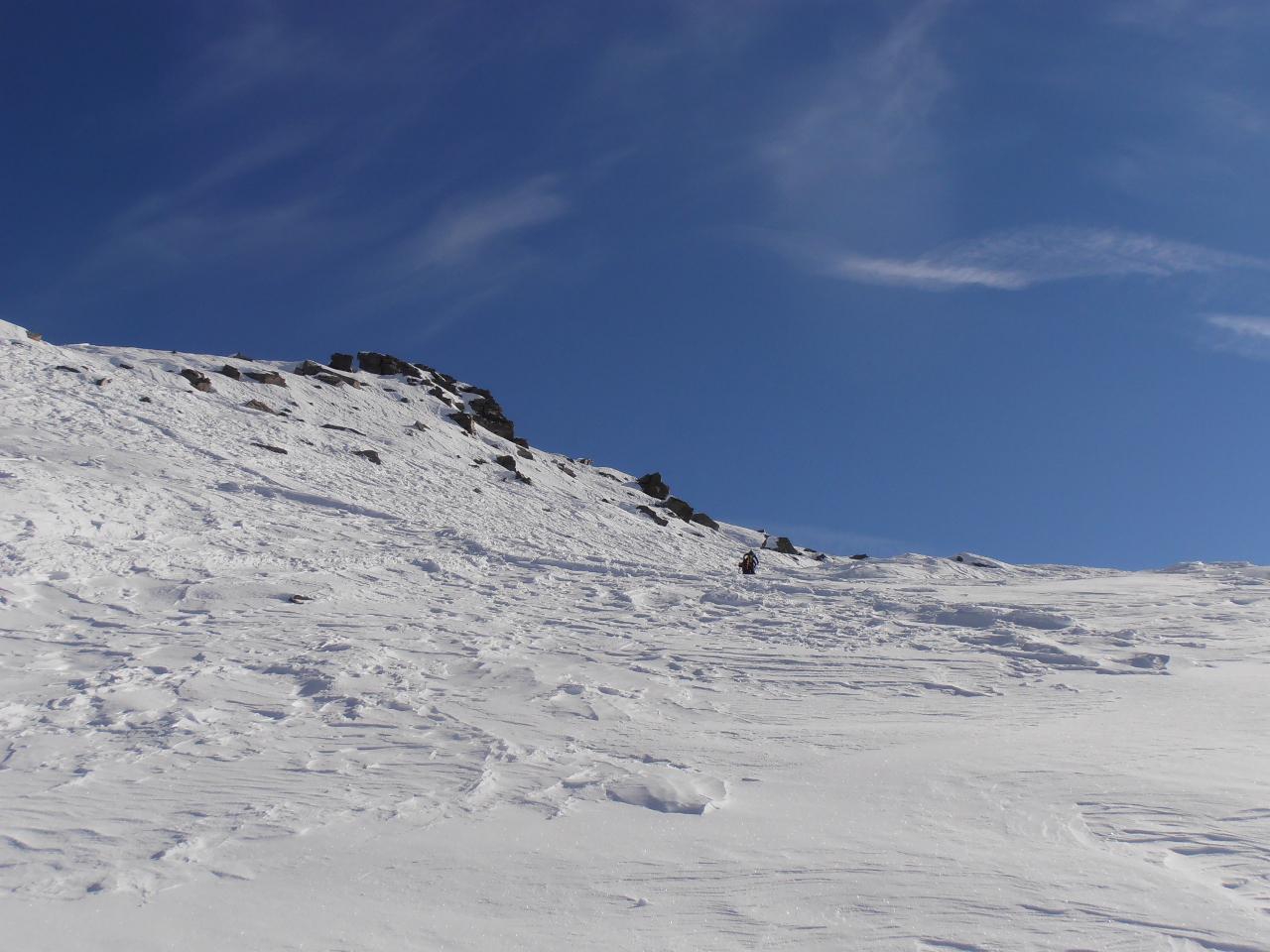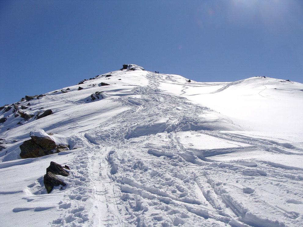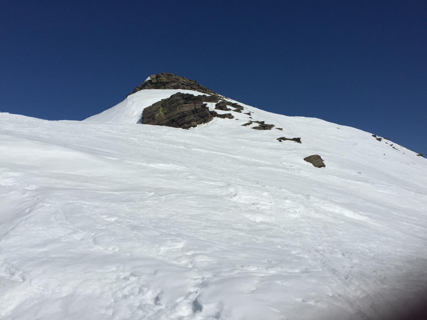 Qui svoltare a dx e continuare a salire per bei terreni verso SE, fino sotto la verticale della vetta. Per più ripidi pendii e qualche roccetta in breve alla sommità.