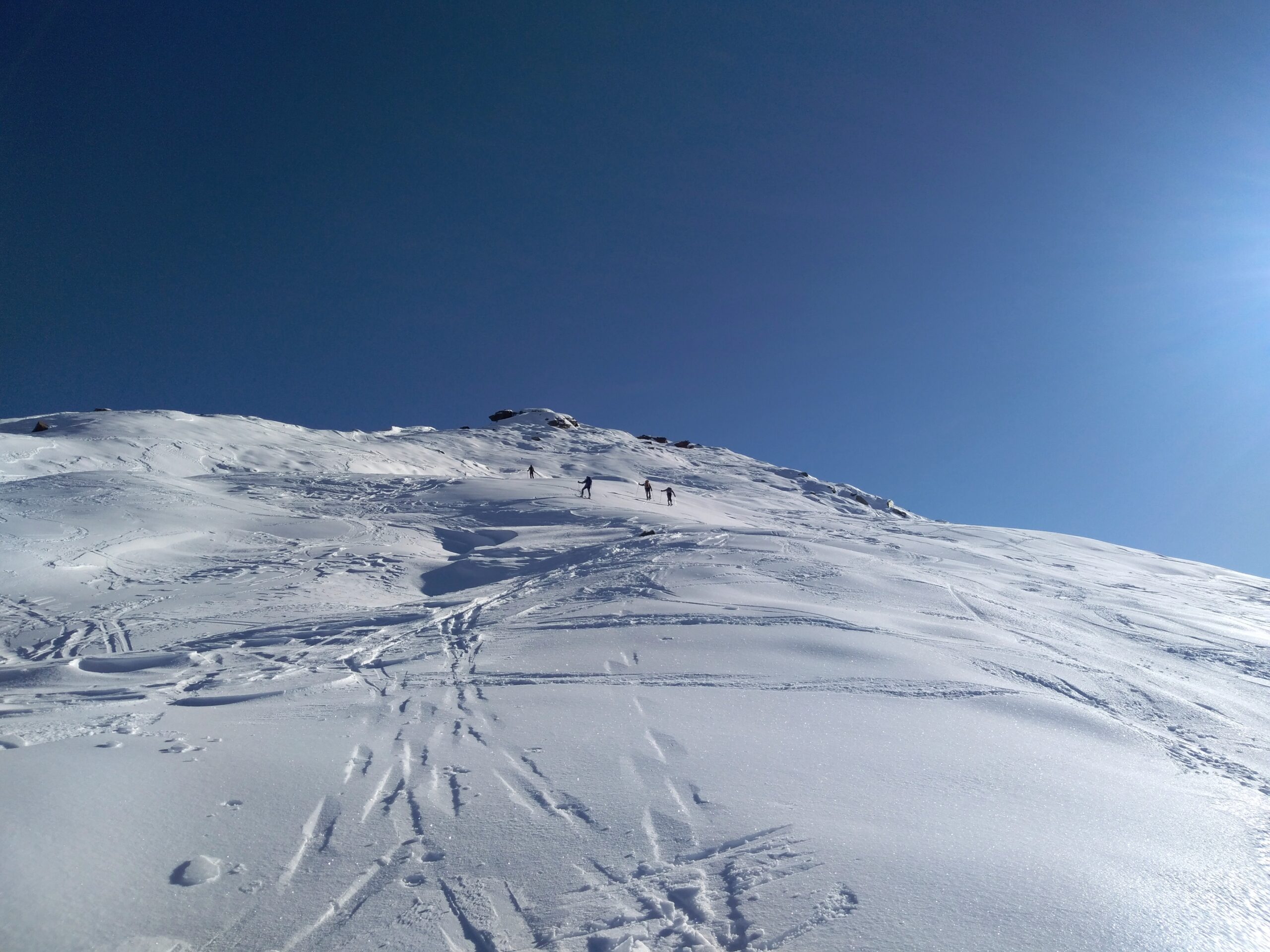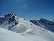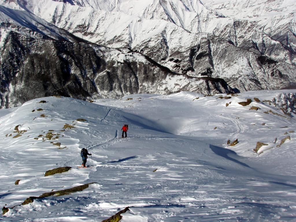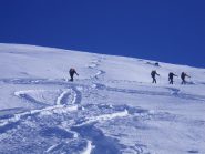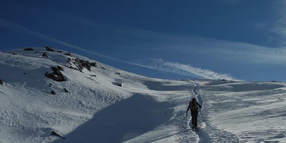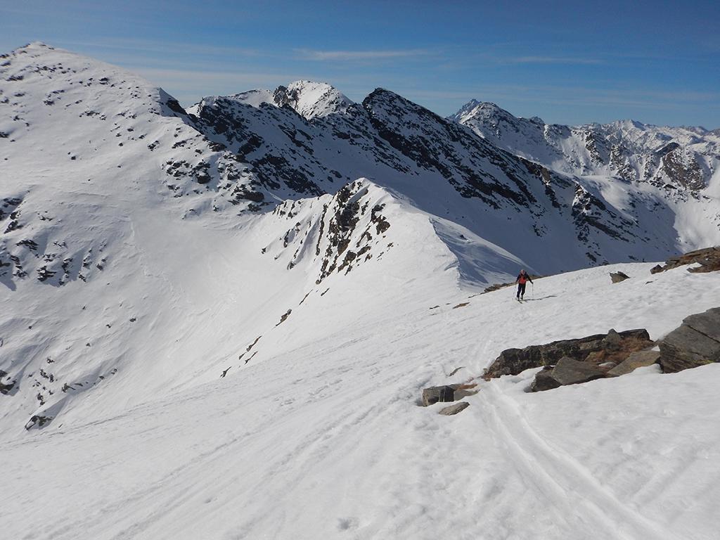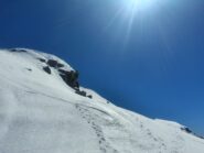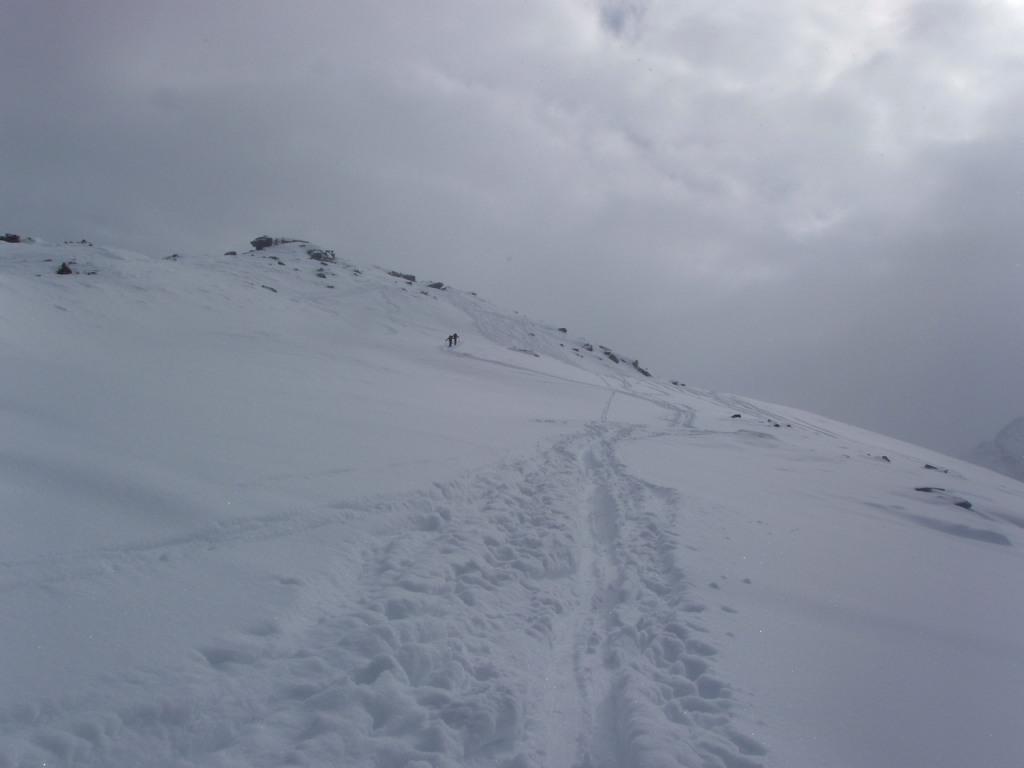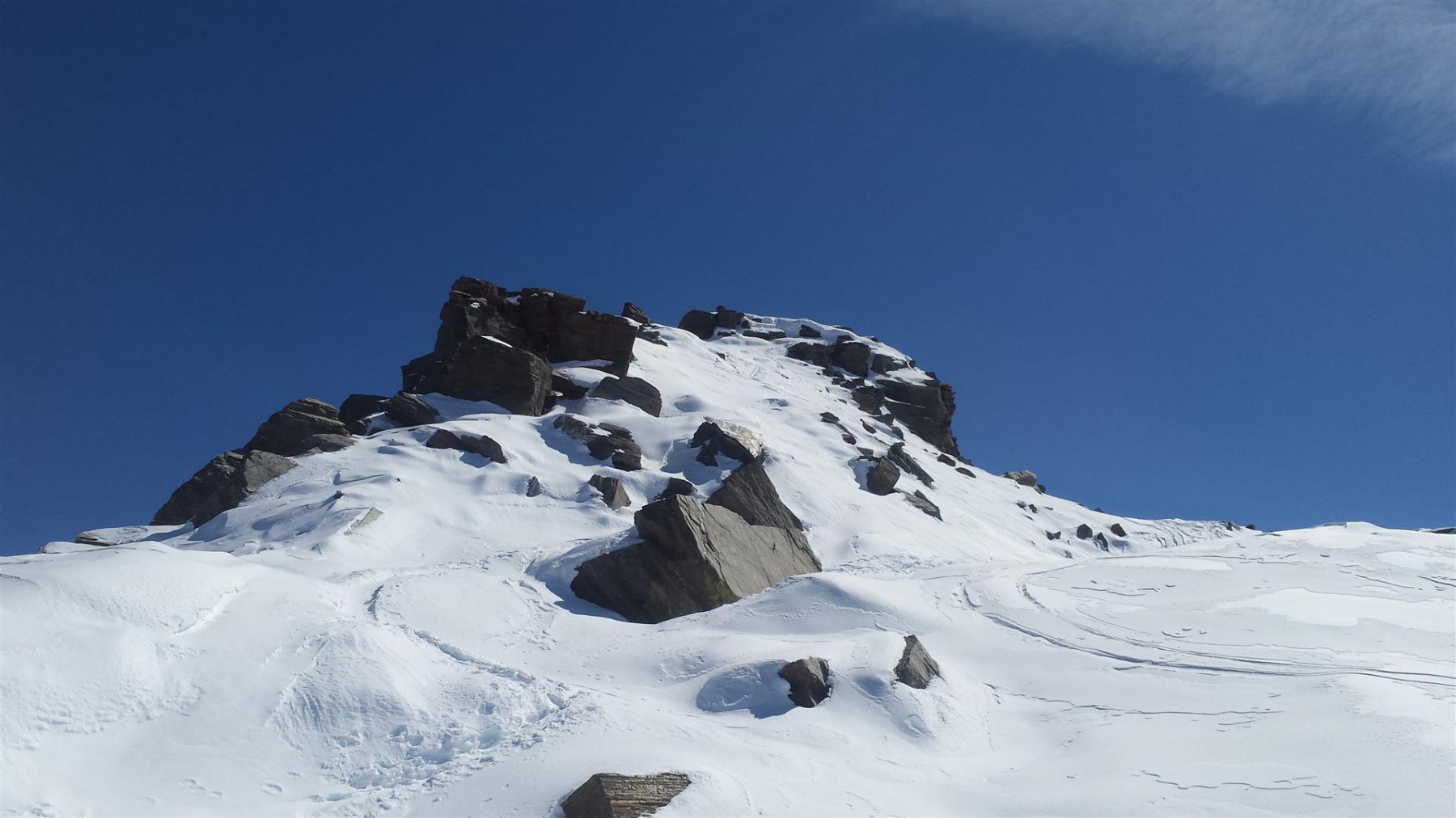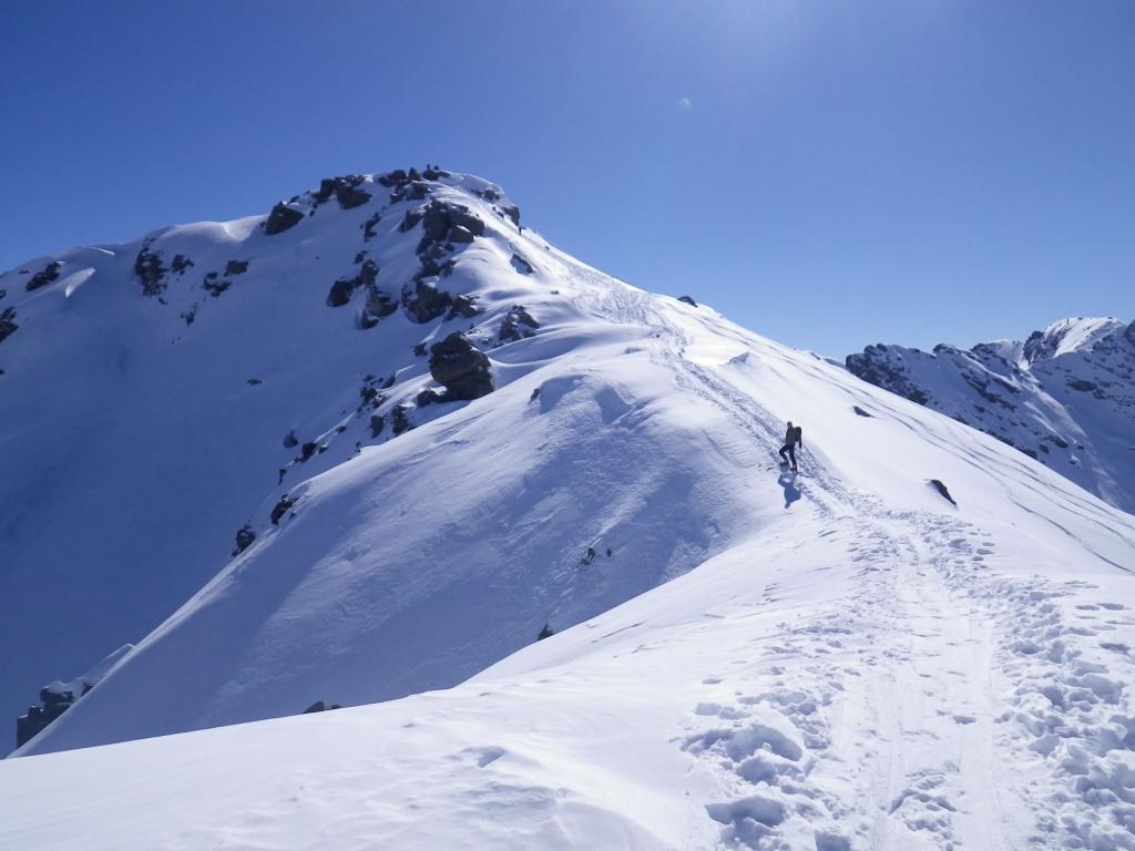 Qui svoltare a dx e continuare a salire per bei terreni verso SE, fino sotto la verticale della vetta. Per più ripidi pendii e qualche roccetta in breve alla sommità.