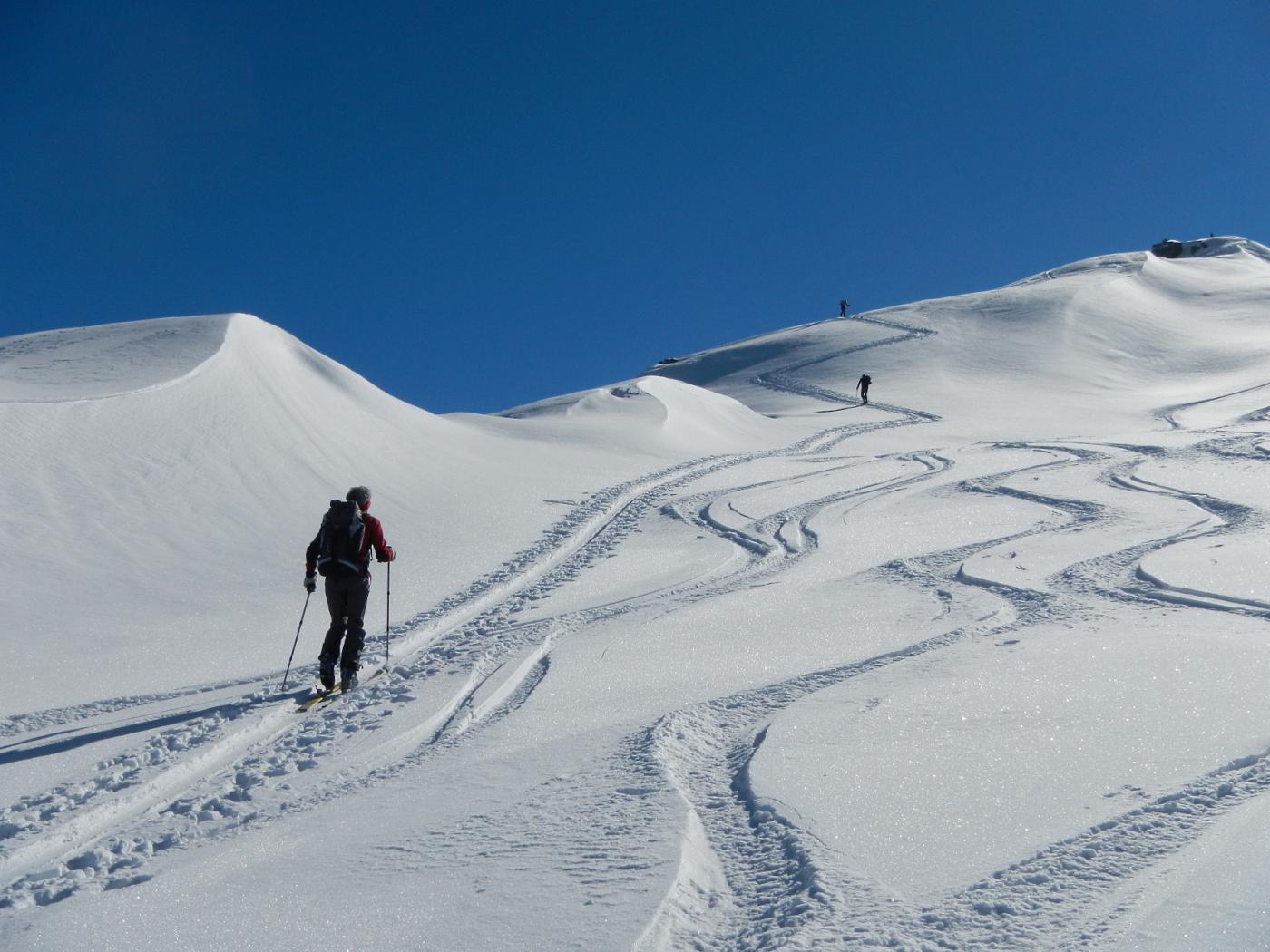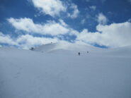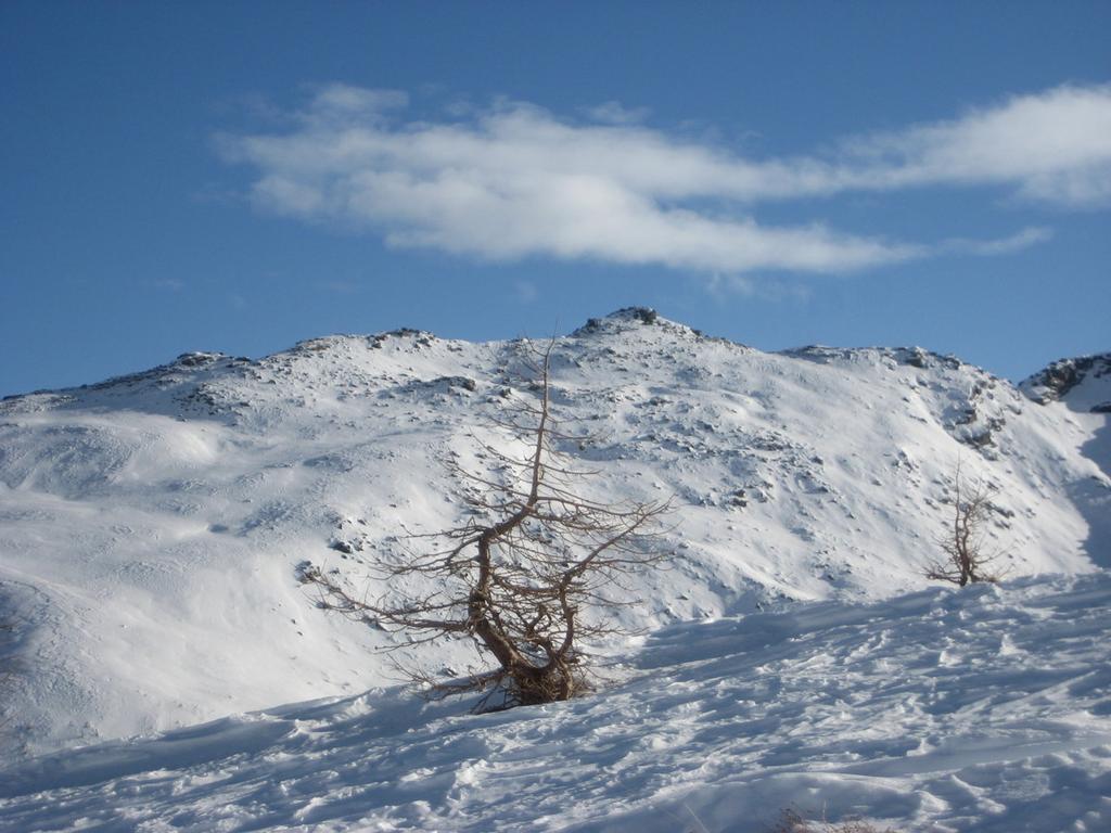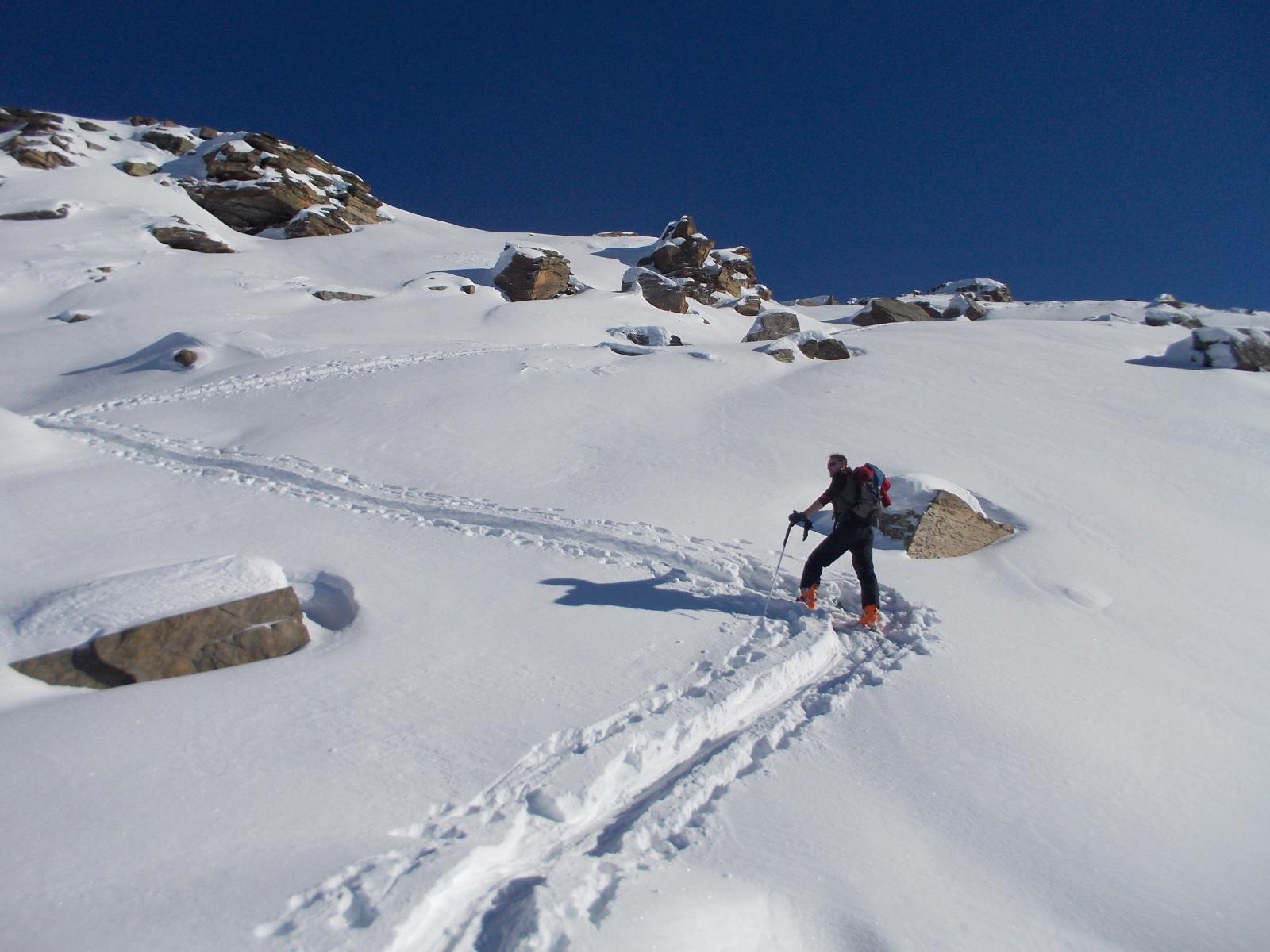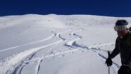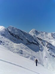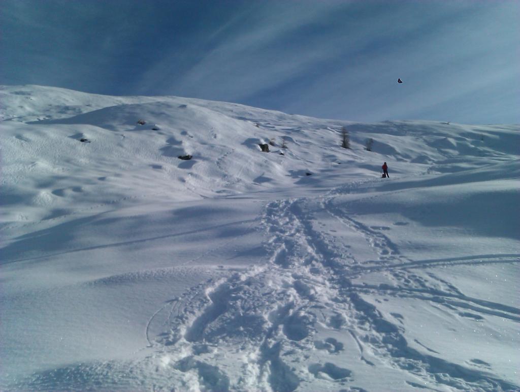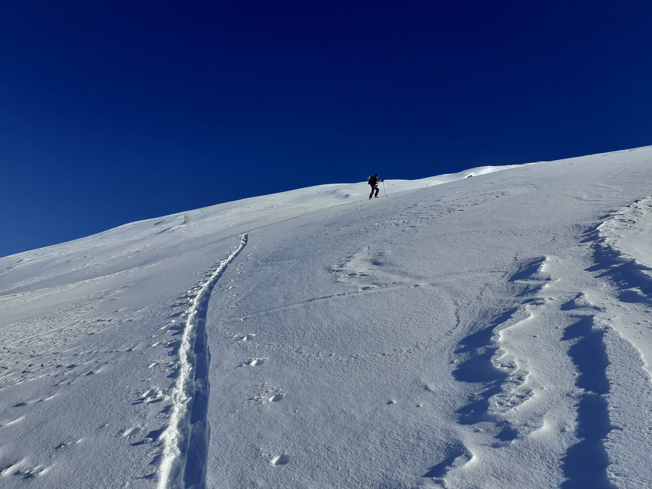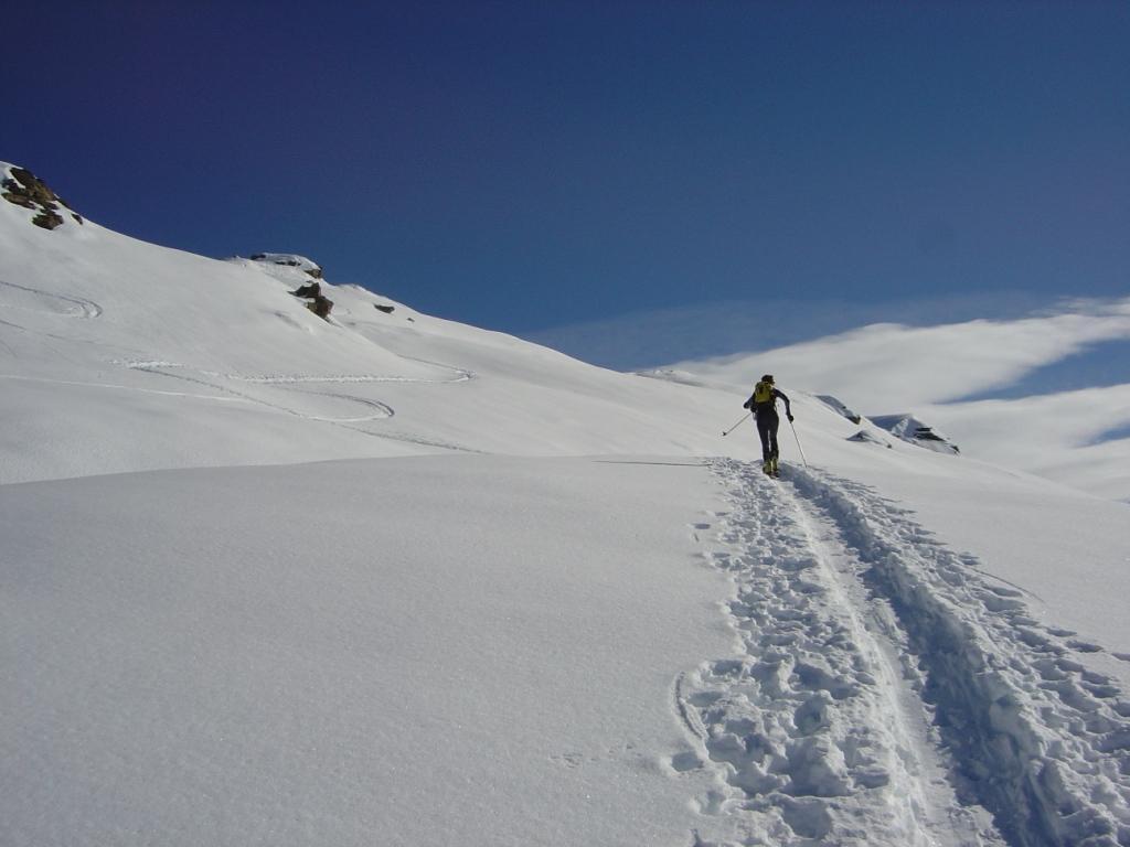 Qui svoltare a dx e continuare a salire per bei terreni verso SE, fino sotto la verticale della vetta. Per più ripidi pendii e qualche roccetta in breve alla sommità.