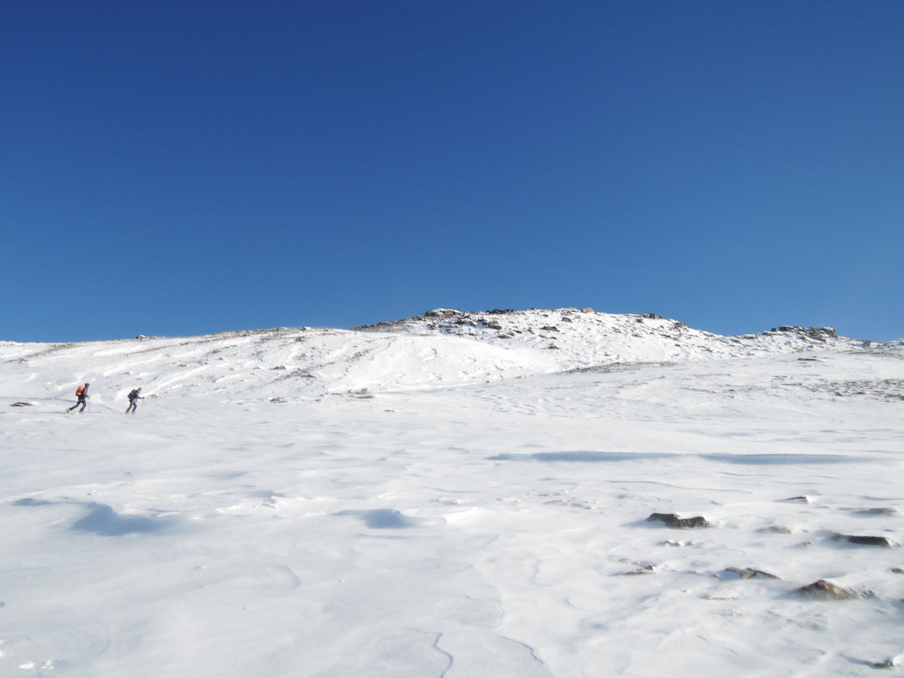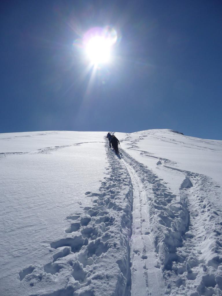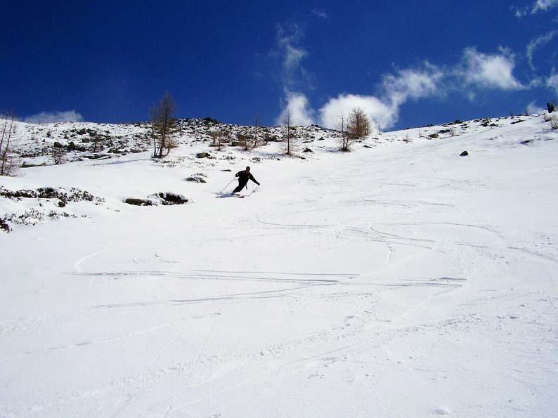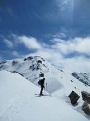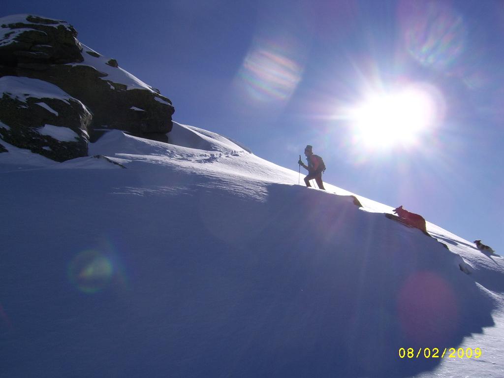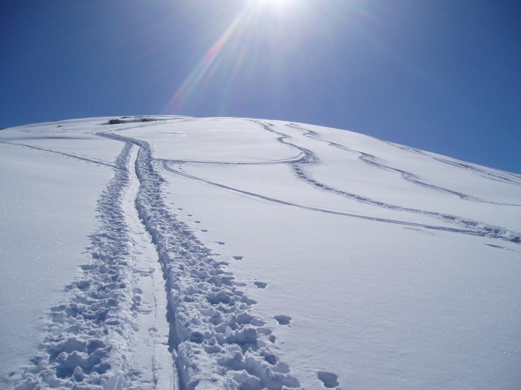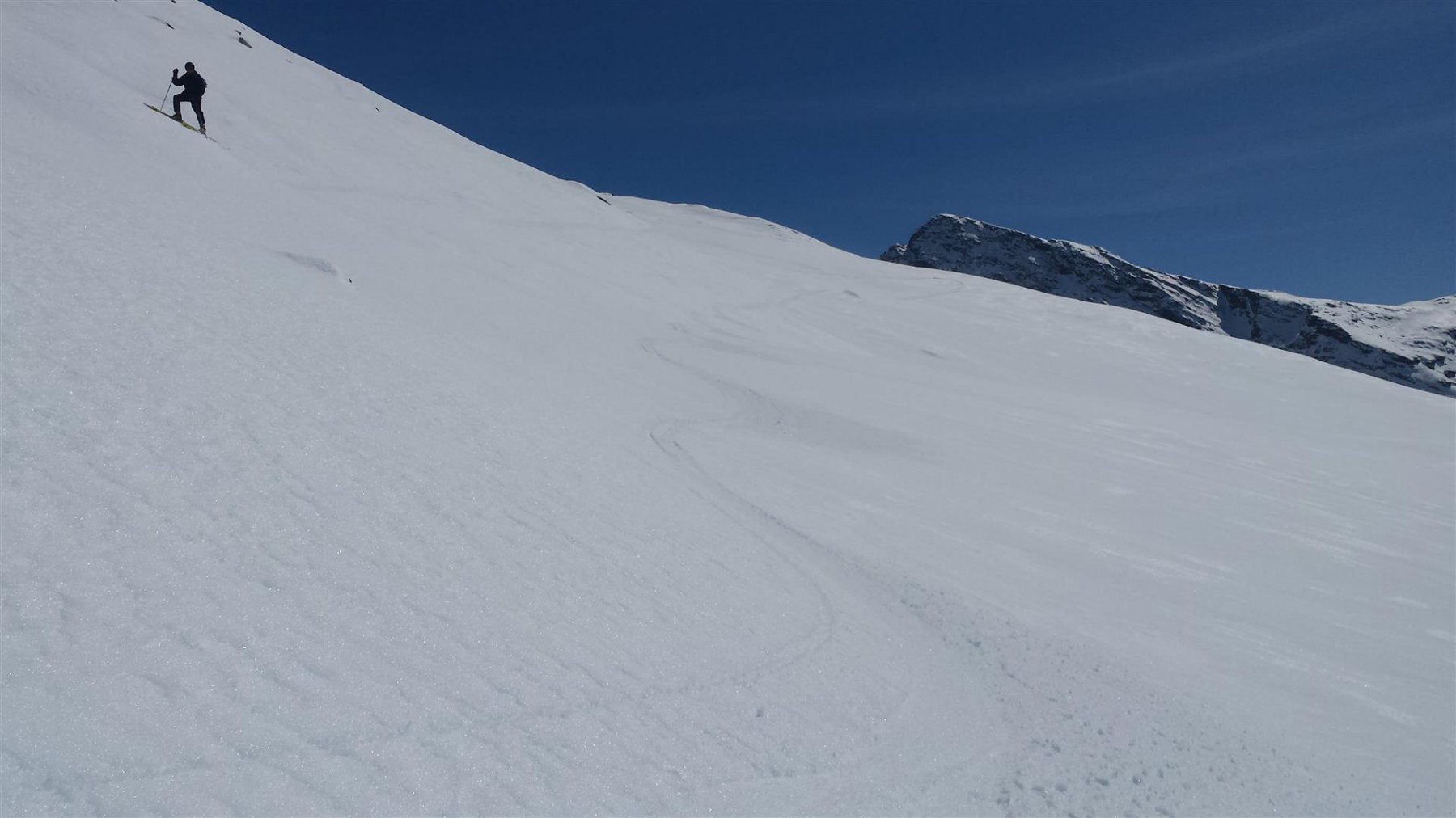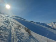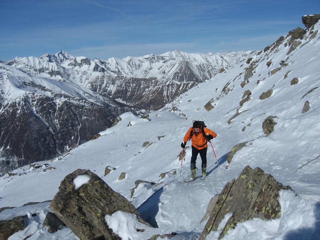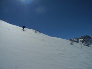 Qui svoltare a dx e continuare a salire per bei terreni verso SE, fino sotto la verticale della vetta. Per più ripidi pendii e qualche roccetta in breve alla sommità.