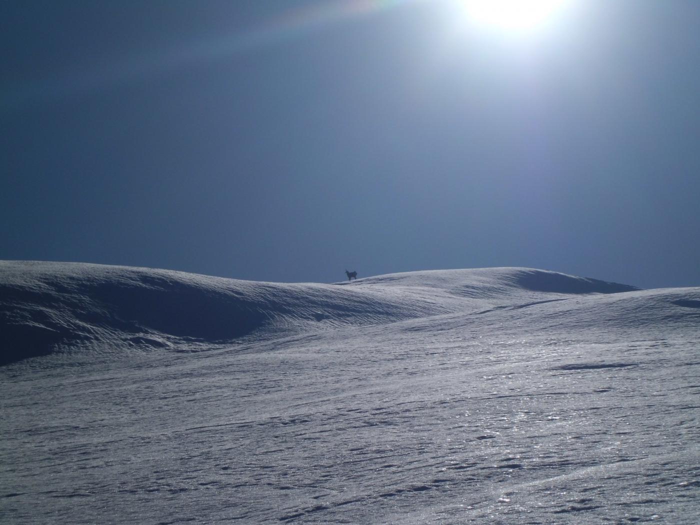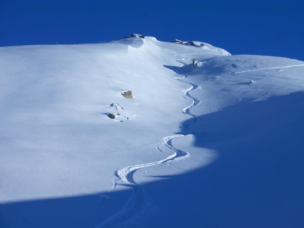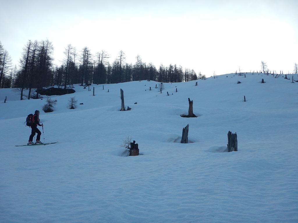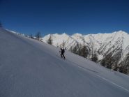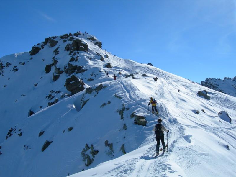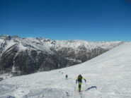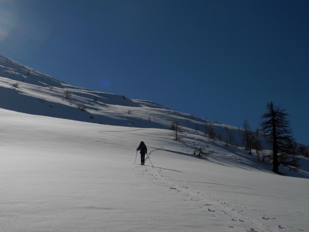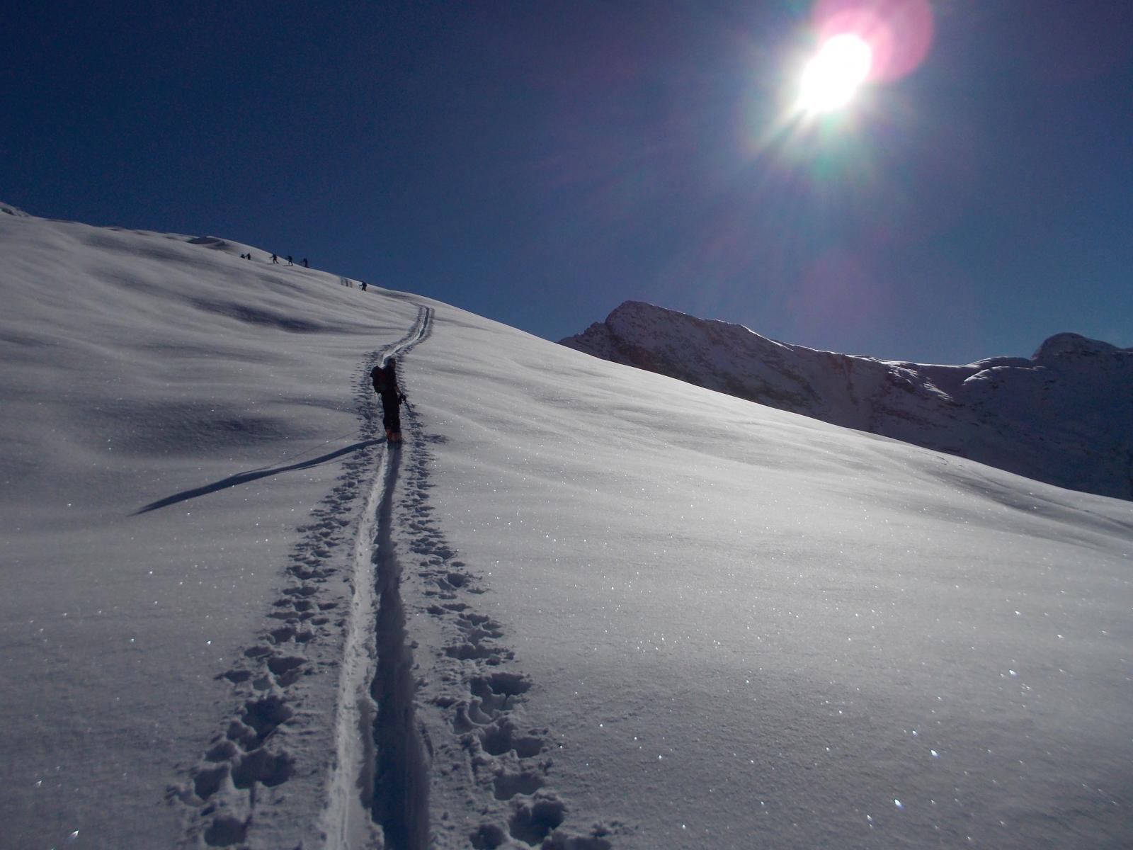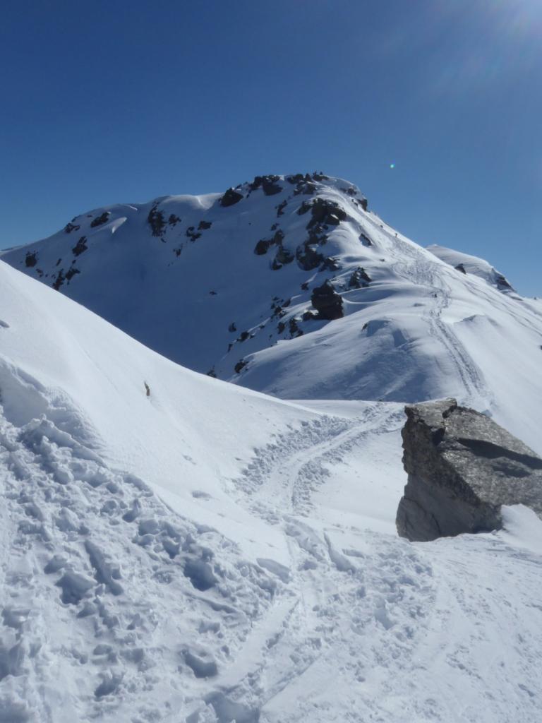 Qui svoltare a dx e continuare a salire per bei terreni verso SE, fino sotto la verticale della vetta. Per più ripidi pendii e qualche roccetta in breve alla sommità.
